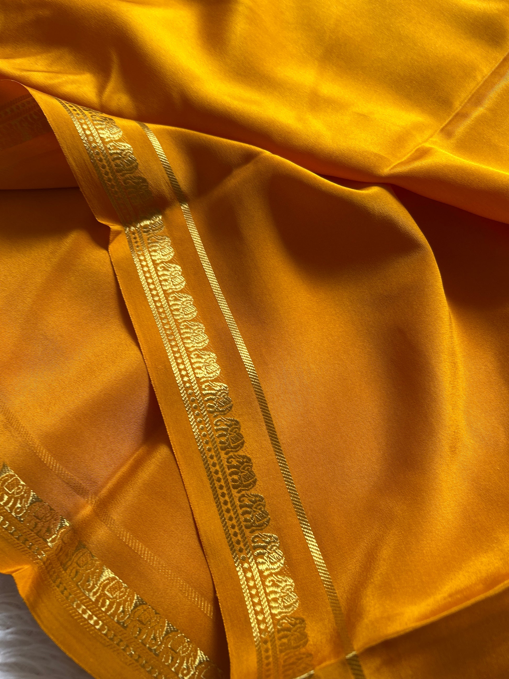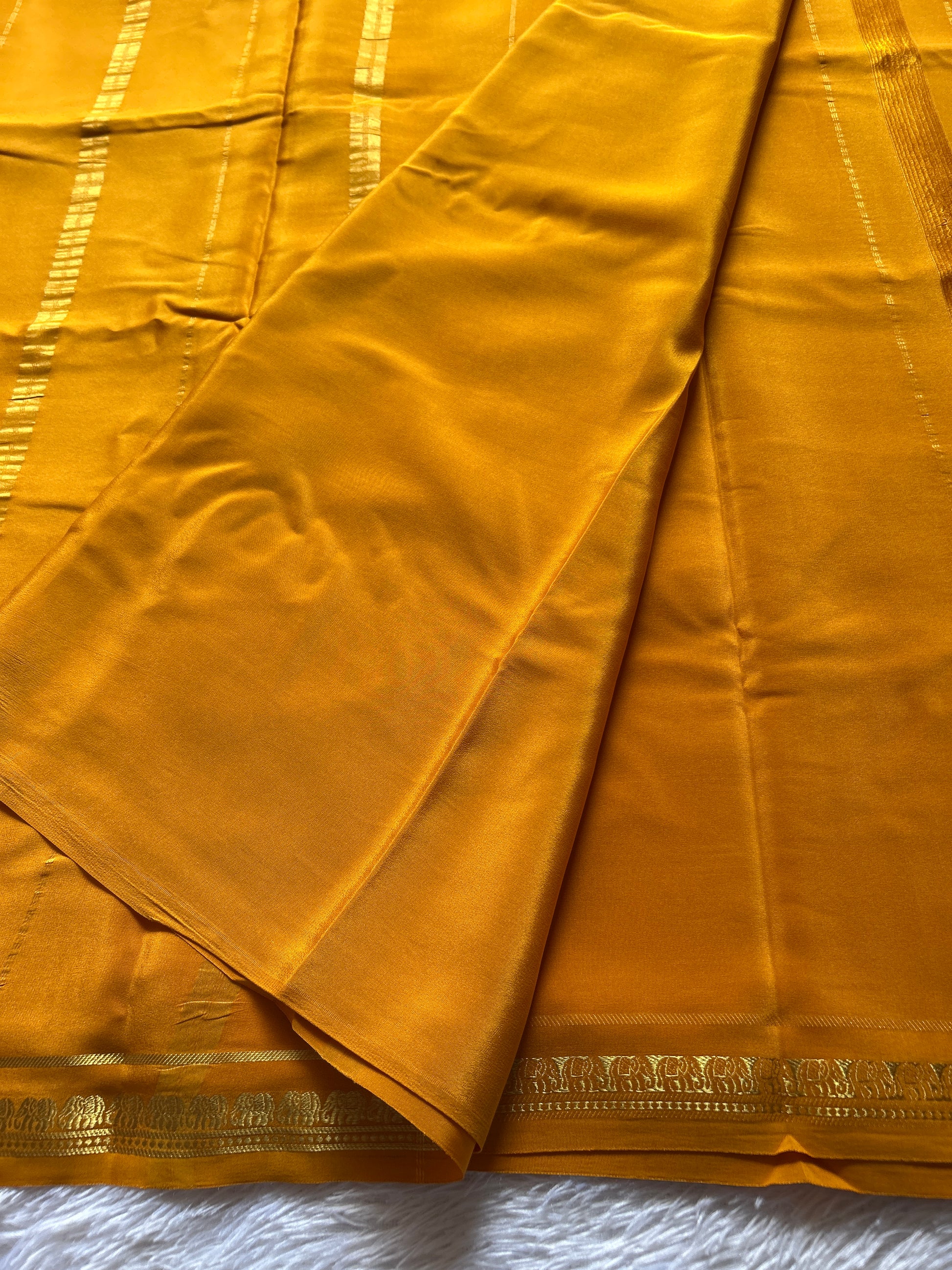 This Gowri solid golden yellow saree showcases the timeless elegance of pure Mysore silk, enhanced by its rich golden hue. Delicately woven with a fine gold zari border featuring an intricate elephant motif, it reflects traditional artistry with subtle sophistication. The pallu is adorned with understated gold zari work, adding a graceful shimmer that complements the overall design. Perfect for those who appreciate authentic craftsmanship combined with refined aesthetics.