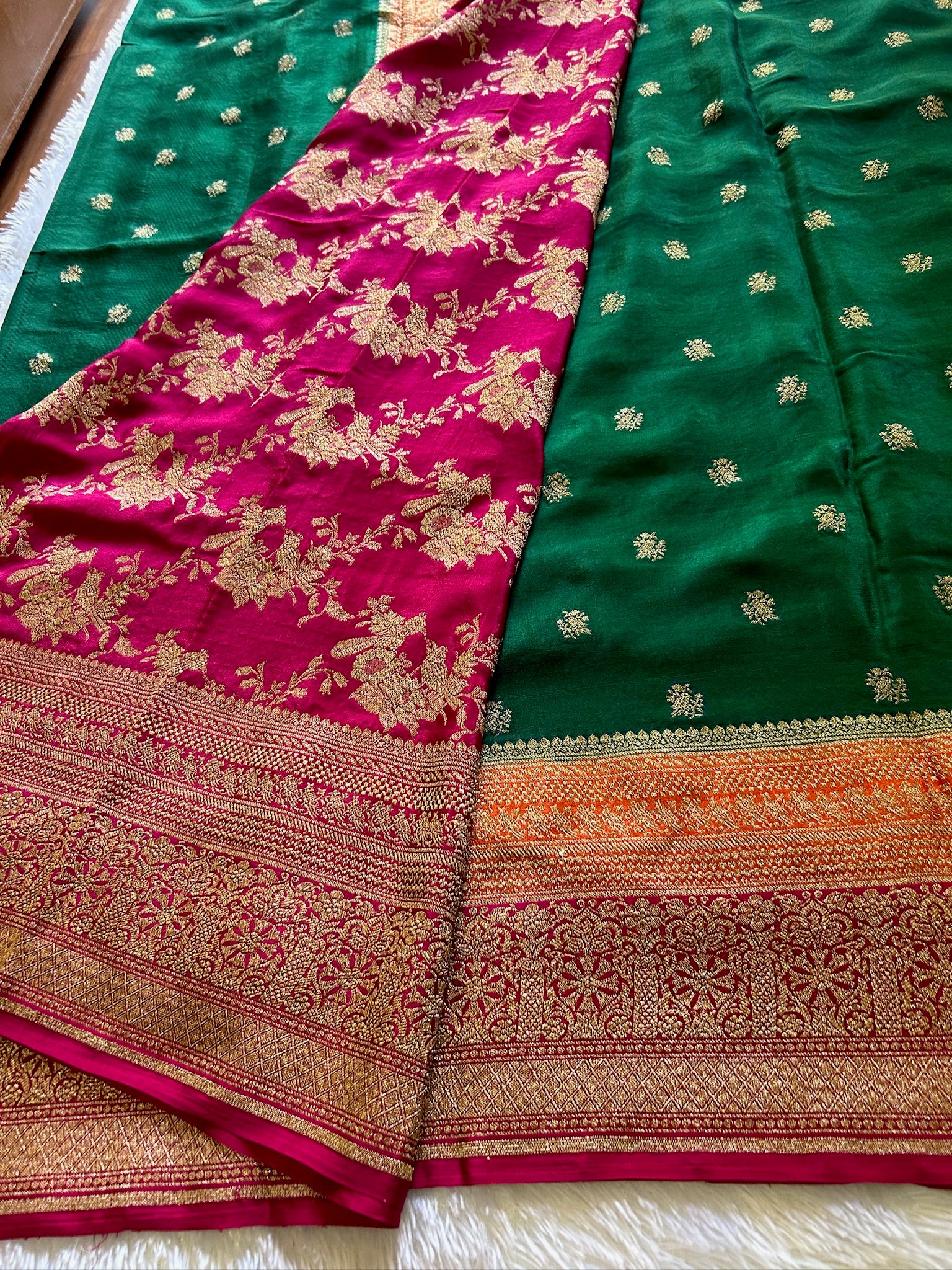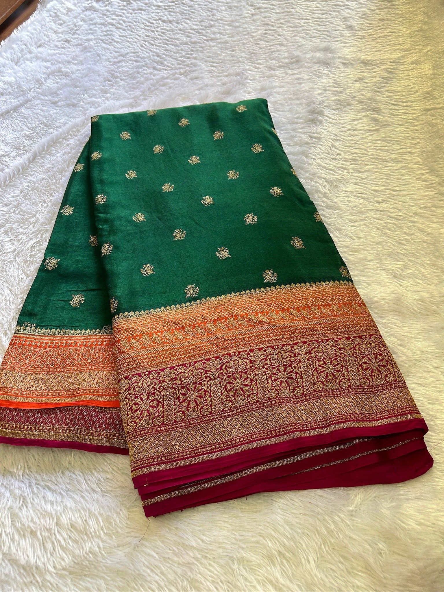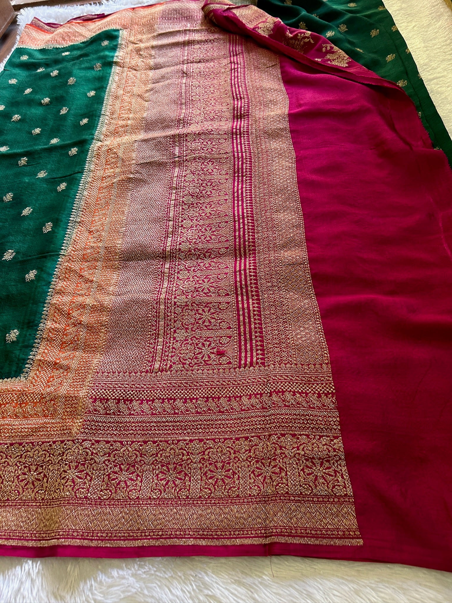This bottle green Banarasi pure crepe silk saree is adorned with small zari buttas throughout, showcasing intricate traditional Banarasi zari work on the pallu and border. It features an orange and pink border that enhances its rich texture. The set includes a pink blouse material embellished with matching border and zari detailing, reflecting expert craftsmanship and timeless elegance.