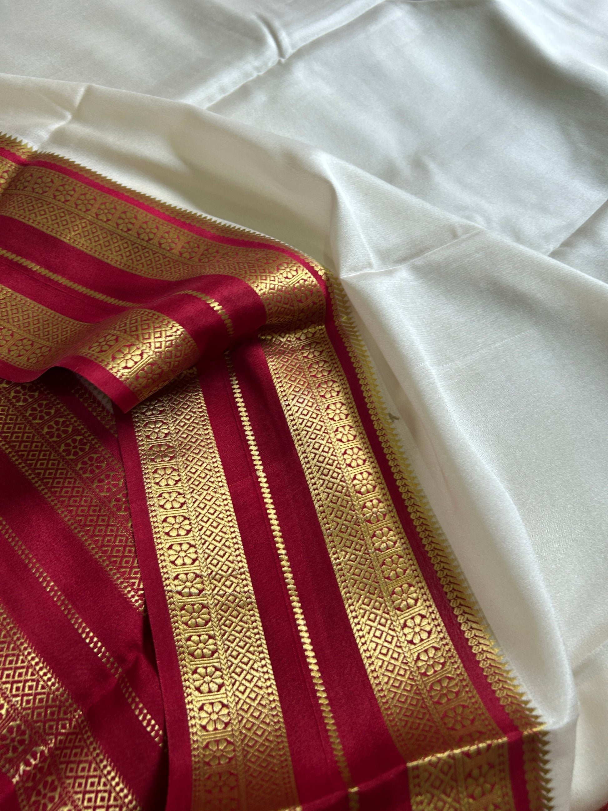 This off white Mysore pure crepe silk saree with maroon border features a traditional bentex border, adding a touch of heritage to the modern design. Made from pure crepe silk, this saree offers a luxurious feel and drapes beautifully, making it perfect for special occasions. Elevate your style with this elegant and timeless piece.