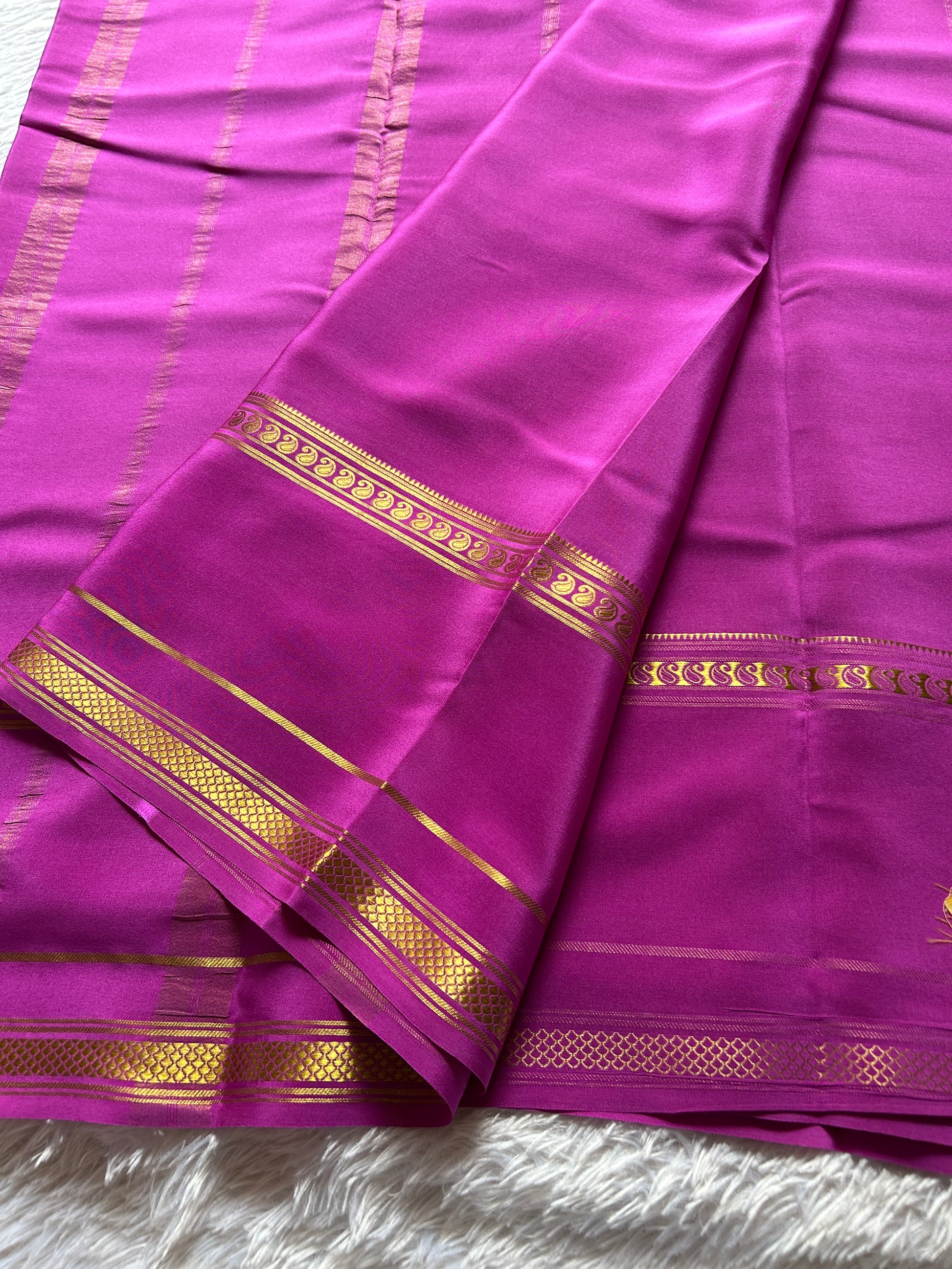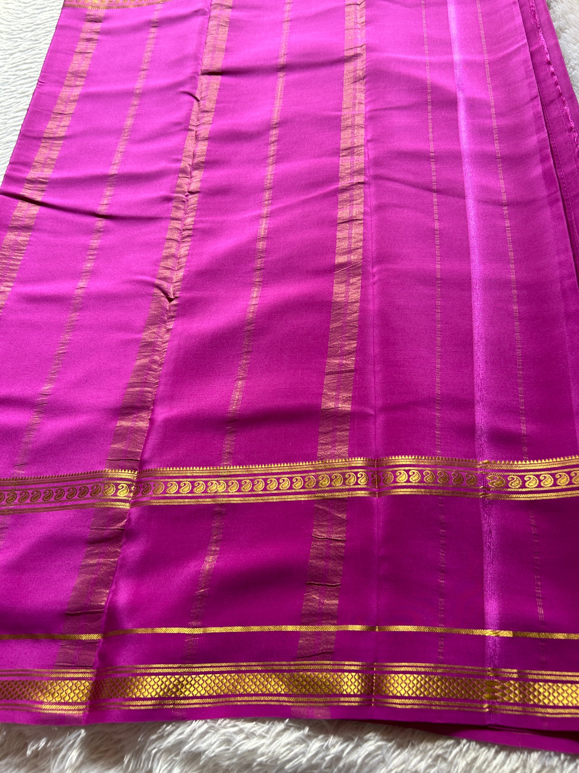 Crafted from premium 110 GSM pure Mysore crepe silk, this Guna saree features a vibrant bright magenta hue that radiates elegance. Its distinctive gap border is adorned with intricate zari work, showcasing expert craftsmanship that enhances its luxurious appeal. Ideal for those who appreciate refined tradition blended with bold color, this saree offers both comfort and timeless style.