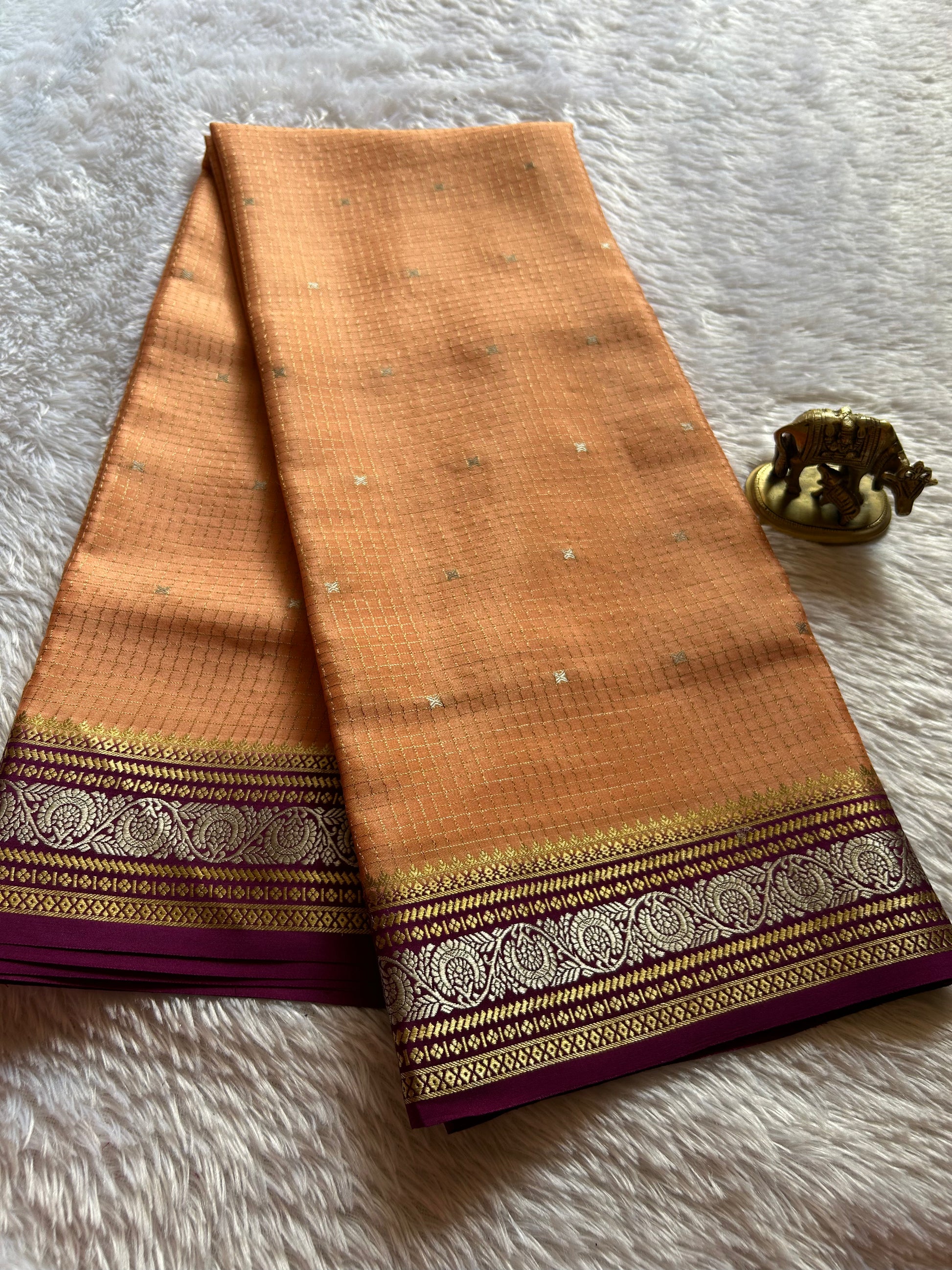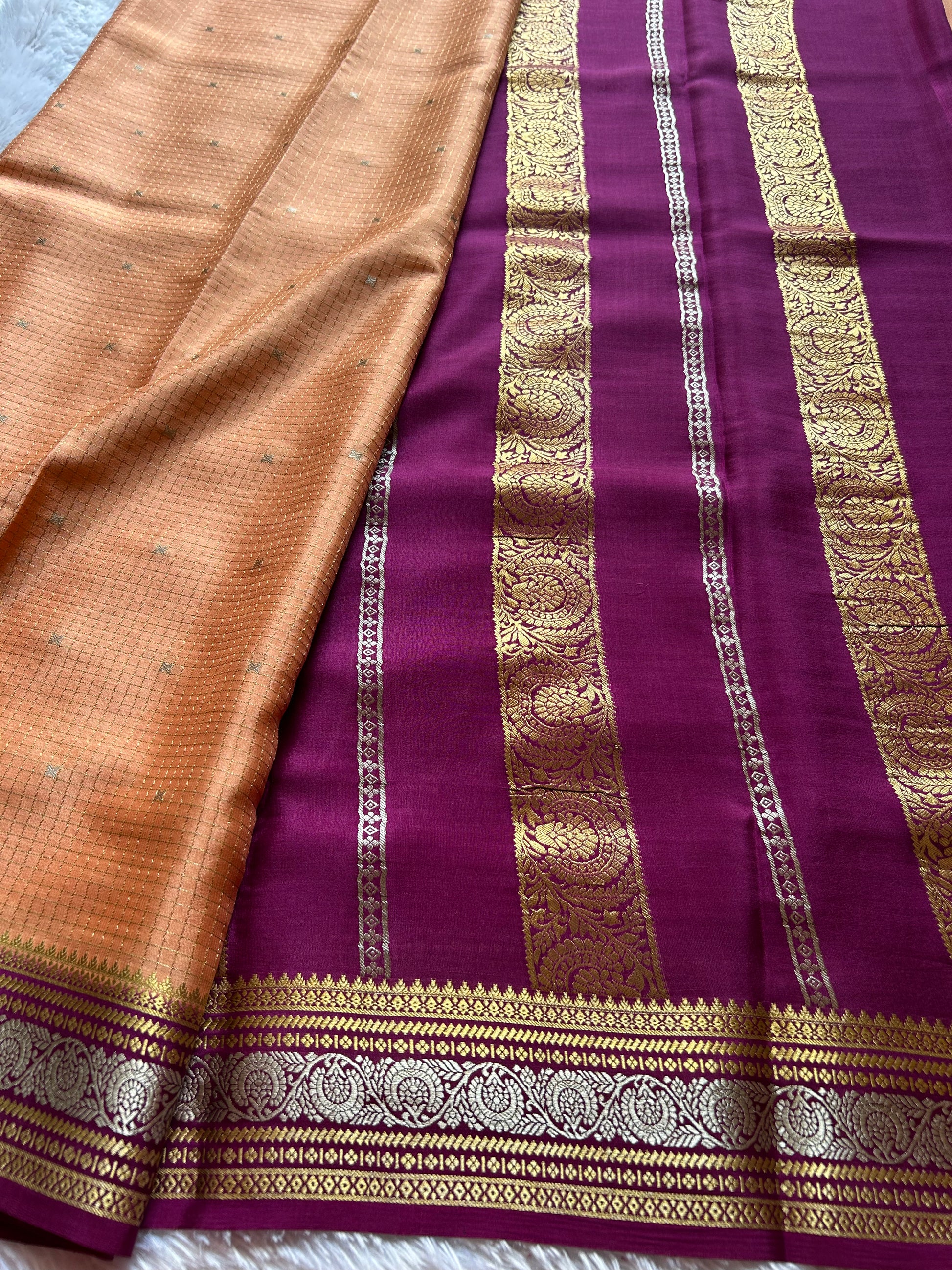 Discover the timeless elegance of our Haasini saree, a masterpiece woven in pure Mysore crepe silk. This exquisite light peach creation features delicate small zari checks and scattered buttas throughout, creating an intricate tapestry of traditional craftsmanship. The striking magenta border adorned with ornate zari floral motifs elevates the piece with understated luxury. At 110 GSM, this saree offers the perfect balance of drape and durability, making it an ideal choice for both festive occasions and refined everyday wear. A sophisticated addition to any saree collection.