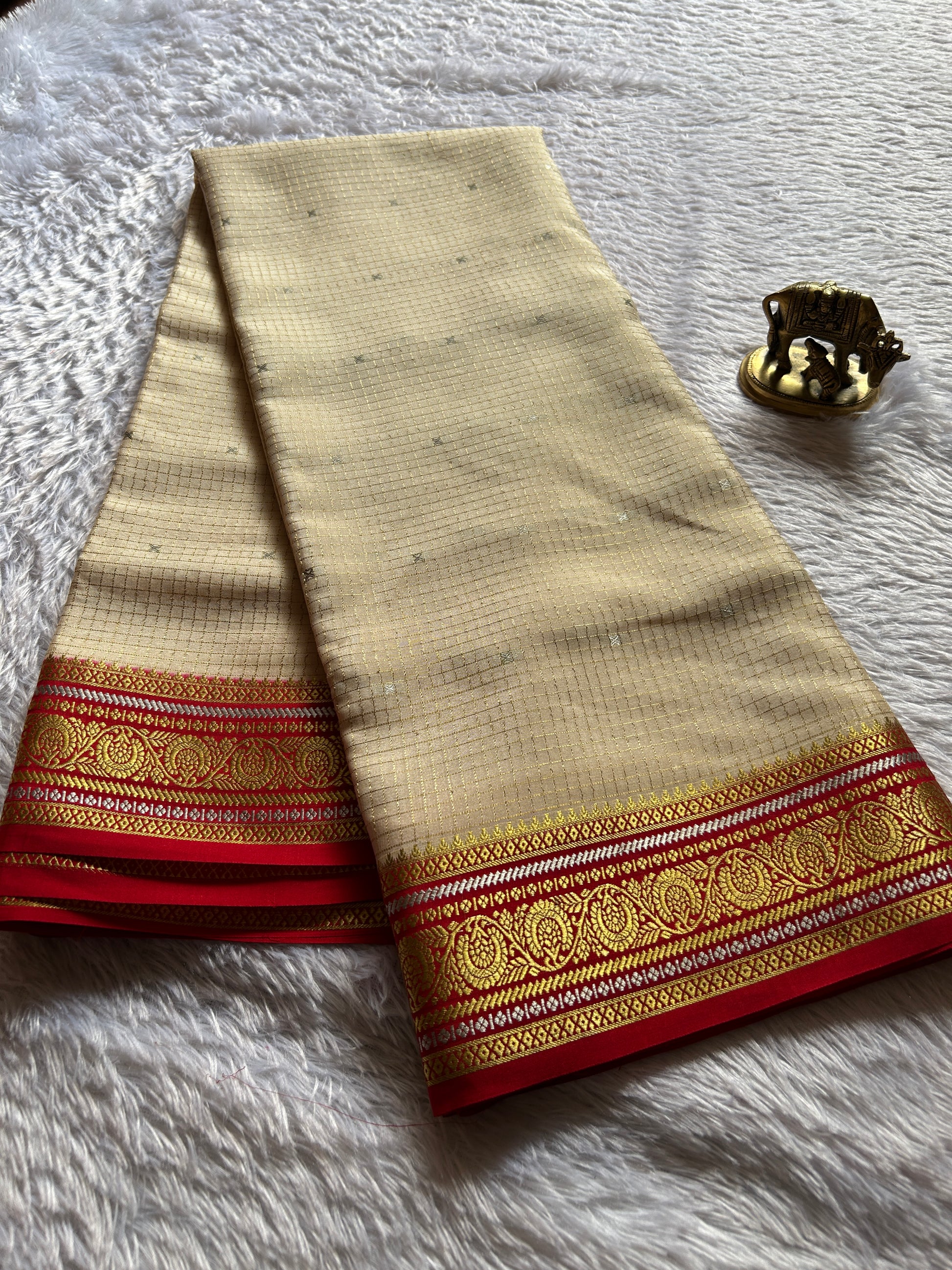 Elegant off-white Mysore crepe silk saree featuring delicate zari checks and scattered buttas throughout the fabric. Complemented by a striking red border with luxurious zari work, this saree combines traditional craftsmanship with timeless appeal. Perfect for special occasions or festive celebrations.