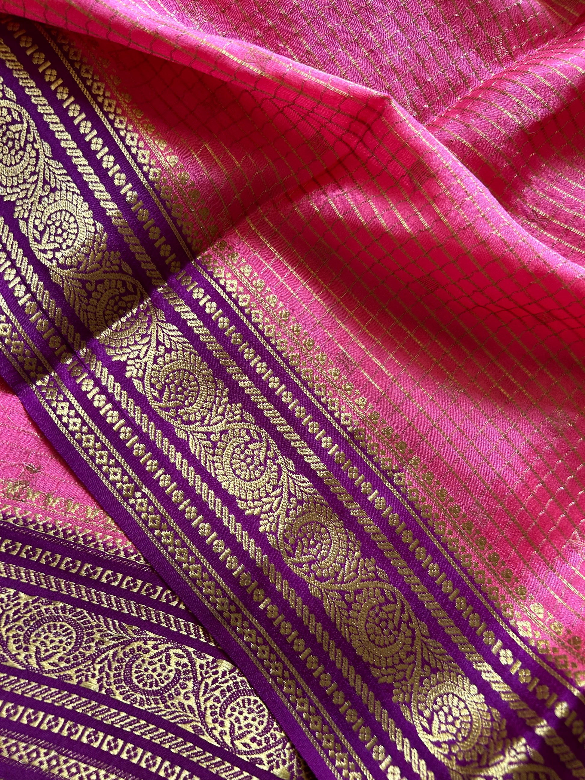 Haasini (2D) showcases the timeless elegance of pure Mysore crepe silk at 110 GSM, a fabric renowned for its fluid drape and subtle lustre. The peach pink base features an intricate small zari check pattern distributed throughout, creating refined texture and visual interest. A striking magenta border frames the piece with elaborate classical floral zari work, combining traditional craftsmanship with sophisticated design. This saree balances contemporary aesthetics with heritage weaving techniques, ideal for those who appreciate nuanced colour palettes and meticulous detailing in their ethnic wear.