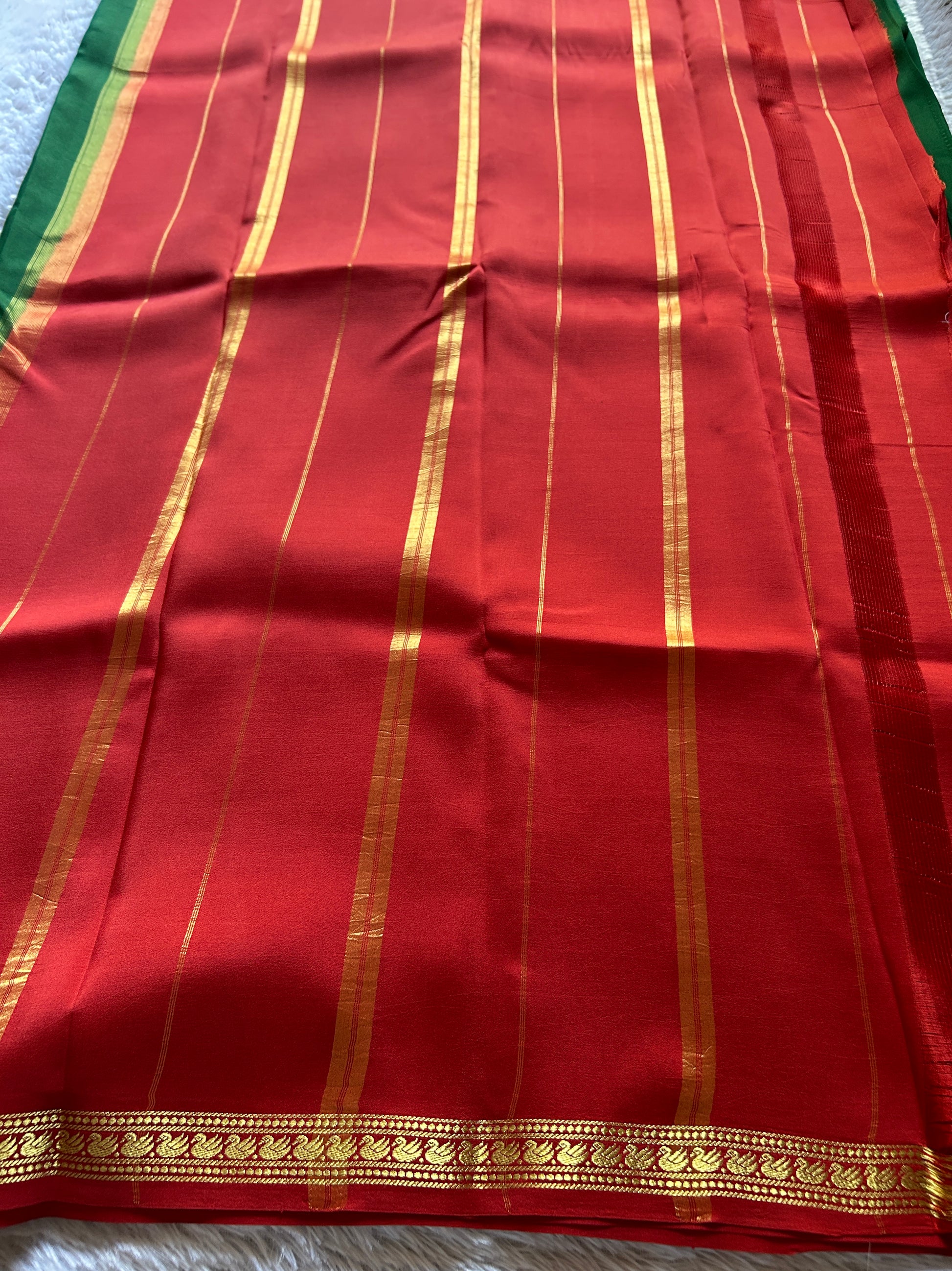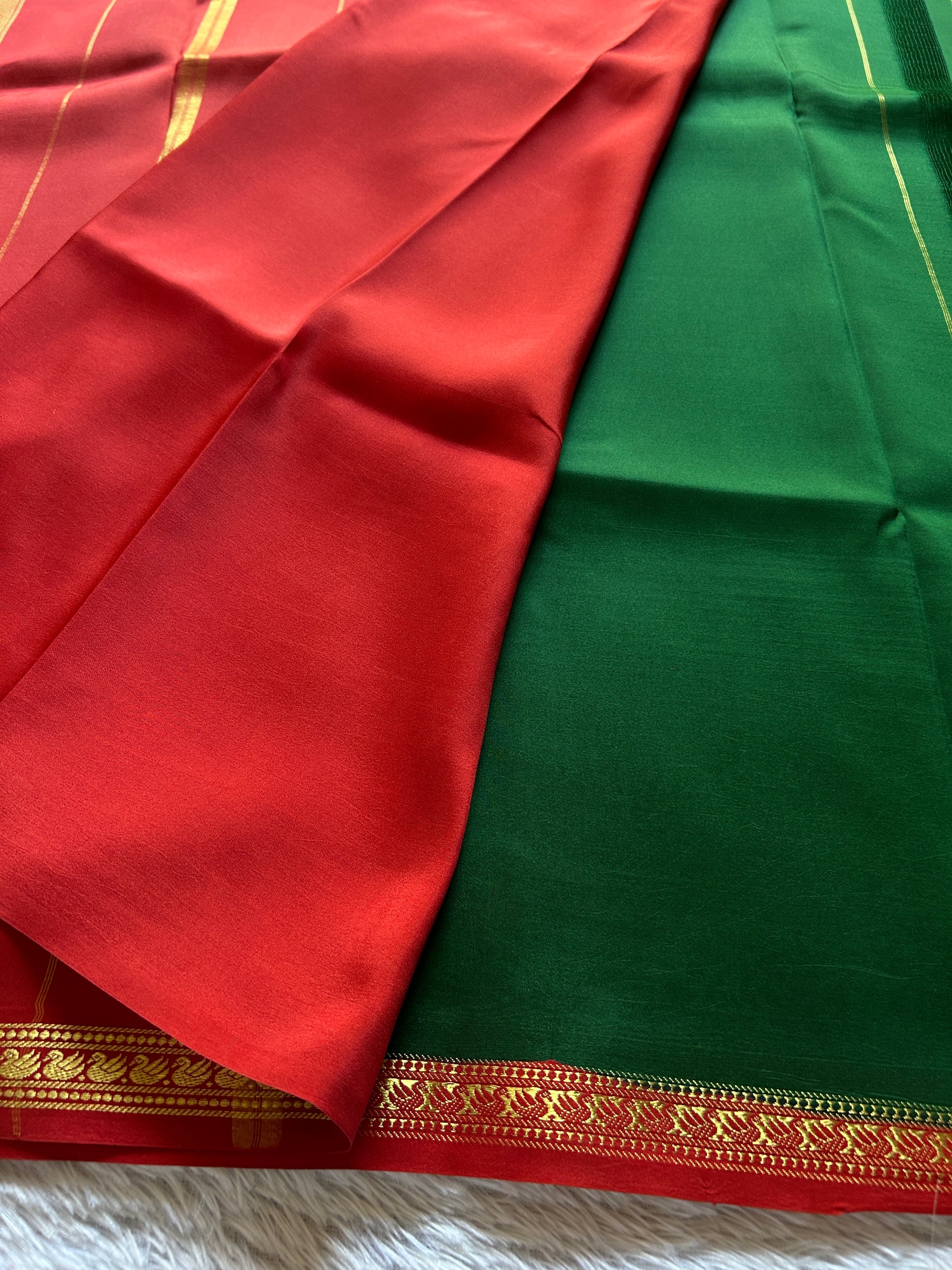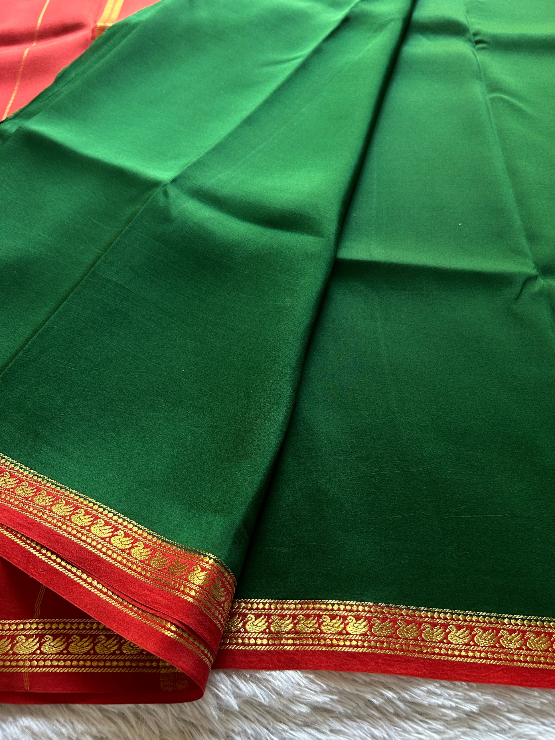 This bottle green pure Binny crepe silk saree represents a masterclass in traditional textile artistry. A slender red border is adorned with exquisite pure gold zari swan motifs, while the crimson pallu features graceful pure gold zari linework. The composition of deep jewel tones paired with lustrous metallic embellishment creates a sophisticated silhouette, ideal for those who appreciate authentic craftsmanship and timeless elegance.