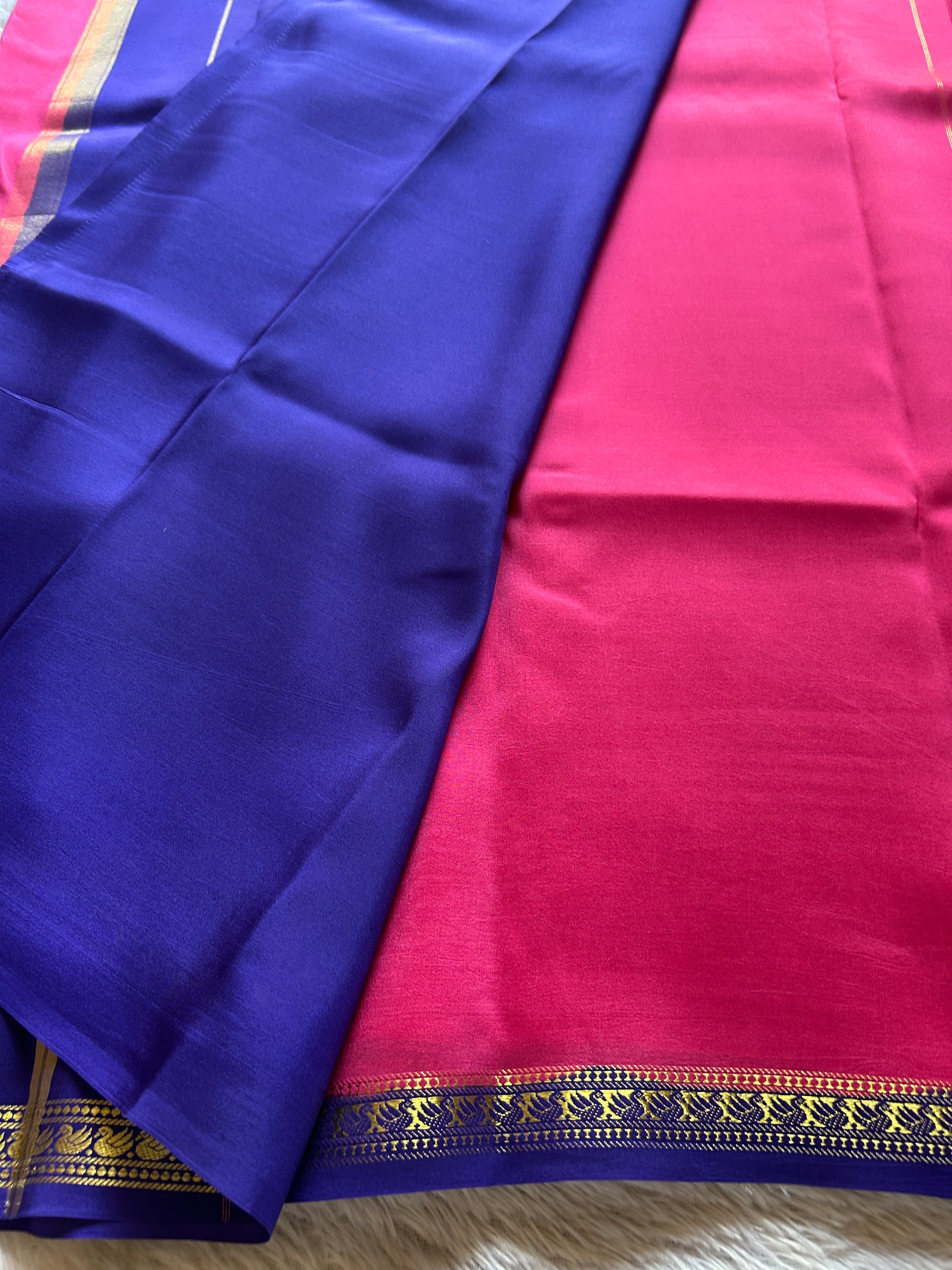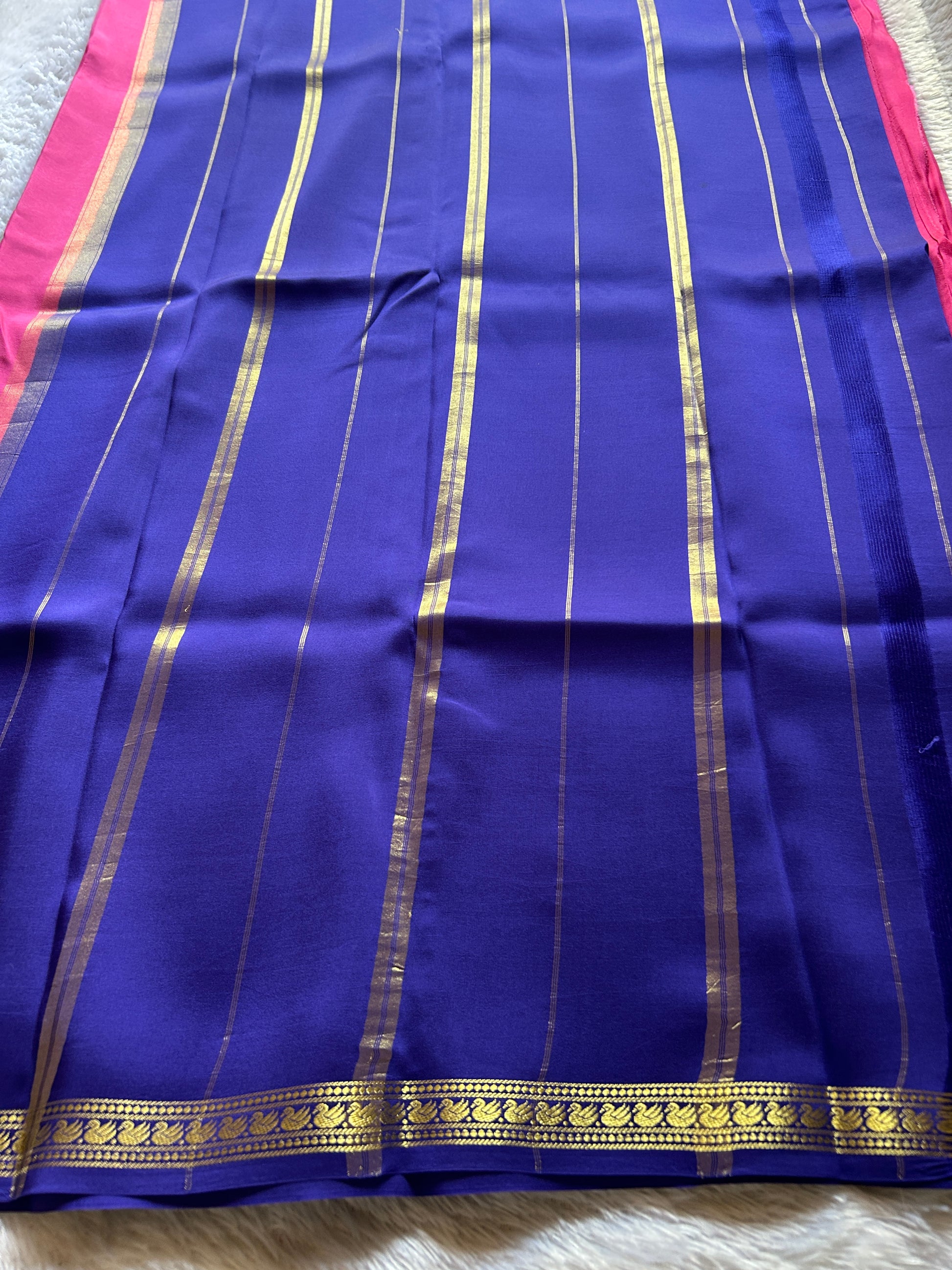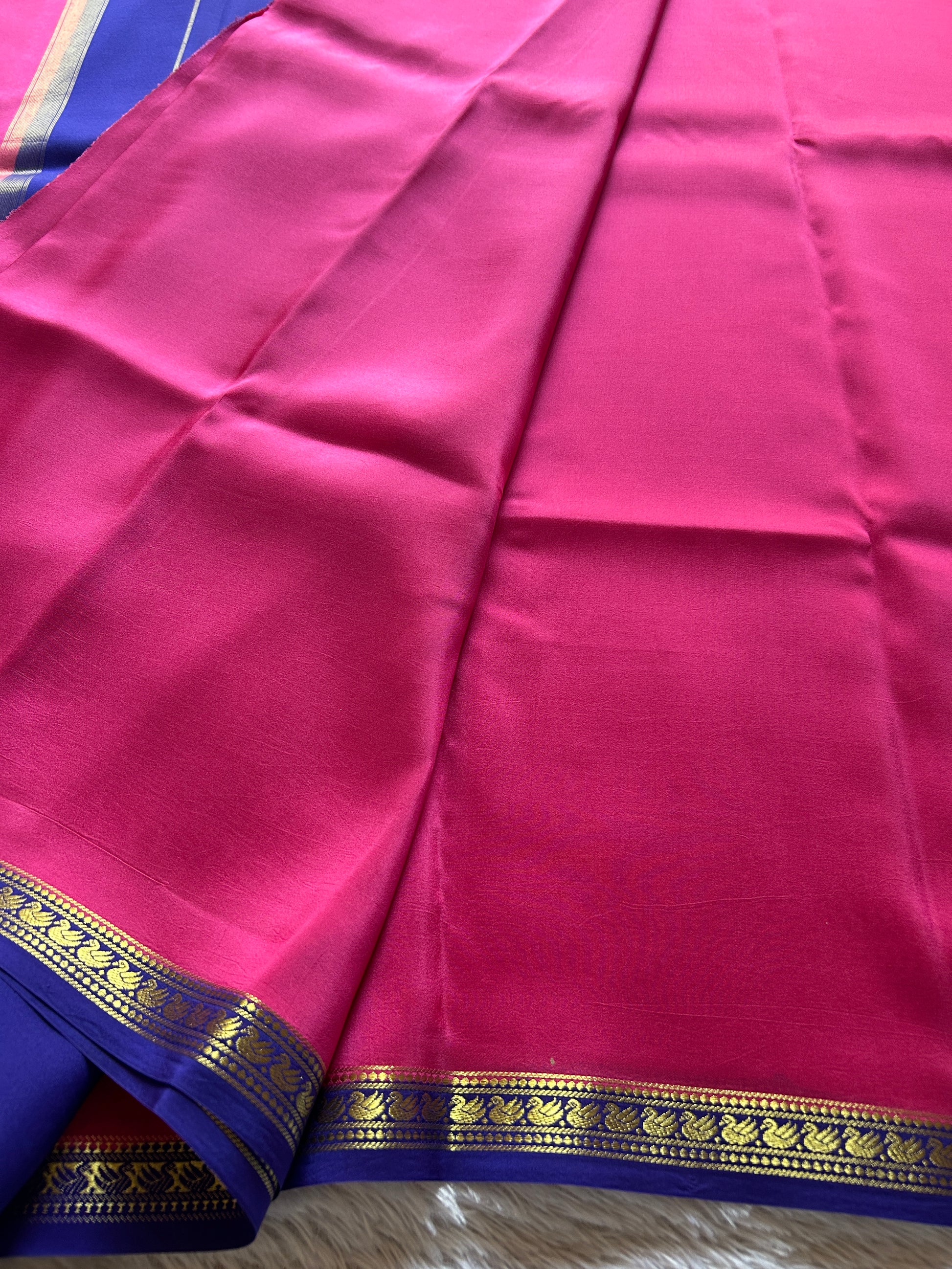 Elevate your collection with this striking hot pink pure Binny crepe silk saree, a masterpiece of traditional craftsmanship. The luxurious fabric drapes beautifully, offering comfort and sophistication for any occasion. A refined royal blue border features an exquisite pure gold zari swan motif—a symbol of grace and elegance. The rich royal blue pallu is adorned with intricate pure gold zari lines that catch light with every movement, creating a captivating interplay of color and shimmer. This saree seamlessly blends contemporary vibrancy with timeless artisanal detail, making it an essential addition for those who appreciate refined Indian textiles.