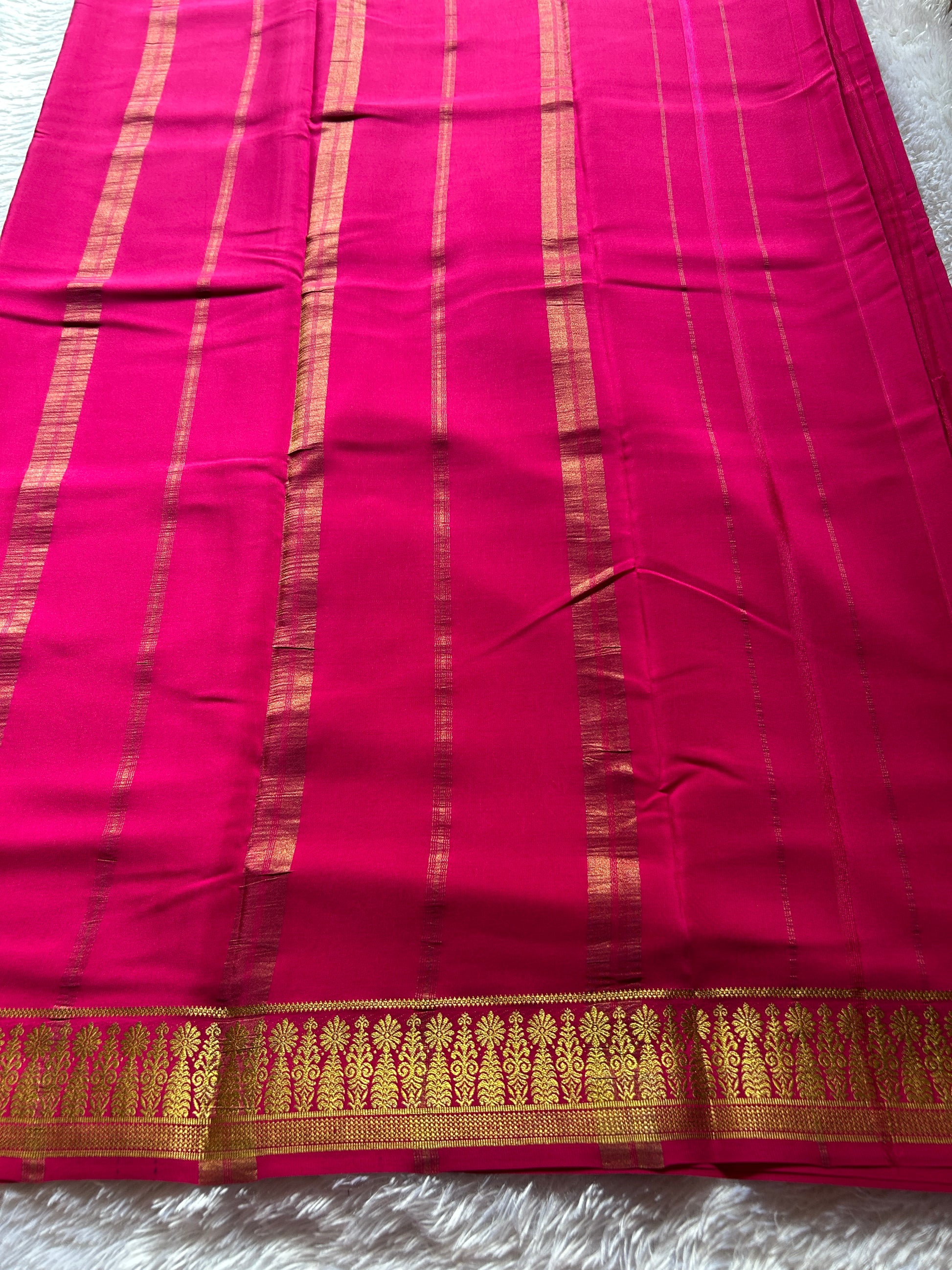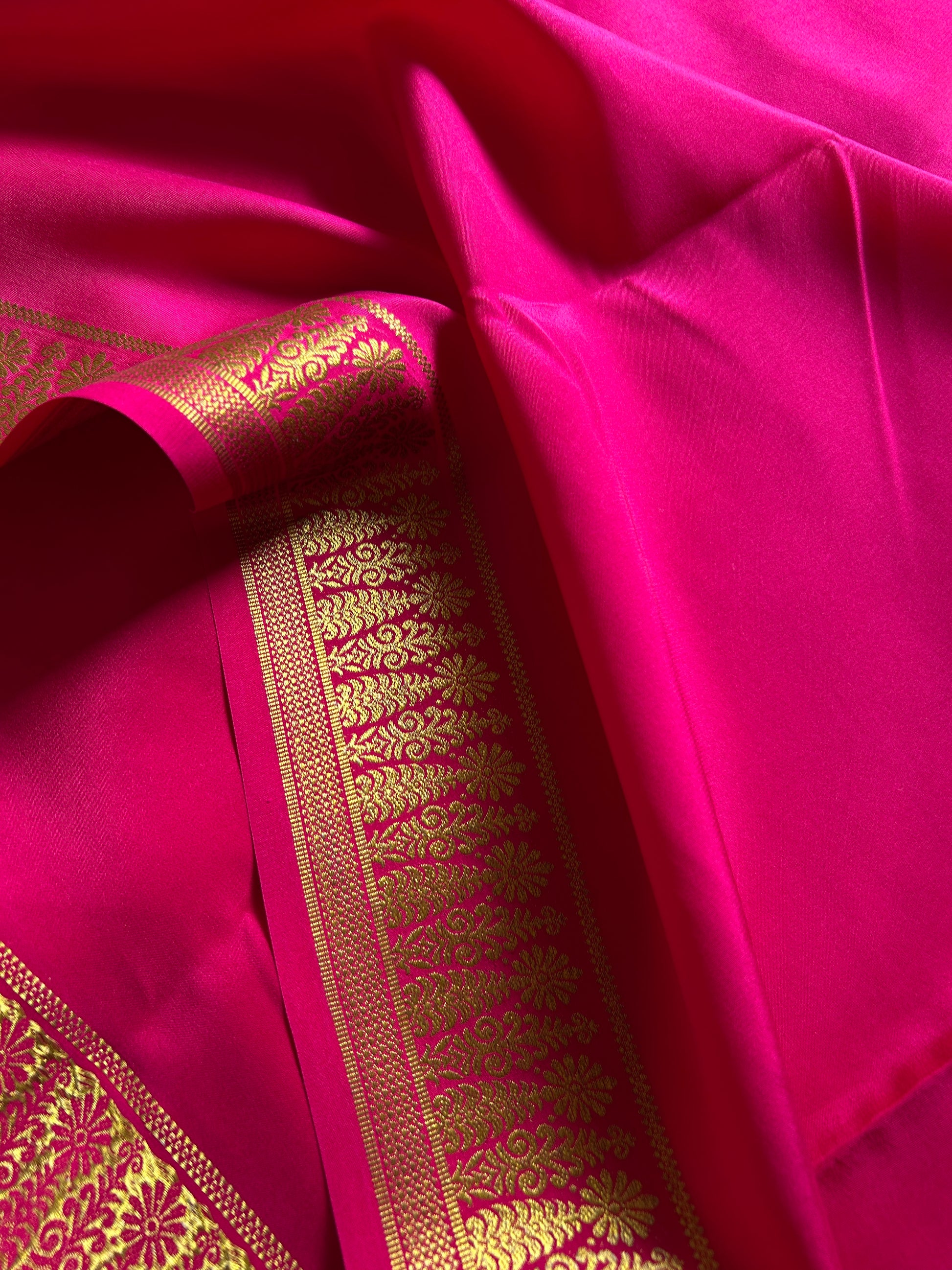 The Hombale Solid Pink saree is of pure Mysore crepe silk at 110 GSM, offering a delicate yet durable fabric with a graceful fall. Its traditional motif zari border showcases exquisite craftsmanship, reflecting cultural heritage while elevating the saree’s elegance. Ideal for discerning connoisseurs seeking a blend of comfort and classic style, this saree promises both sophistication and timeless appeal.