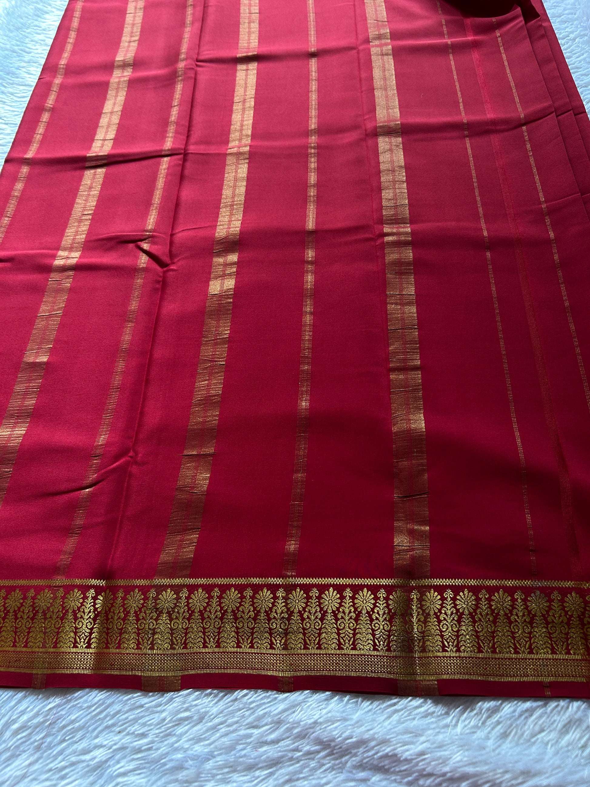 The Hombale Solid Red saree is crafted from premium pure Mysore crepe silk weighing 110 GSM, ensuring a soft, comfortable, and breathable wear. Its traditional motif zari border adds a touch of timeless elegance, reflecting expert craftsmanship and cultural heritage. Perfect for formal and festive occasions, this saree combines durability with graceful draping for a sophisticated look.