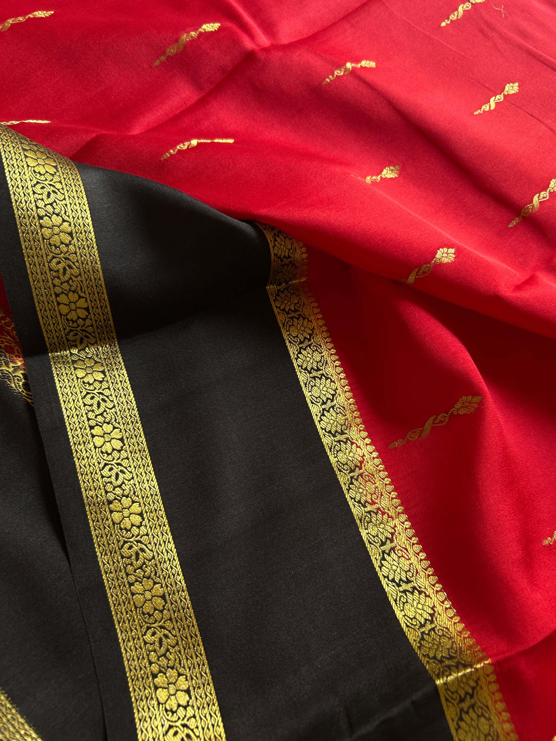 Elevate your collection with this exquisite Jayashri saree, crafted from pure Mysore silk renowned for its lustrous finish and luxurious drape. The rich red base features delicate floral buttas scattered throughout, creating an understated elegance. A striking black gap border frames the pallu, which showcases intricate zari work that catches light beautifully. This timeless piece seamlessly transitions from festive occasions to formal gatherings, offering the refined sophistication that defines authentic South Indian silk sarees.