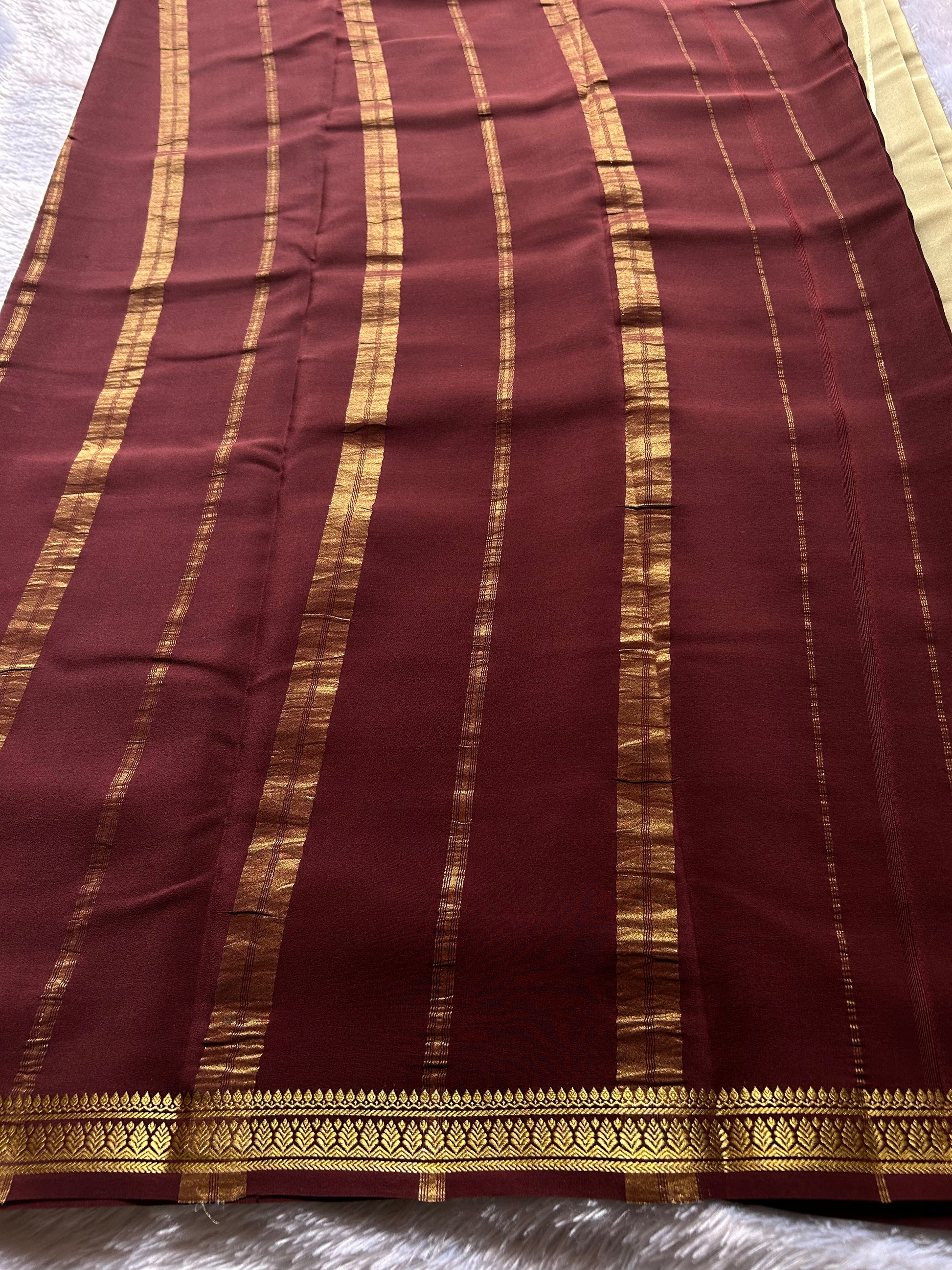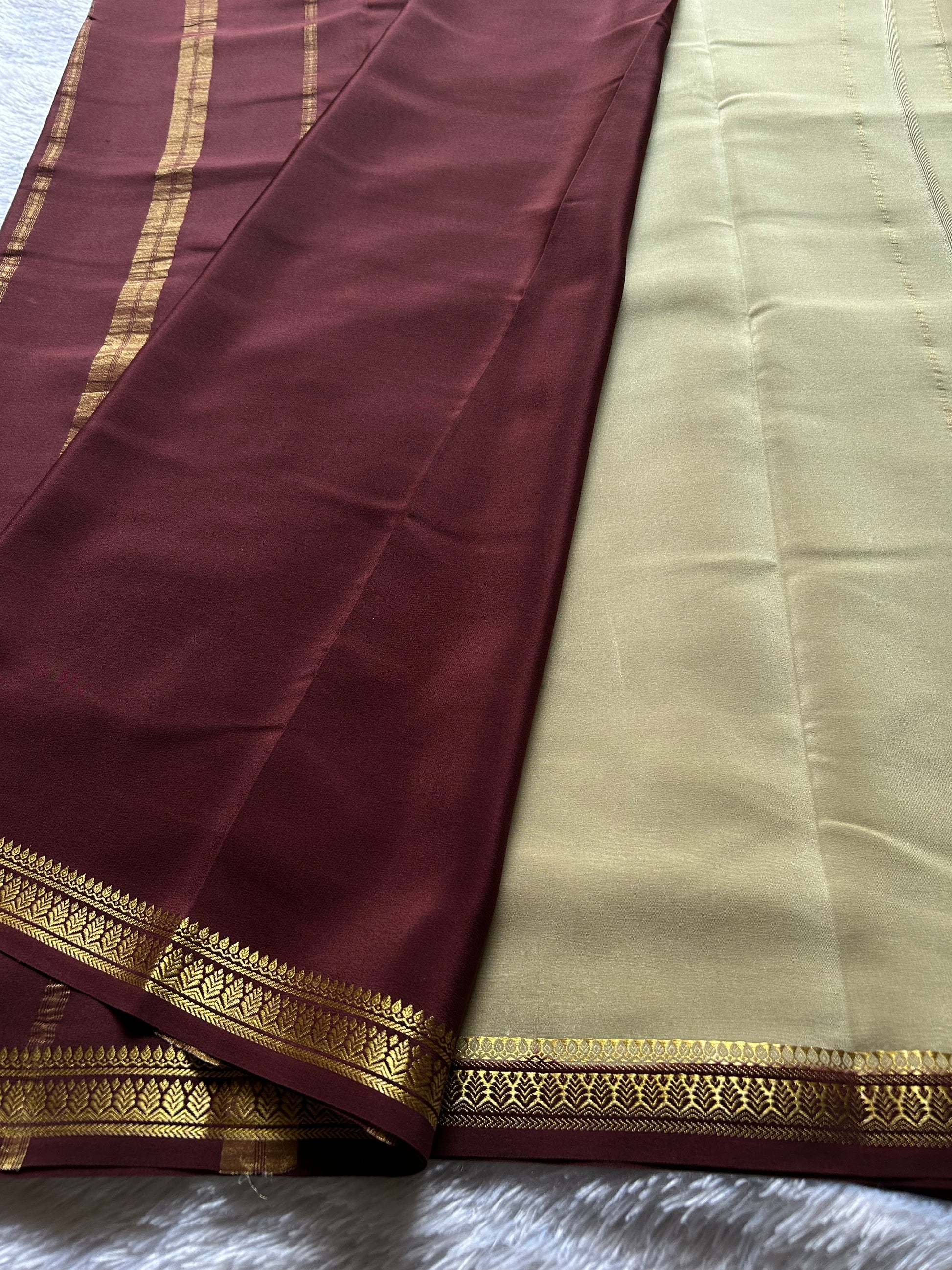 Elevate your ethnic wardrobe with this exquisite Mysore crepe silk saree, crafted from premium 100 GSM with pure Copper Silver Silk. The serene beige base is complemented by a striking chocolate brown border adorned with intricate CSS zari work that showcases traditional artisanal craftsmanship. The lightweight crepe silk drapes beautifully while maintaining its structure, making it ideal for both festive occasions and refined everyday wear. The sophisticated color palette and detailed zari embellishments create a timeless piece that seamlessly blends classical elegance with contemporary sensibility.