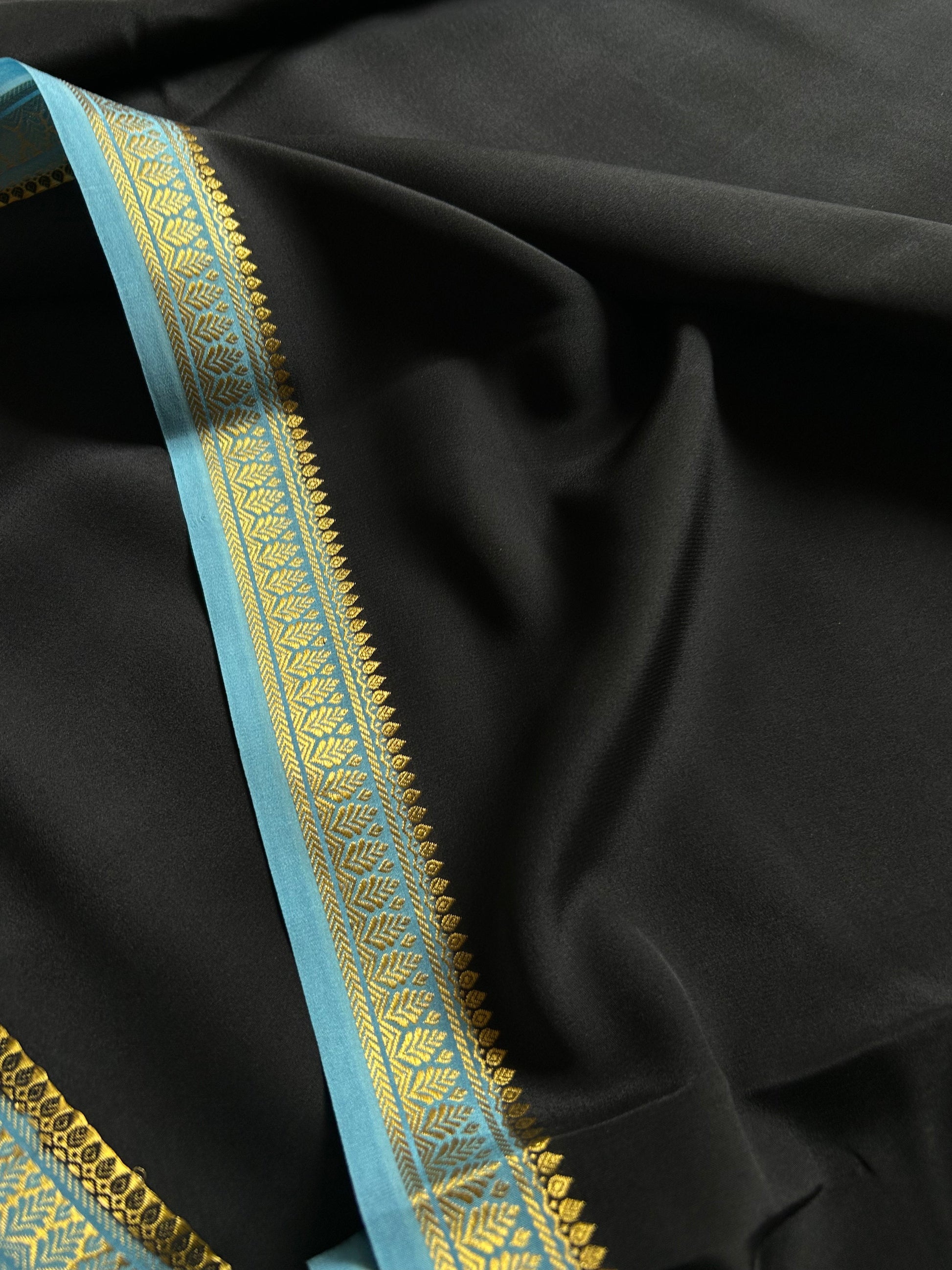 Elevate your collection with this sophisticated black Mysore crepe silk saree, crafted from premium 100 GSM pure silk blended with copper and silver tones. The fabric drapes beautifully with an understated elegance, while the light blue border features intricate CSS zari embroidery that catches light with every movement. This timeless piece combines traditional weaving techniques with refined aesthetics, making it ideal for both festive occasions and formal gatherings. The contrast between the deep black base and delicate blue border creates a striking visual appeal that transcends seasonal trends.
