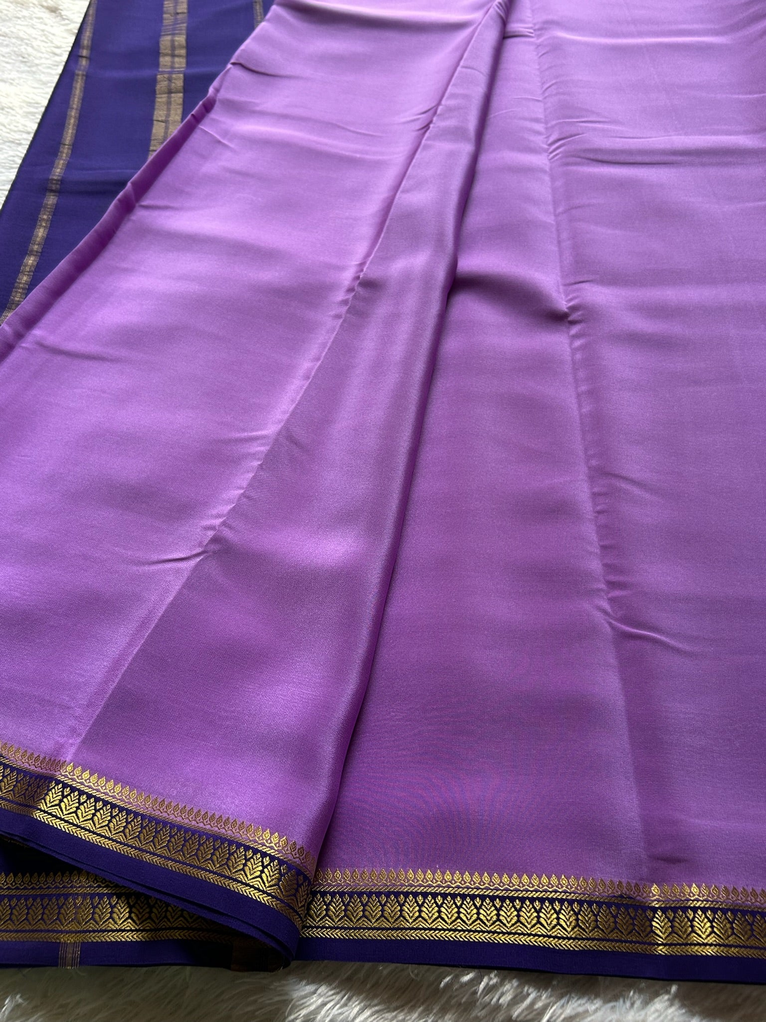 This Mysore crepe silk saree of 100 GSM showcases a refined lavender body paired with a striking navy blue border and pallu. The copper-silver silk zari embellishment elevates the design with intricate detailing that reflects light beautifully. Crafted from pure Mysore silk, the fabric offers a luxurious drape and natural sheen characteristic of premium crepe weaves. The sophisticated color palette and traditional zari work make this piece a versatile choice for weddings, festivals, and formal occasions where timeless elegance is paramount.