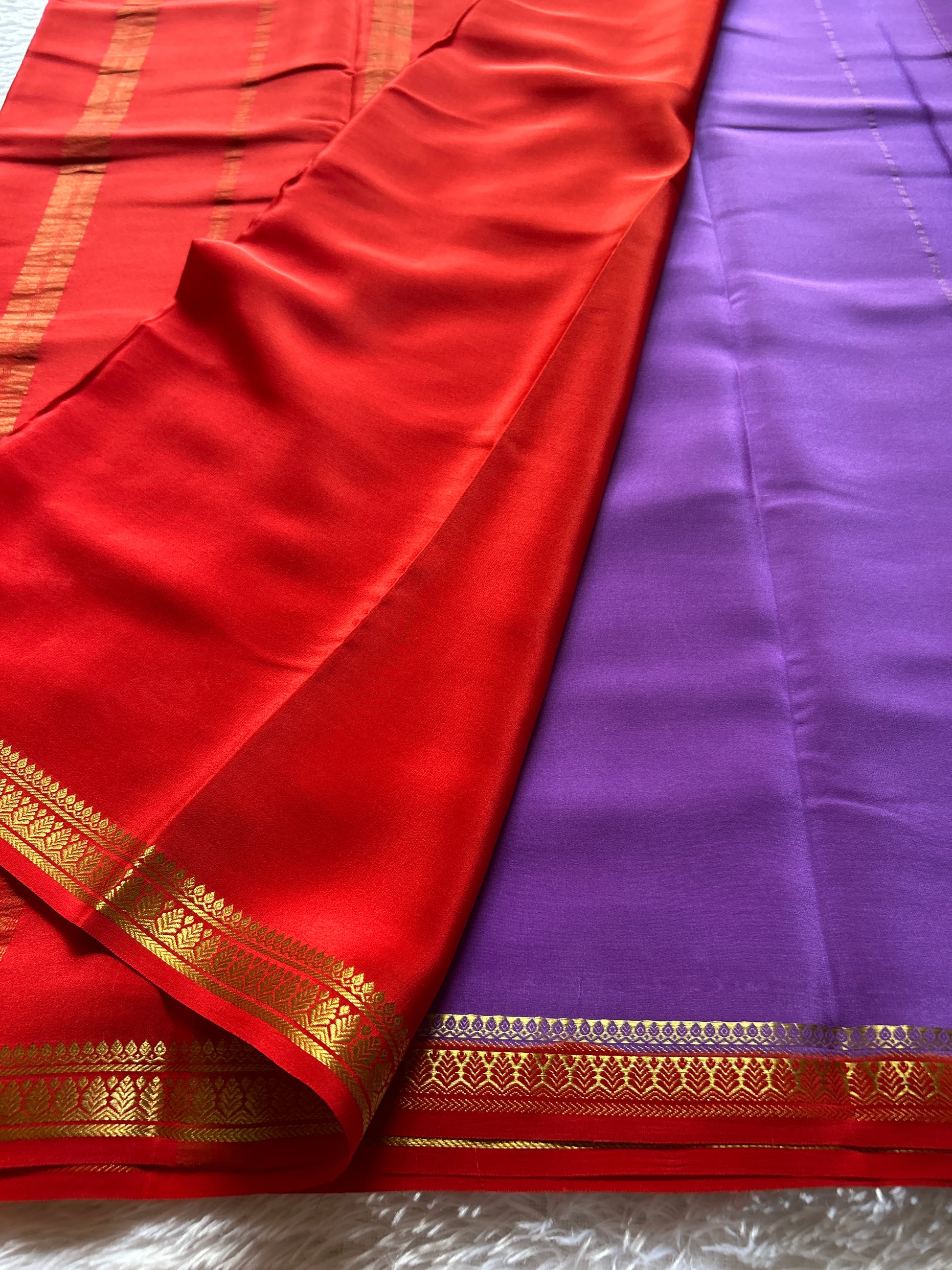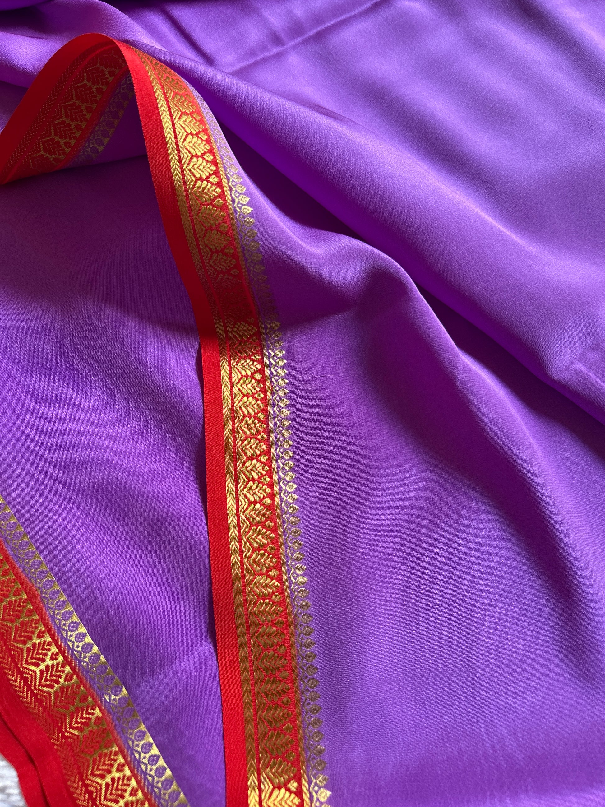 Elevate your collection with this sophisticated dark lavender Mysore crepe silk saree, crafted from premium 100 GSM pure silk for a refined drape and luxurious feel. The striking red border and pallu are enriched with intricate copper-silver silk zari work, creating a striking contrast that commands attention. The delicate interplay of traditional craftsmanship and contemporary color palette makes this piece versatile for both festive occasions and refined celebrations. Perfect for those who appreciate understated elegance with meticulous detailing.