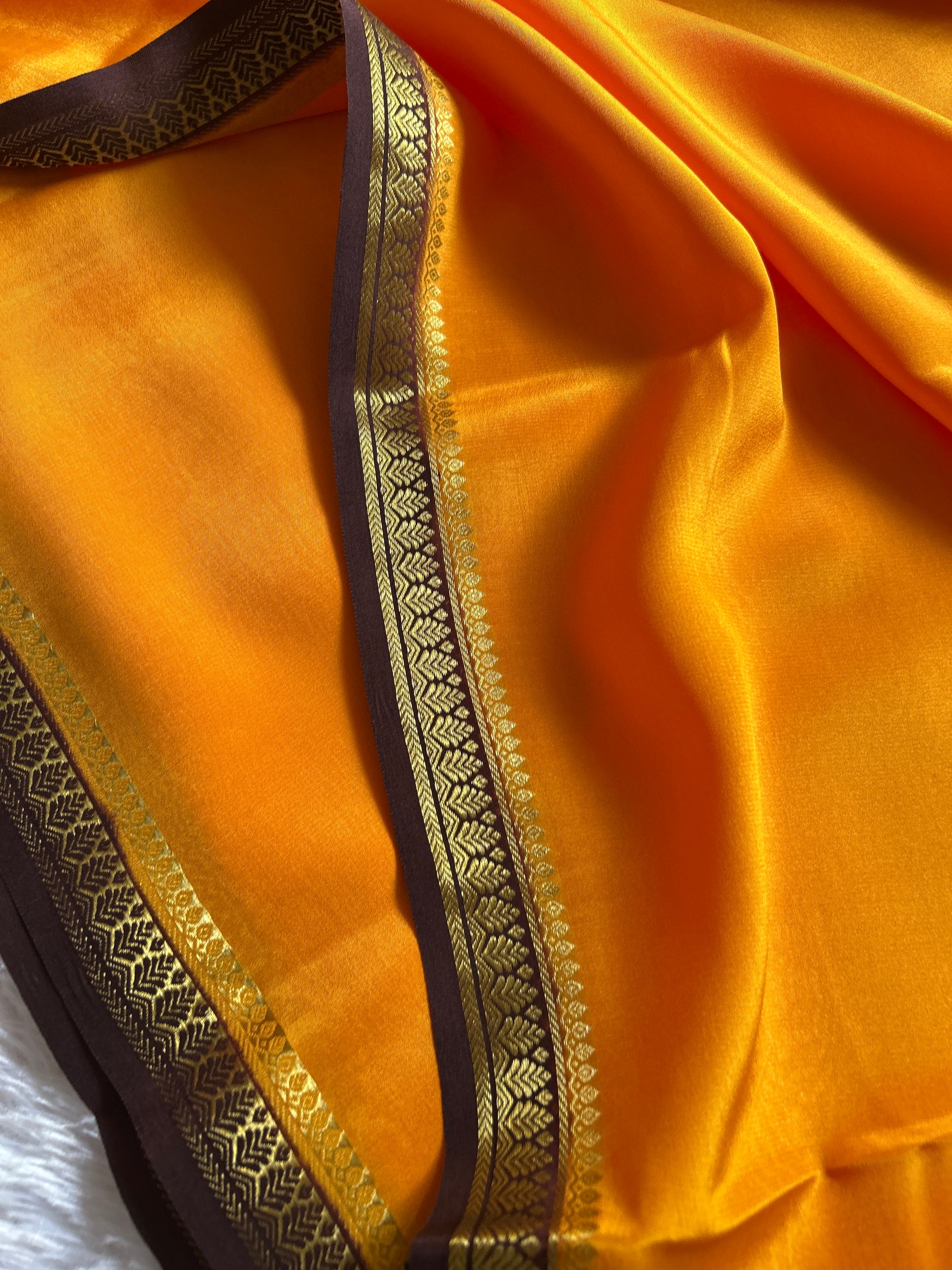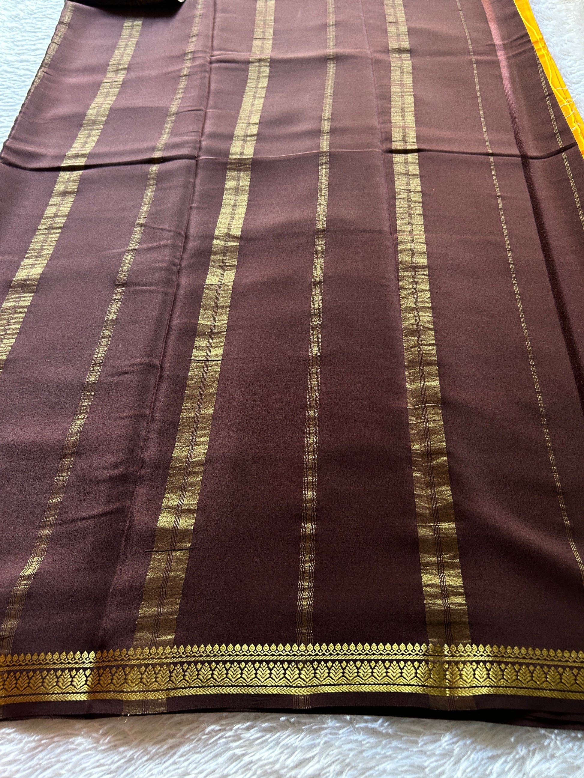 Jyothi (2D) features a radiant golden yellow pure Mysore crepe silk saree, engineered at 100 GSM for superior drape and movement. The deep brown border and pallu showcase intricate copper-silver silk (CSS) zari detailing, establishing a refined chromatic balance that enhances its classical sophistication. This expertly constructed piece merges premium silk craftsmanship with ornate metallic embroidery, positioning it as an exemplary choice for those seeking understated luxury and timeless elegance for momentous celebrations.