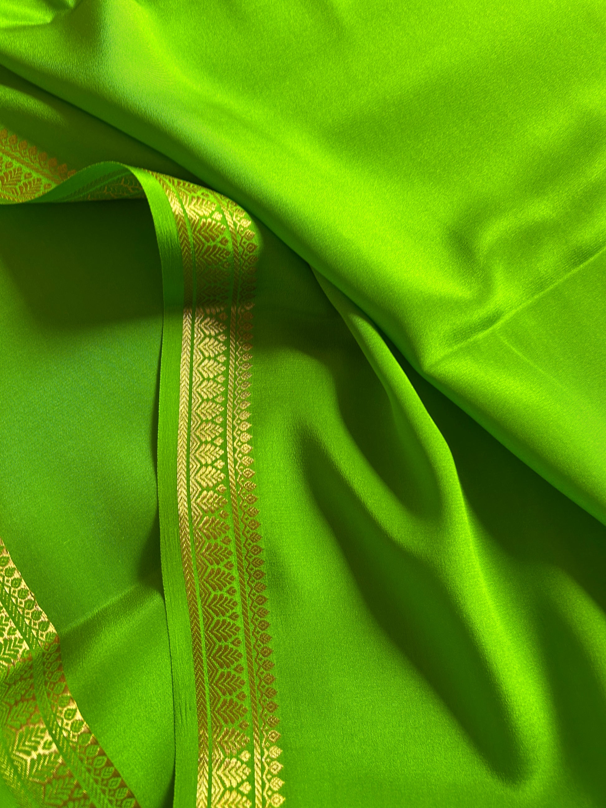 Elevate your collection with this striking lime green Mysore crepe silk saree, crafted from premium 100 GSM fabric that drapes with refined elegance. The saree features an exquisite zari border and pallu adorned with intricate copper-silver silk (CSS) zari work, creating a luminous interplay of metallic tones against the vibrant base. The crepe texture adds subtle dimension while maintaining the luxurious feel characteristic of authentic Mysore silk. Perfect for festive occasions and celebrations, this piece seamlessly blends contemporary color with traditional craftsmanship, making it an essential addition to any discerning wardrobe.