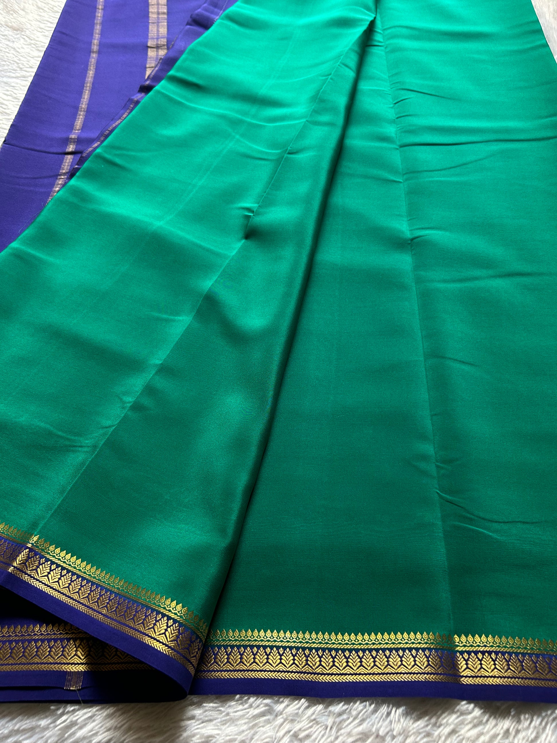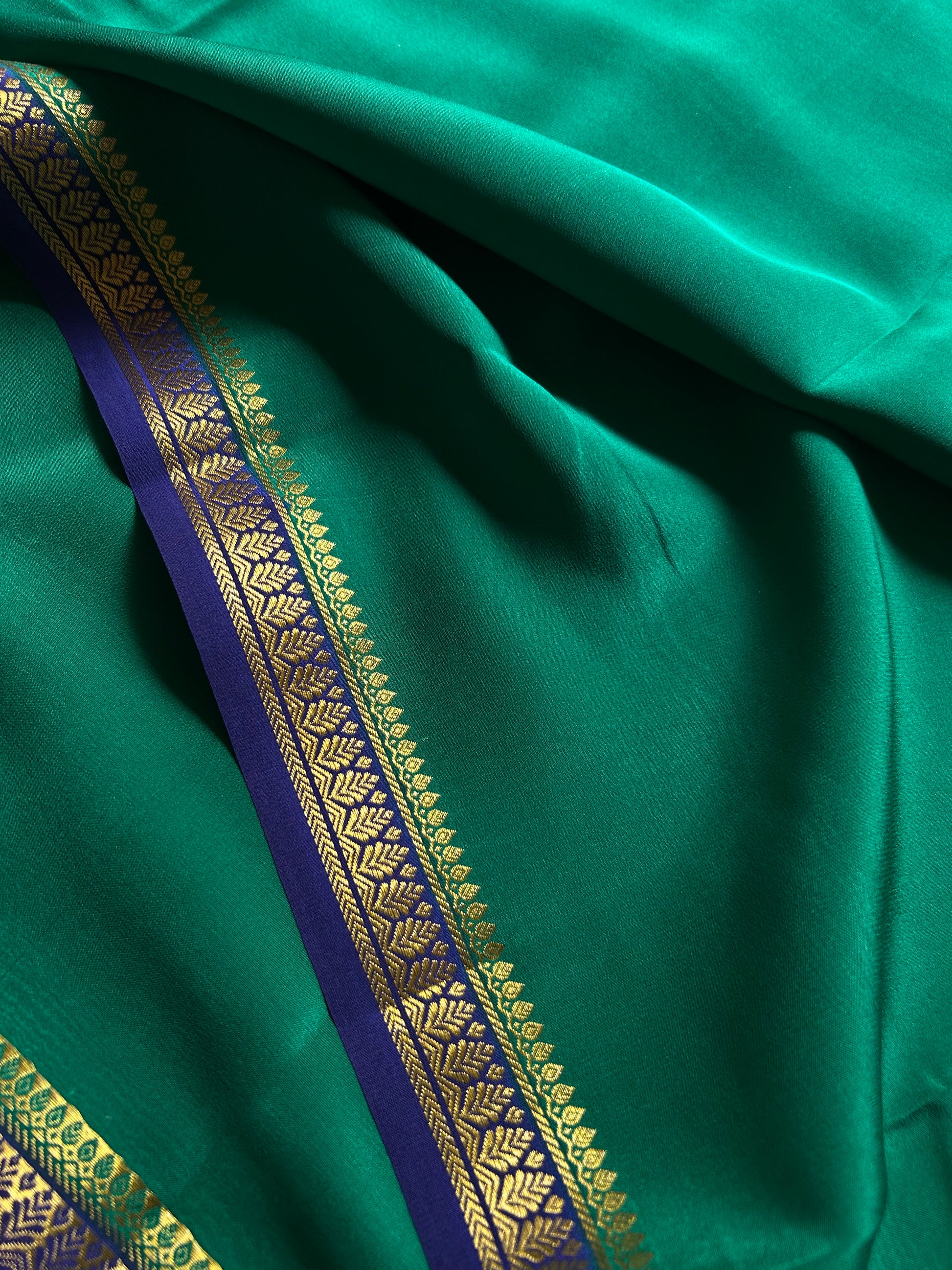 Elevate your saree collection with this exquisite Mysore crepe silk creation. Crafted from pure Copper Silver Silk with a luxurious 100 GSM weight, this piece features a stunning rama green base complemented by a sophisticated navy blue border. The intricate CSS zari work adorns the border with meticulous detailing, showcasing traditional craftsmanship at its finest. The fluid drape and lustrous finish of crepe silk ensure graceful movement and timeless elegance. Perfect for festive occasions, celebrations, and formal gatherings, this saree seamlessly blends heritage artistry with contemporary aesthetics.