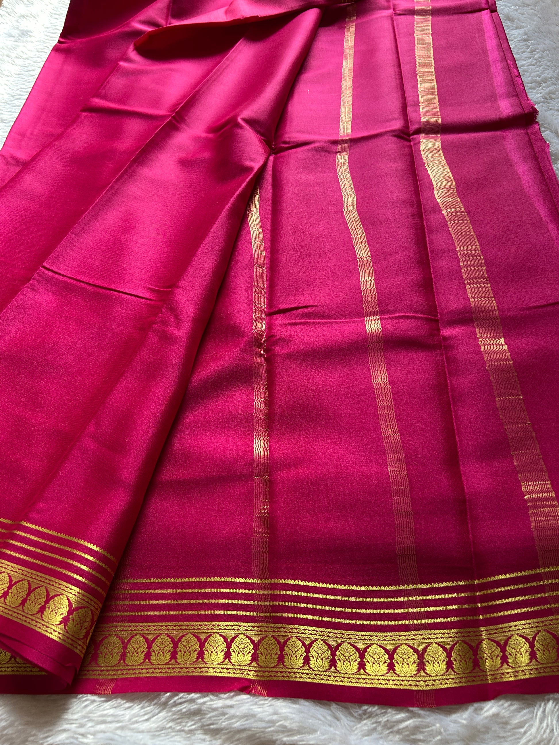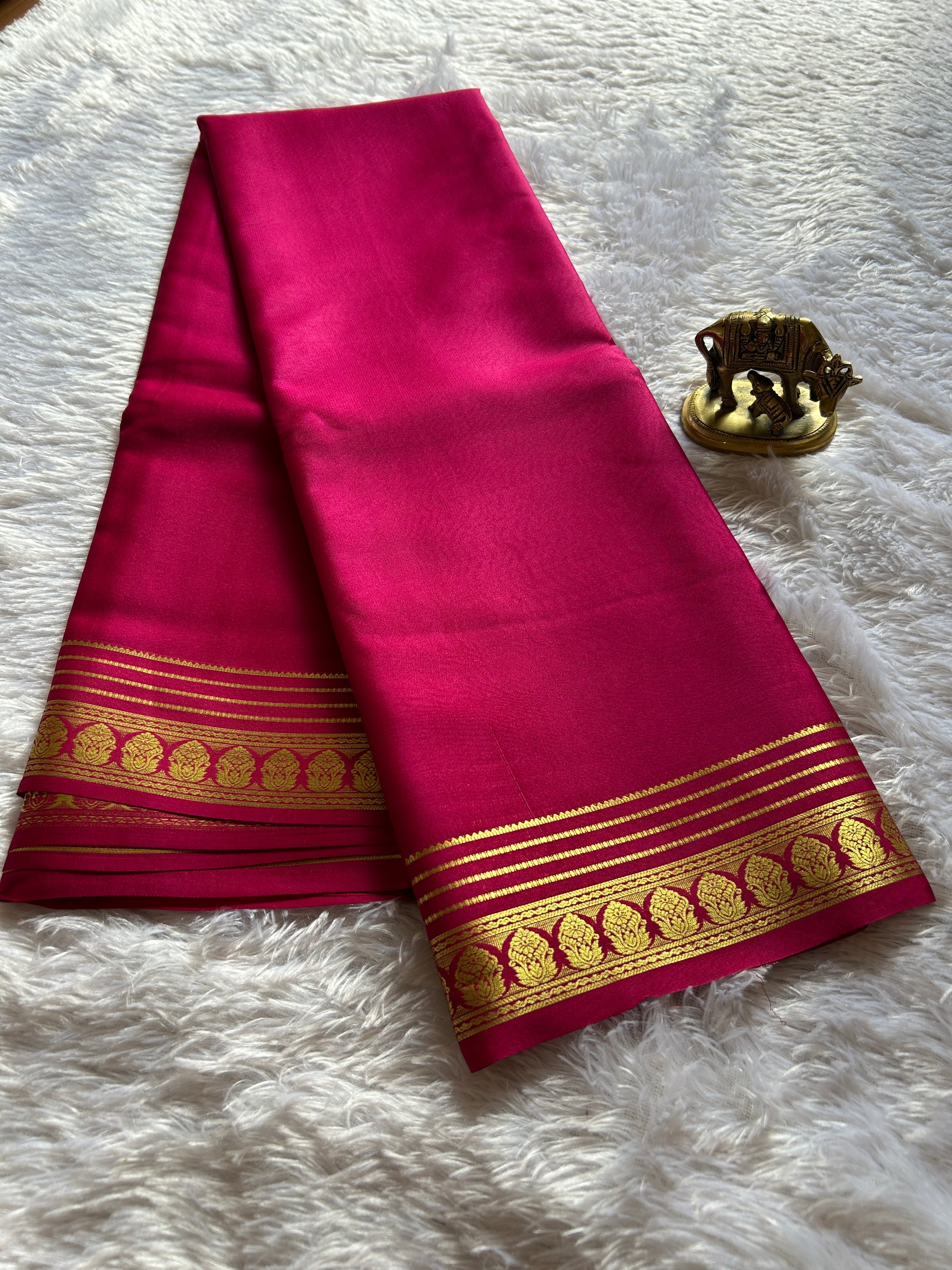 This elegant Kalasha saree features a solid pink hue crafted from lightweight pure Mysore Crepe silk, renowned for its smooth texture and graceful drape. The exquisite zari work along the border adds a refined touch of traditional artistry, making it an ideal choice for both formal occasions and festive celebrations. Its breathable fabric ensures comfort without compromising on sophistication.