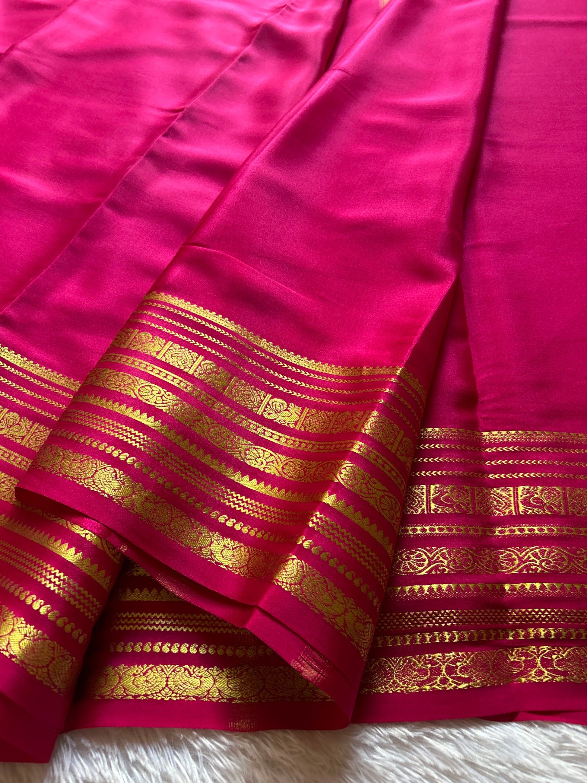 This elegant solid pink saree from Kalpana features pure Mysore crepe silk renowned for its smooth texture and graceful drape. Enhanced with a rich zari border, it offers a subtle yet sophisticated shimmer that elevates traditional wear. Perfect for formal occasions, this saree combines timeless craftsmanship with refined simplicity.