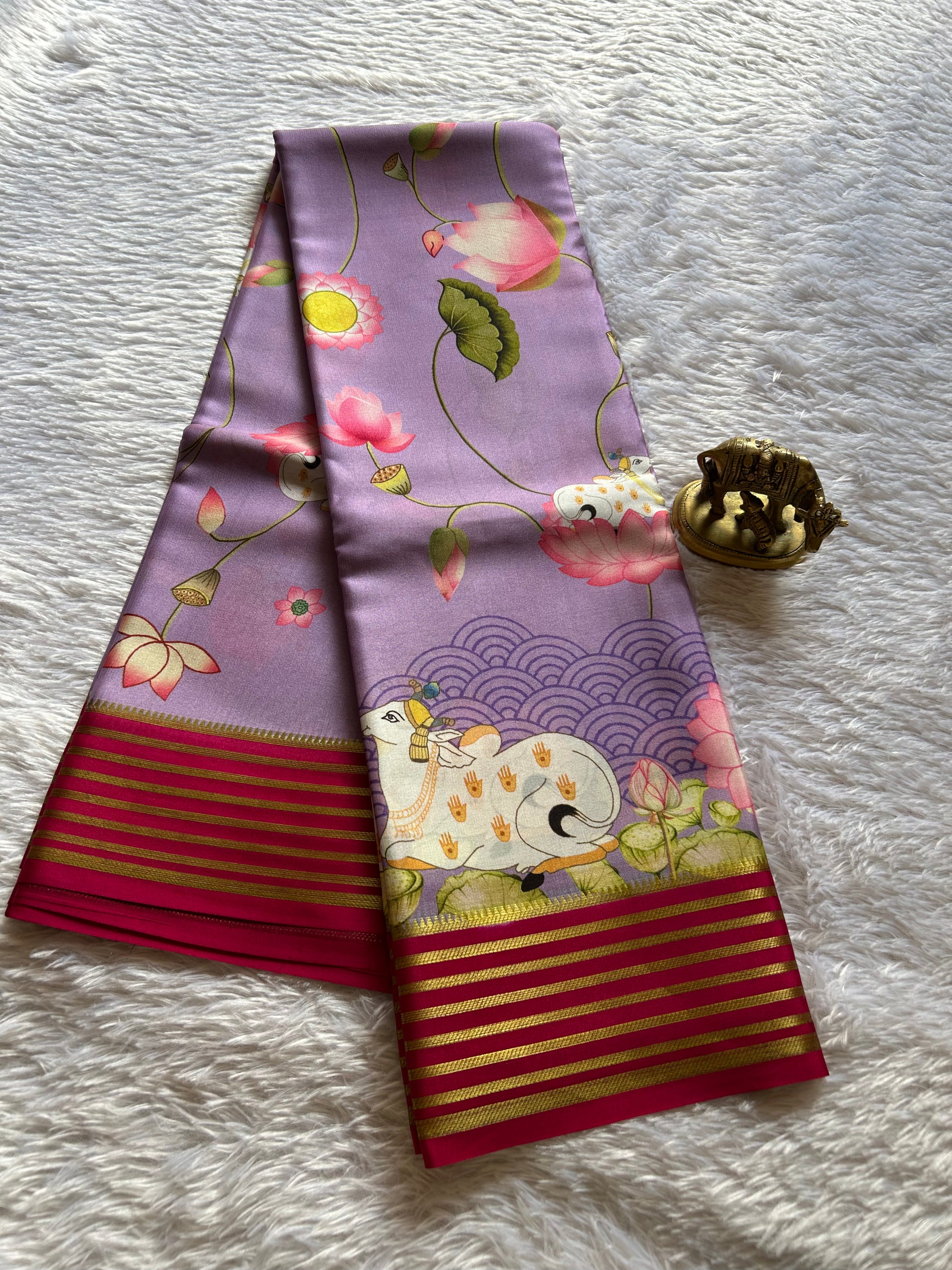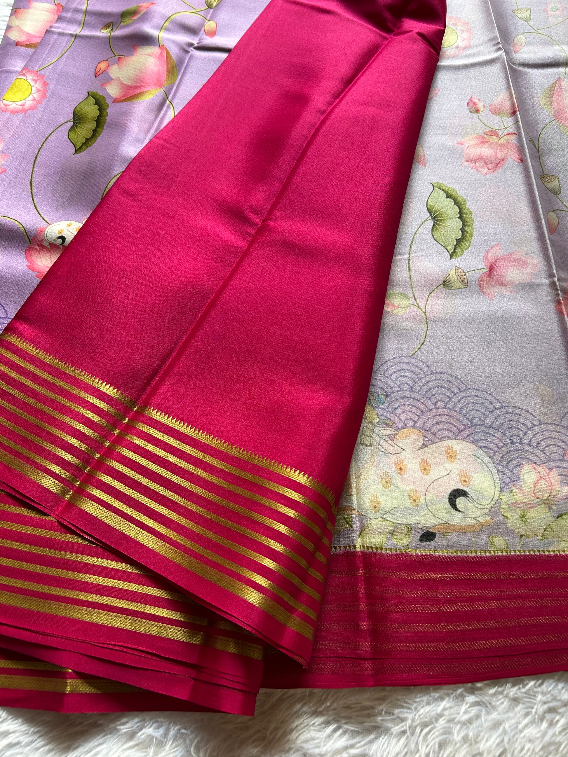 Draped in ethereal lavender, this Mysore crepe silk saree exemplifies refined craftsmanship. The lightweight fabric ensures effortless grace, while intricate pichwai prints cascade across the entire length, celebrating traditional artistry. A striking pink border frames the silhouette, while the pallu features delicate zari lines that catch light with understated elegance. Perfect for those who appreciate heritage textiles with contemporary sensibility, this piece transitions seamlessly from festive occasions to refined gatherings.