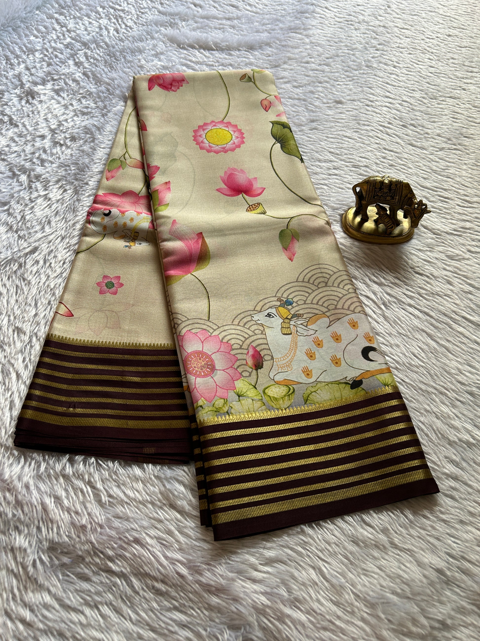 This Kamala saree features a light beige base crafted from pure Mysore crepe silk, celebrated for its smooth texture and breathable lightweight quality. The saree is adorned with subtle printed patterns that enhance its understated elegance. Its chocolate brown border, accentuated with delicate zari lines, provides a refined contrast, adding depth and sophistication. Perfectly balanced between traditional craftsmanship and modern wearability, this saree is ideal for both formal occasions and cultural celebrations.