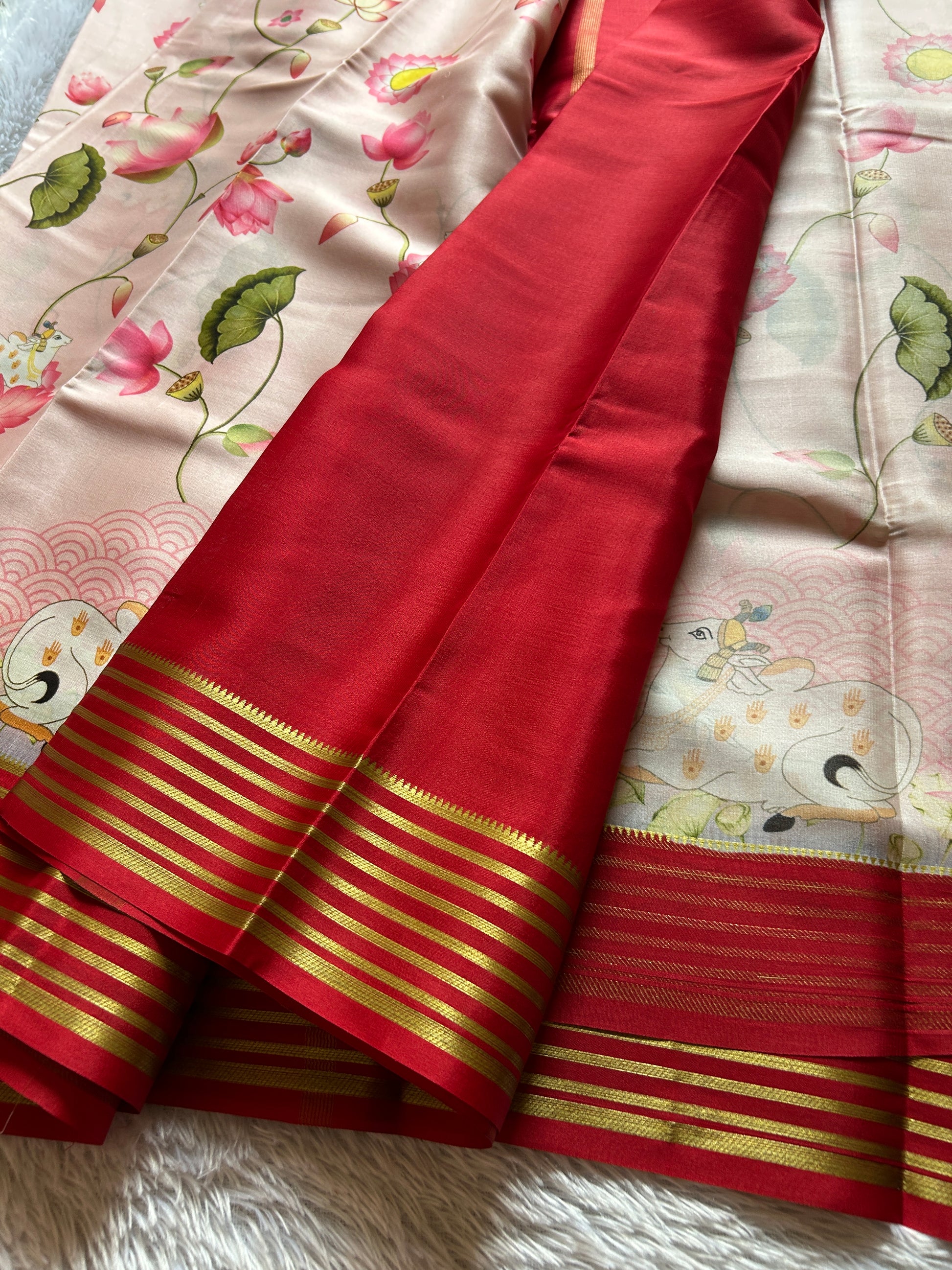 This Kamala saree is crafted from pure Mysore crepe silk, known for its smooth texture and lightweight feel. The light pink fabric features delicate prints, beautifully contrasted by a striking red border adorned with elegant zari lines. Perfect for formal occasions, it offers a refined drape and sophisticated charm, combining traditional craftsmanship with contemporary style.