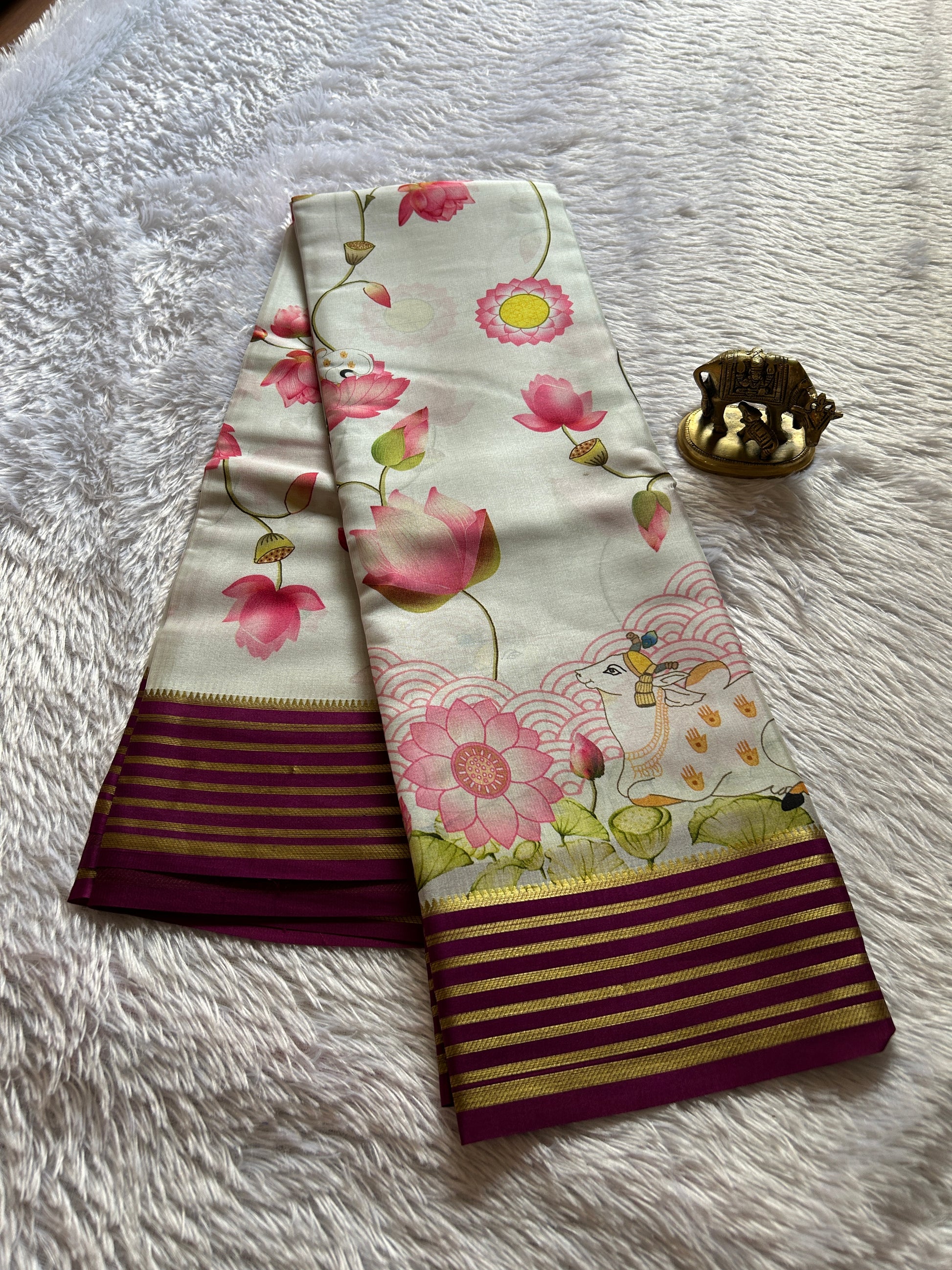 Elevate your wardrobe with the Kamala saree—a delicate off white pure Mysore crepe silk creation featuring a lightweight, breathable texture ideal for extended wear. The saree's subtle printed design complements its elegant dark pink border adorned with fine zari lines, blending traditional craftsmanship with refined modern appeal. Perfect for formal occasions and cultural events, this saree offers graceful drape and timeless sophistication.
