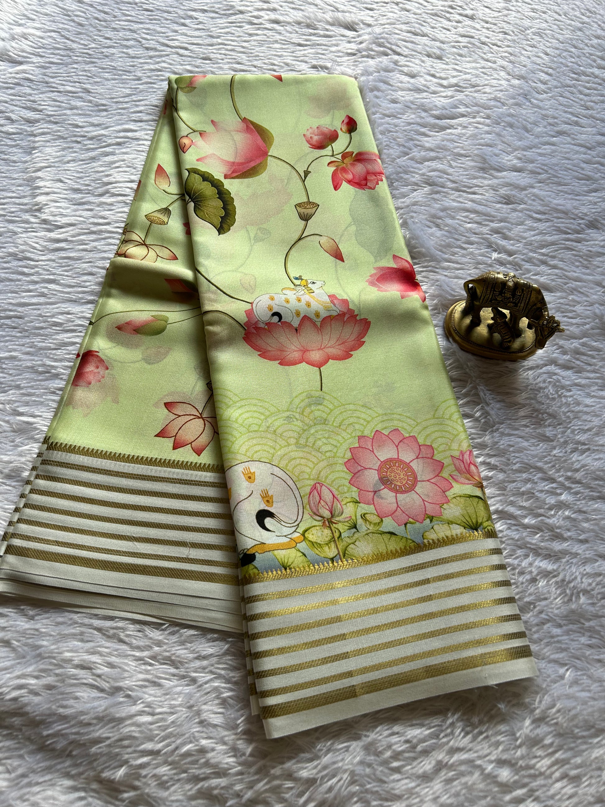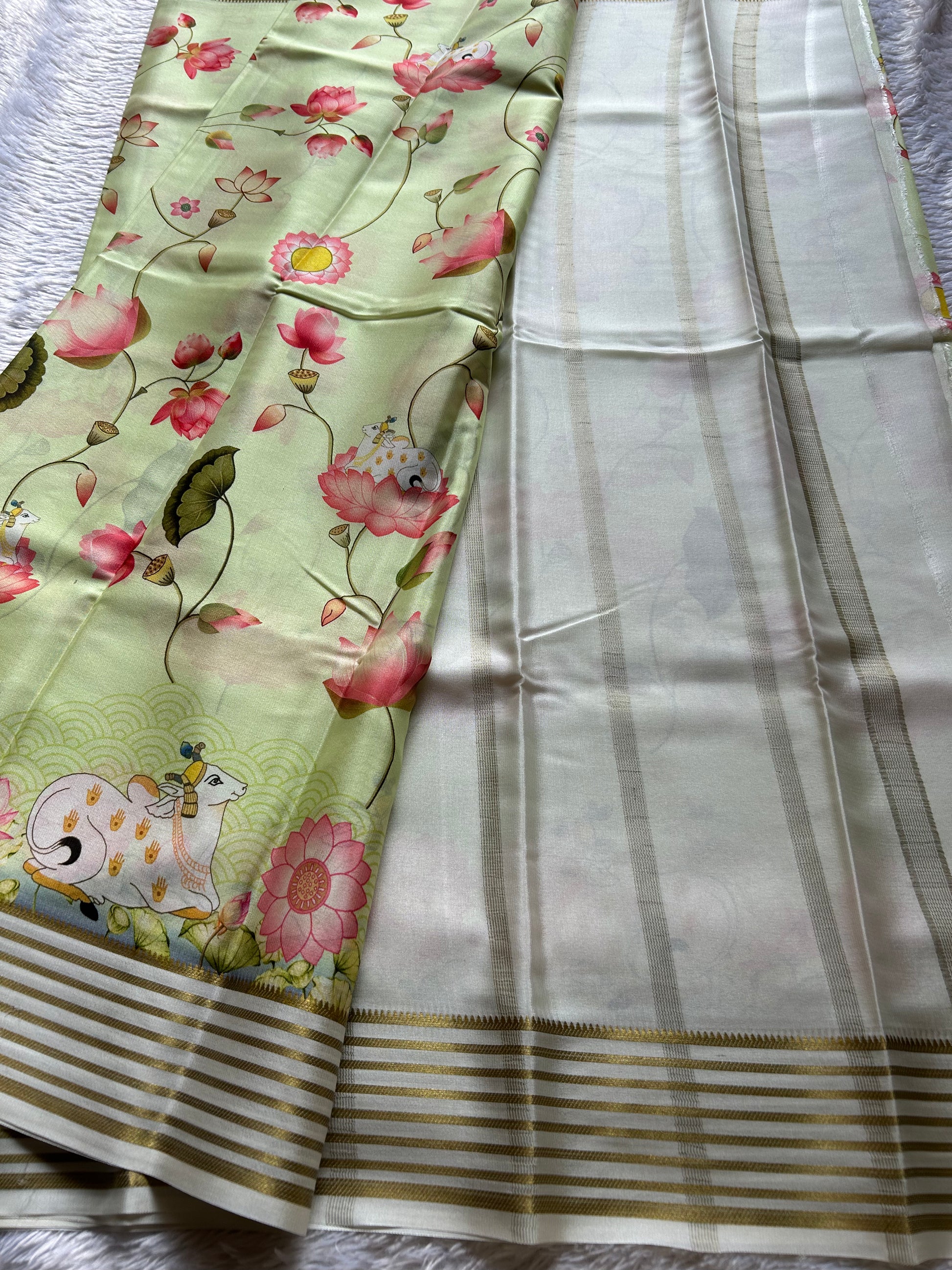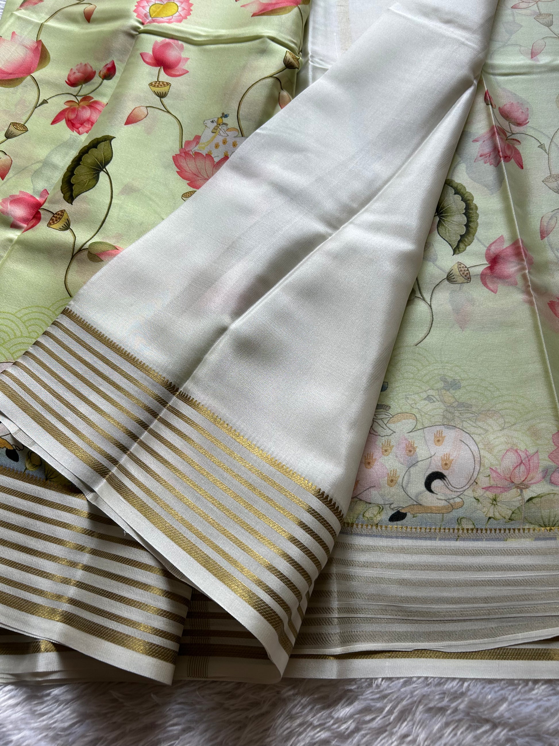 Draped in ethereal light pista green, this Mysore crepe silk saree exemplifies refined craftsmanship. The fabric's lightweight construction ensures effortless draping while maintaining the luxurious feel of pure silk. Intricate pichwai prints cascade across the entire saree, celebrating traditional artistry. The off-white border provides subtle contrast, while the pallu features delicate zari lines that add understated opulence. Perfect for those who appreciate heritage textiles with contemporary sensibility.