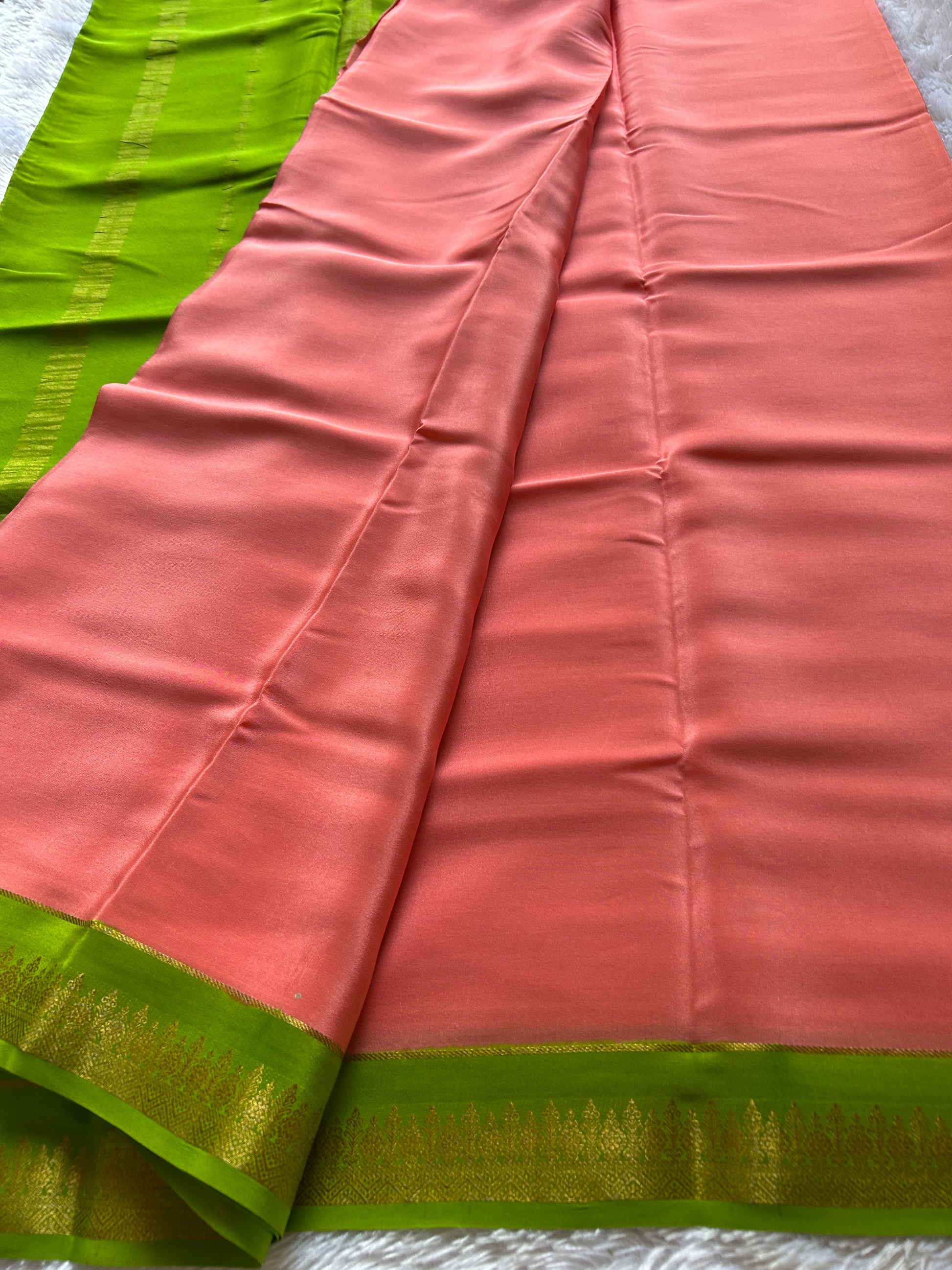 Elevate your ethnic wardrobe with this exquisite Mysore crepe silk saree, crafted from pure silk at 110 GSM for a luxurious drape and refined finish. The soft peach base is beautifully complemented by a striking mehendi green border featuring intricate floral CSS zari work that catches light with every movement. A delicate zari line adorns the top, while both the border and pallu showcase sophisticated copper-silver silk zari embellishments. This saree seamlessly blends traditional craftsmanship with contemporary aesthetics, making it an ideal choice for weddings, celebrations, and special occasions where understated elegance speaks volumes.