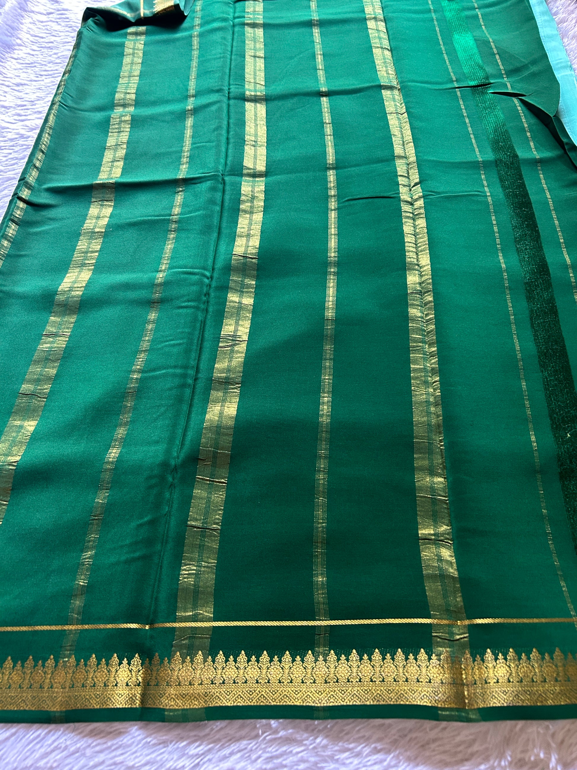 Elevate your collection with this exquisite Mysore crepe silk saree in serene sea blue, crafted from premium 110 GSM pure silk. The saree features a striking bottle green border adorned with intricate floral CSS zari detailing, complemented by a delicate zari line along the top edge. Both the border and pallu showcase sophisticated copper-silver silk zari work, creating a harmonious blend of traditional craftsmanship and refined elegance. Perfect for discerning wearers who appreciate authentic weaving techniques and timeless design.