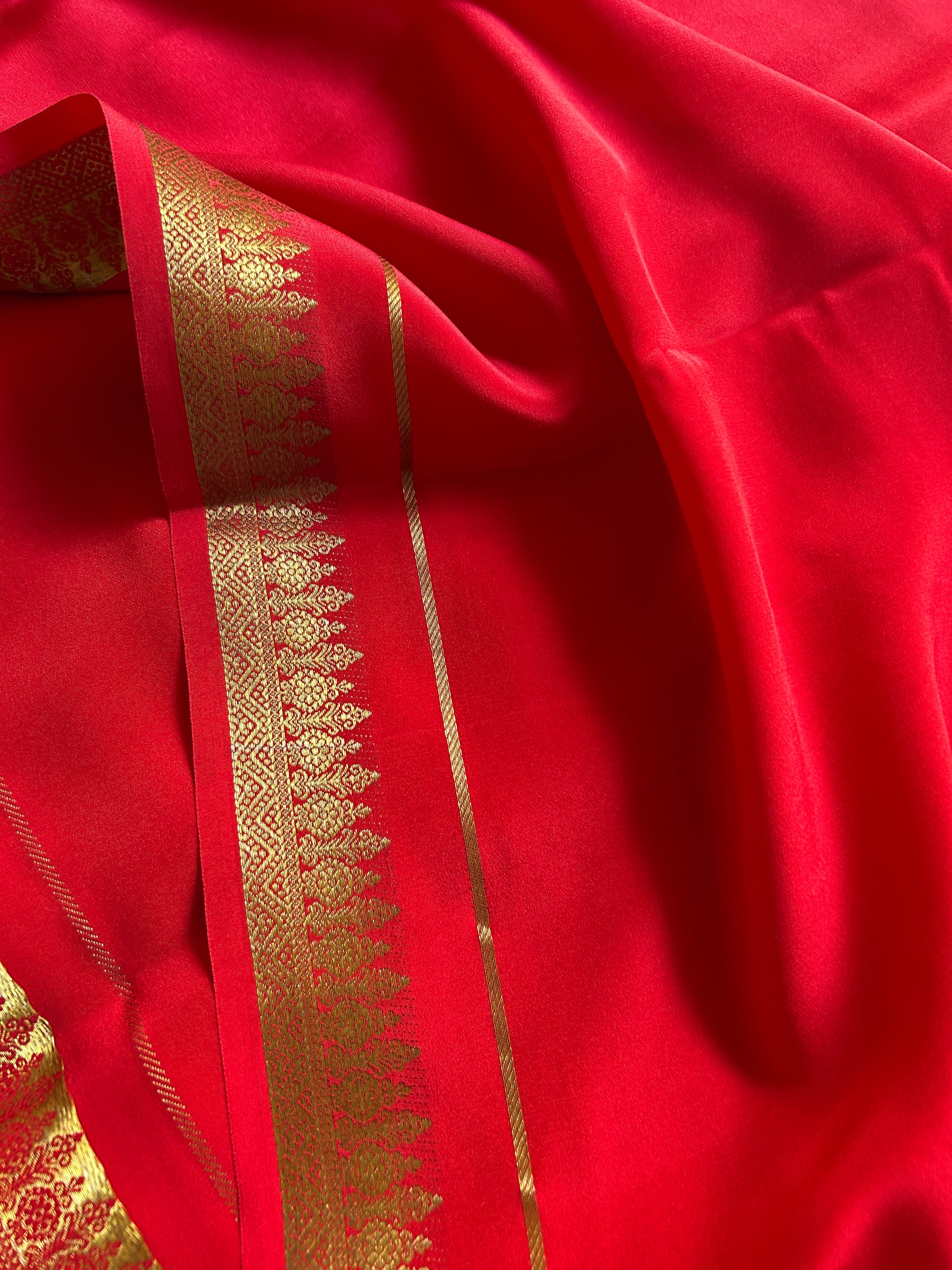 This red Mysore crepe silk saree showcases exceptional quality with its 110 GSM pure silk construction, delivering the signature fluidity and subtle luminescence characteristic of premium handlooms. The saree features a distinctive floral copper-silver silk zari border crowned with a refined zari line, while both the border and pallu are enriched with intricate CSS zari embellishment that creates dimensional elegance. The thoughtful integration of solid fabric with ornamental detailing produces a sophisticated piece that transcends occasion, appealing to discerning collectors who recognize the value of authentic craftsmanship and timeless design.