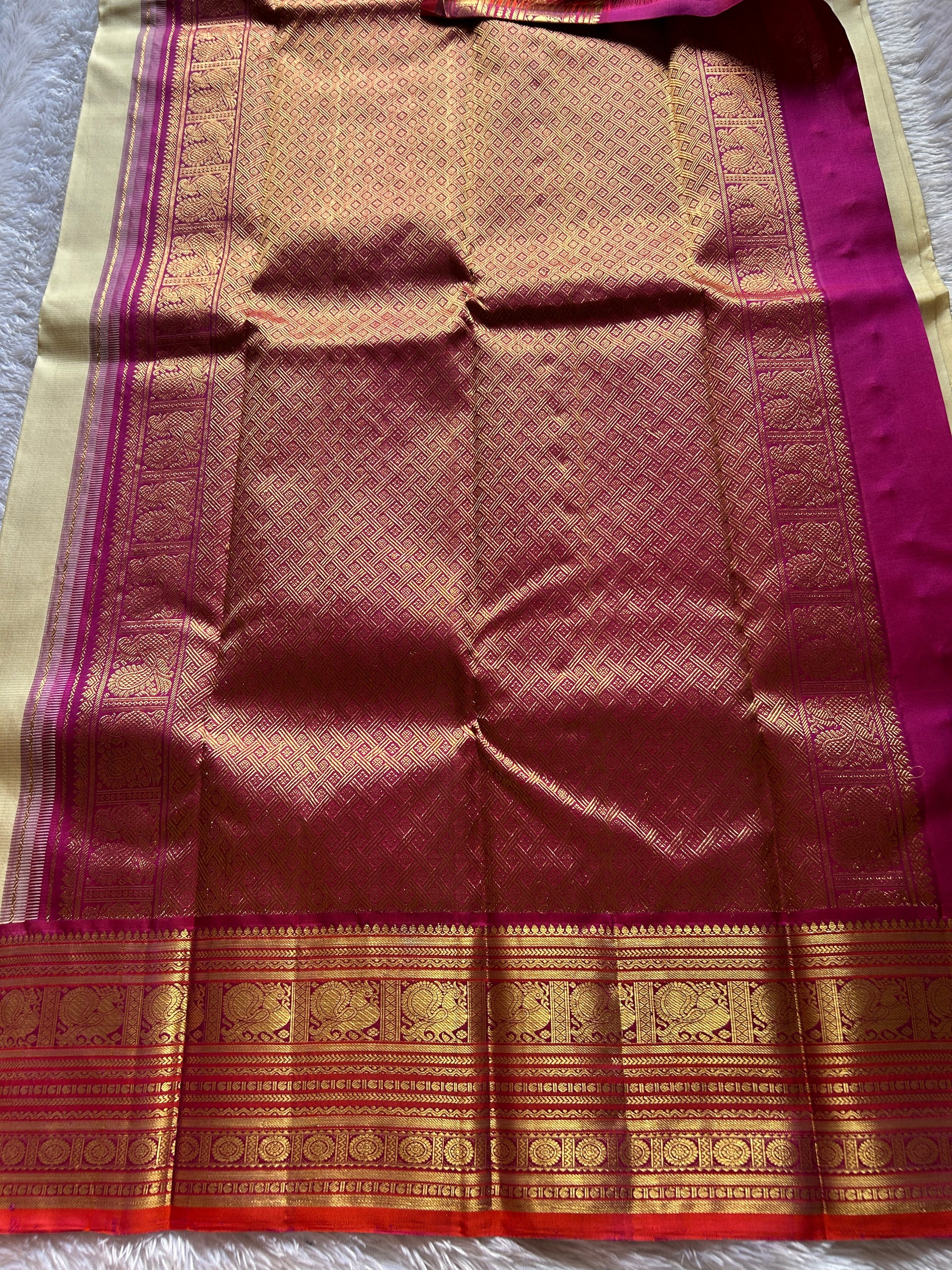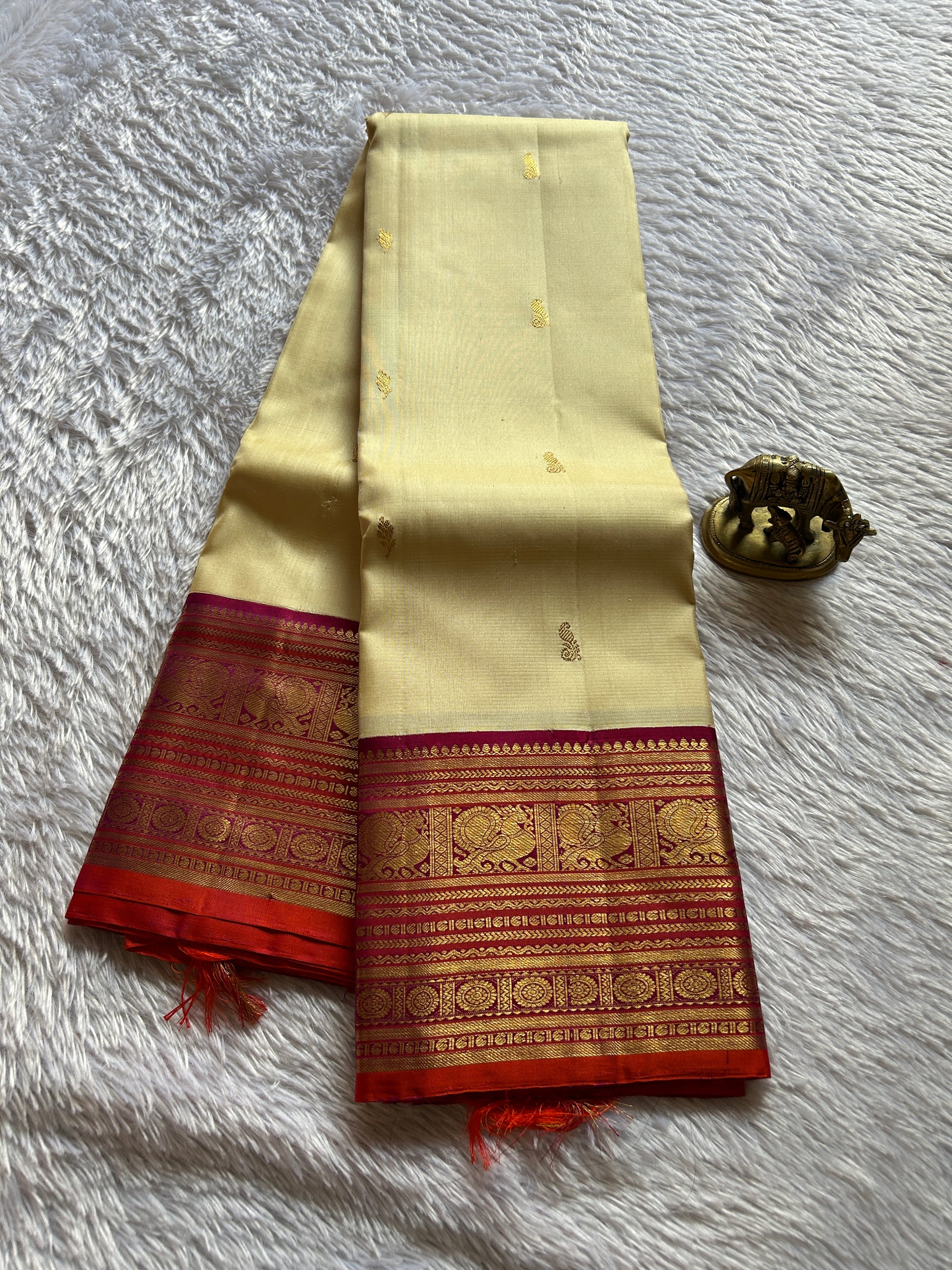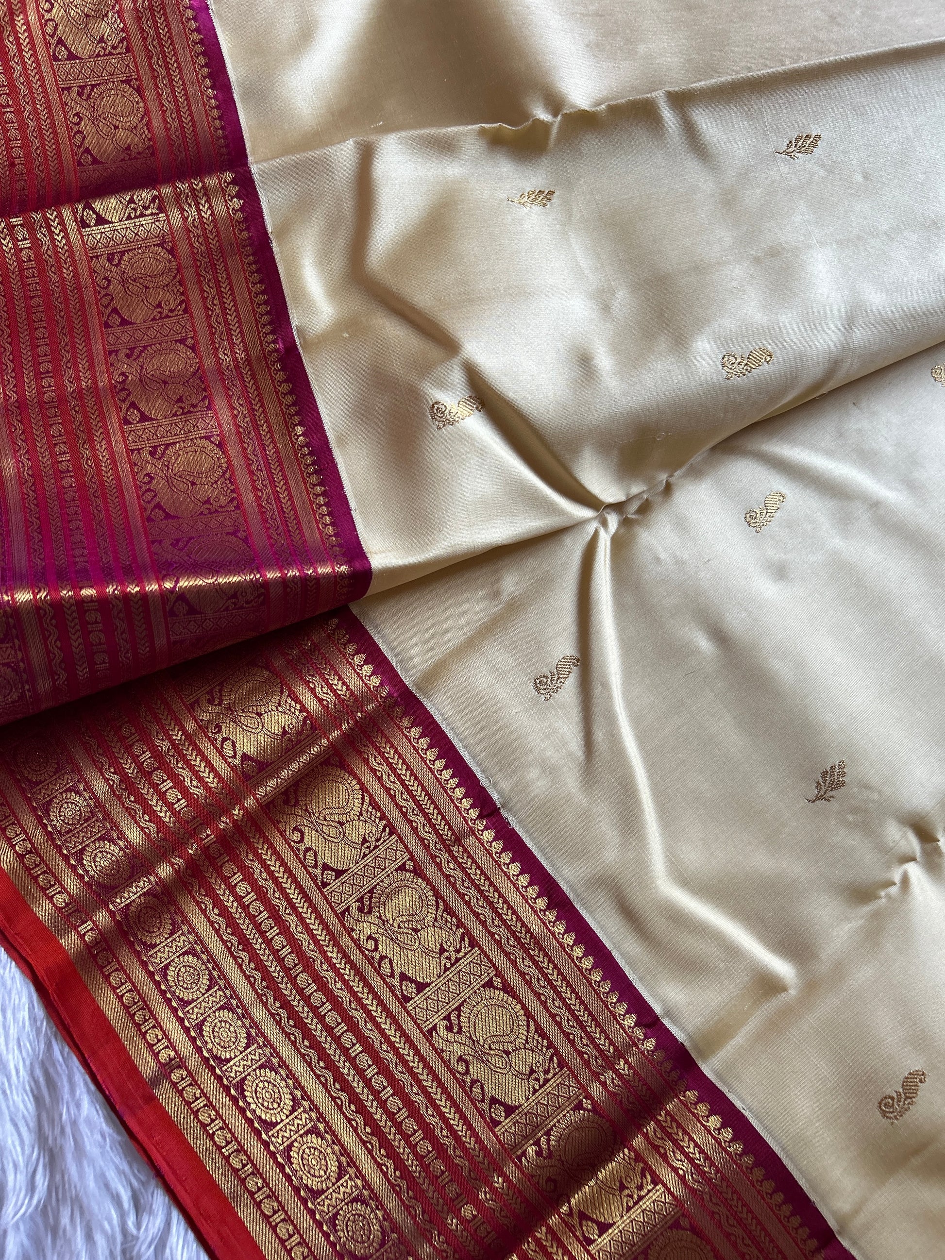 Elevate your bridal ensemble with this exquisite Kancheepuram handloom saree, a masterpiece of traditional South Indian weaving. The pristine off-white body is adorned with delicate zari buttas scattered throughout, creating an understated elegance. The striking rust border showcases intricate zari craftsmanship featuring graceful peacock motifs and refined line work that commands attention. The dark magenta pallu bursts with opulent zari embellishment, perfectly complemented by the matching dark magenta blouse material with its coordinating border. Handwoven with meticulous attention to detail, this saree embodies the timeless sophistication every bride deserves.