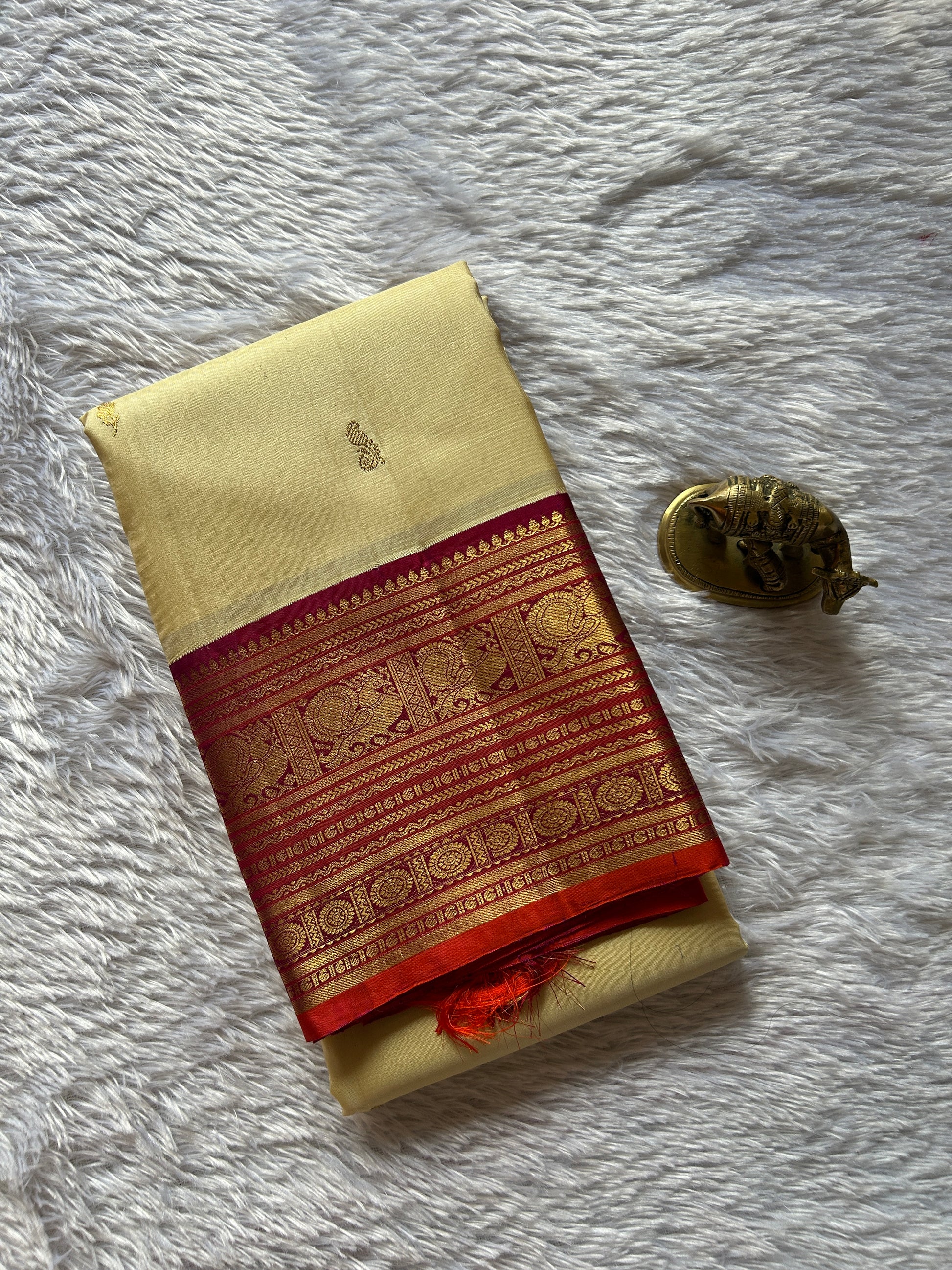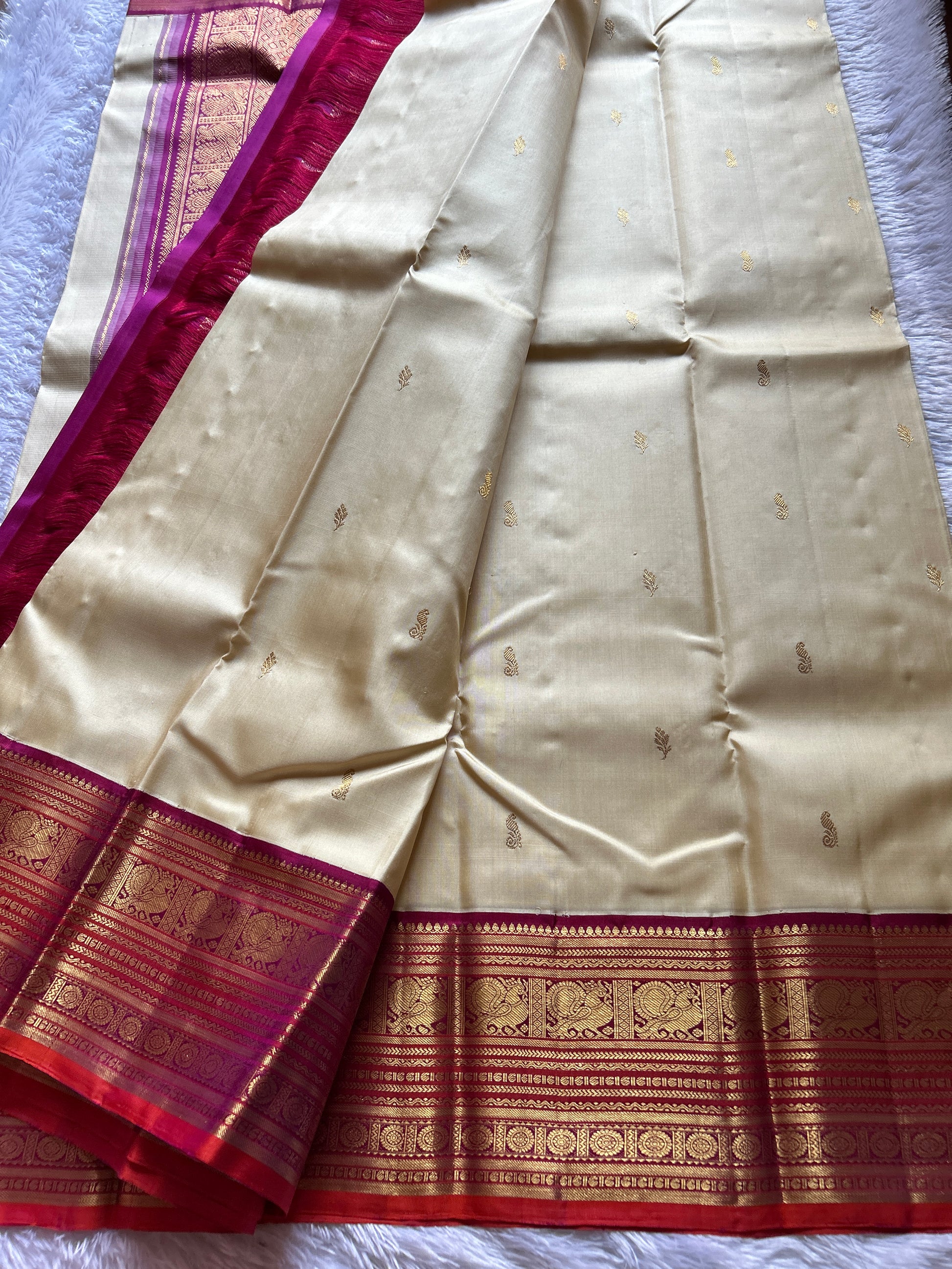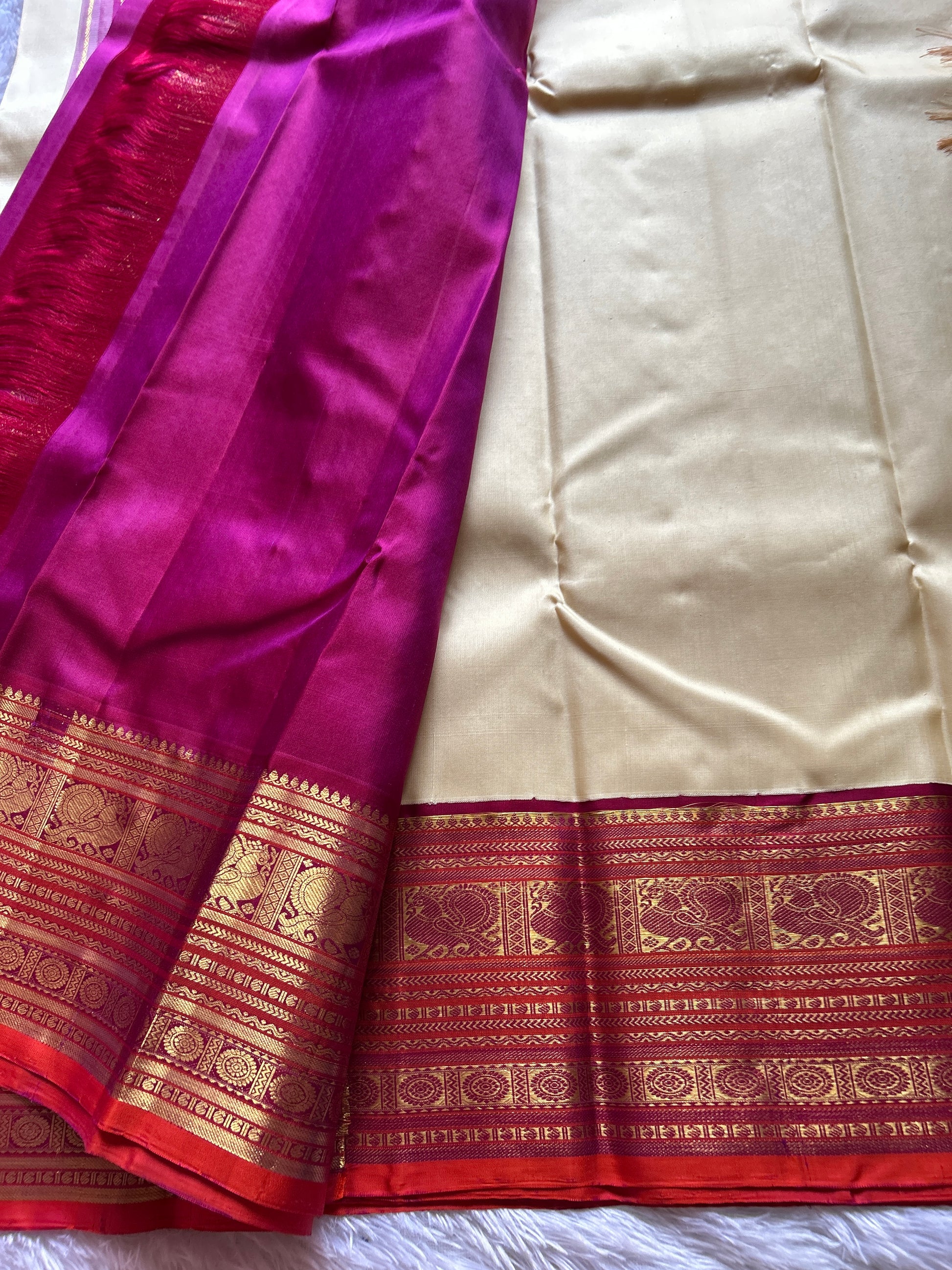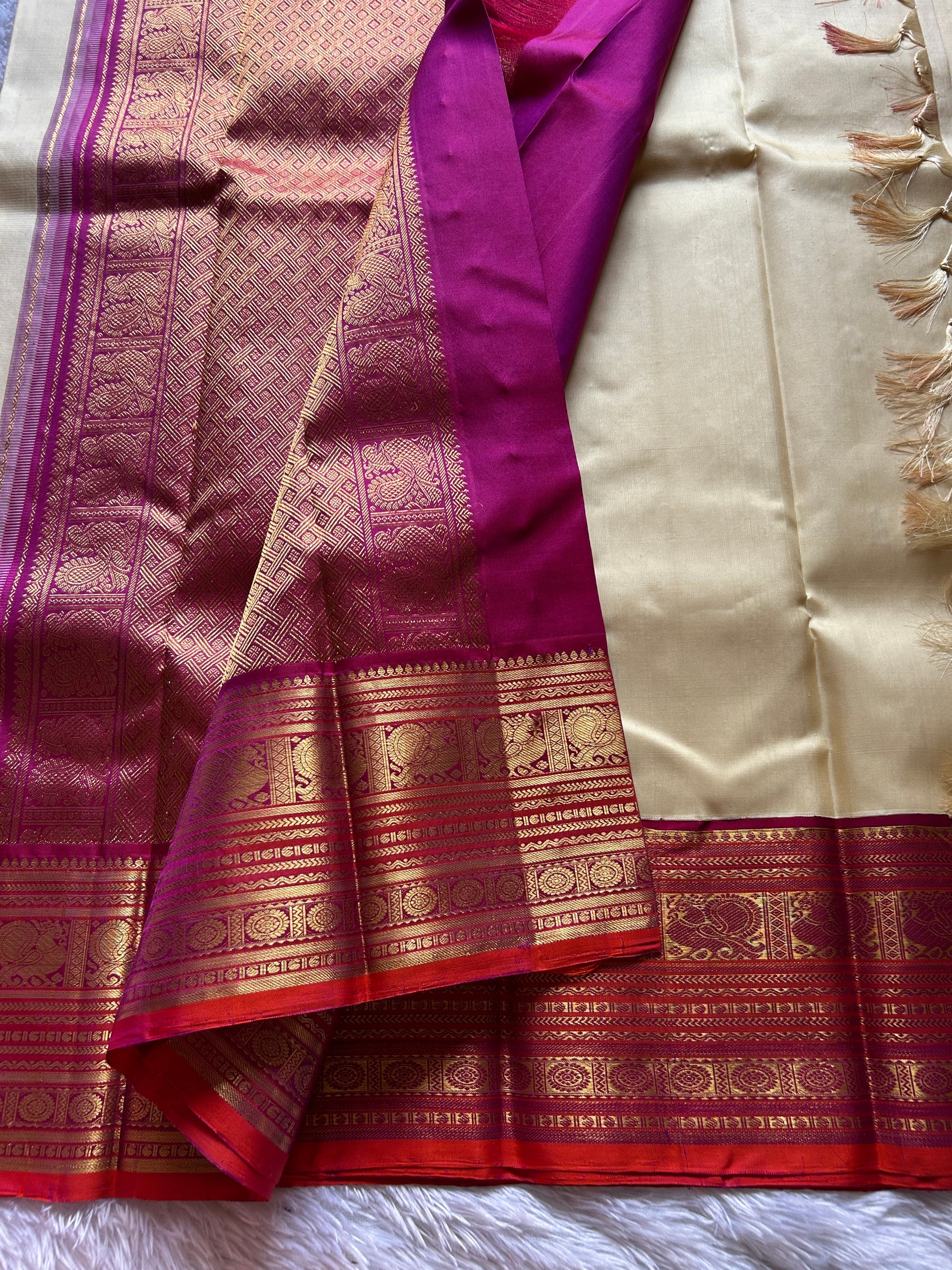 Elevate your bridal ensemble with this exquisite Kancheepuram handloom saree, a masterpiece of traditional South Indian weaving. The pristine off-white body is adorned with delicate zari buttas scattered throughout, creating an understated elegance. The striking rust border showcases intricate zari craftsmanship featuring graceful peacock motifs and refined line work that commands attention. The dark magenta pallu bursts with opulent zari embellishment, perfectly complemented by the matching dark magenta blouse material with its coordinating border. Handwoven with meticulous attention to detail, this saree embodies the timeless sophistication every bride deserves.