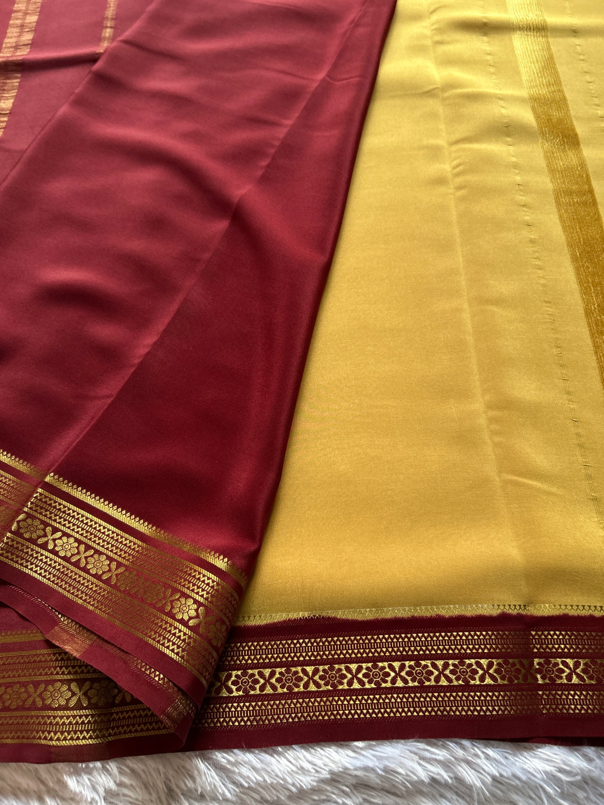 Kanthi (2D) showcases the timeless elegance of pure Mysore crepe silk in a sophisticated beige palette. This 100 GSM saree features a striking chocolate brown border adorned with intricate CSS zari work—a refined blend of copper and silver silk threads that create luminous detailing. The lightweight crepe construction ensures graceful draping while maintaining the fabric's natural sheen and breathability. Perfect for both formal occasions and refined everyday wear, this saree exemplifies traditional craftsmanship with its meticulous embellishment work. The interplay between the neutral base and rich border creates a versatile piece that complements various skin tones and styling preferences.