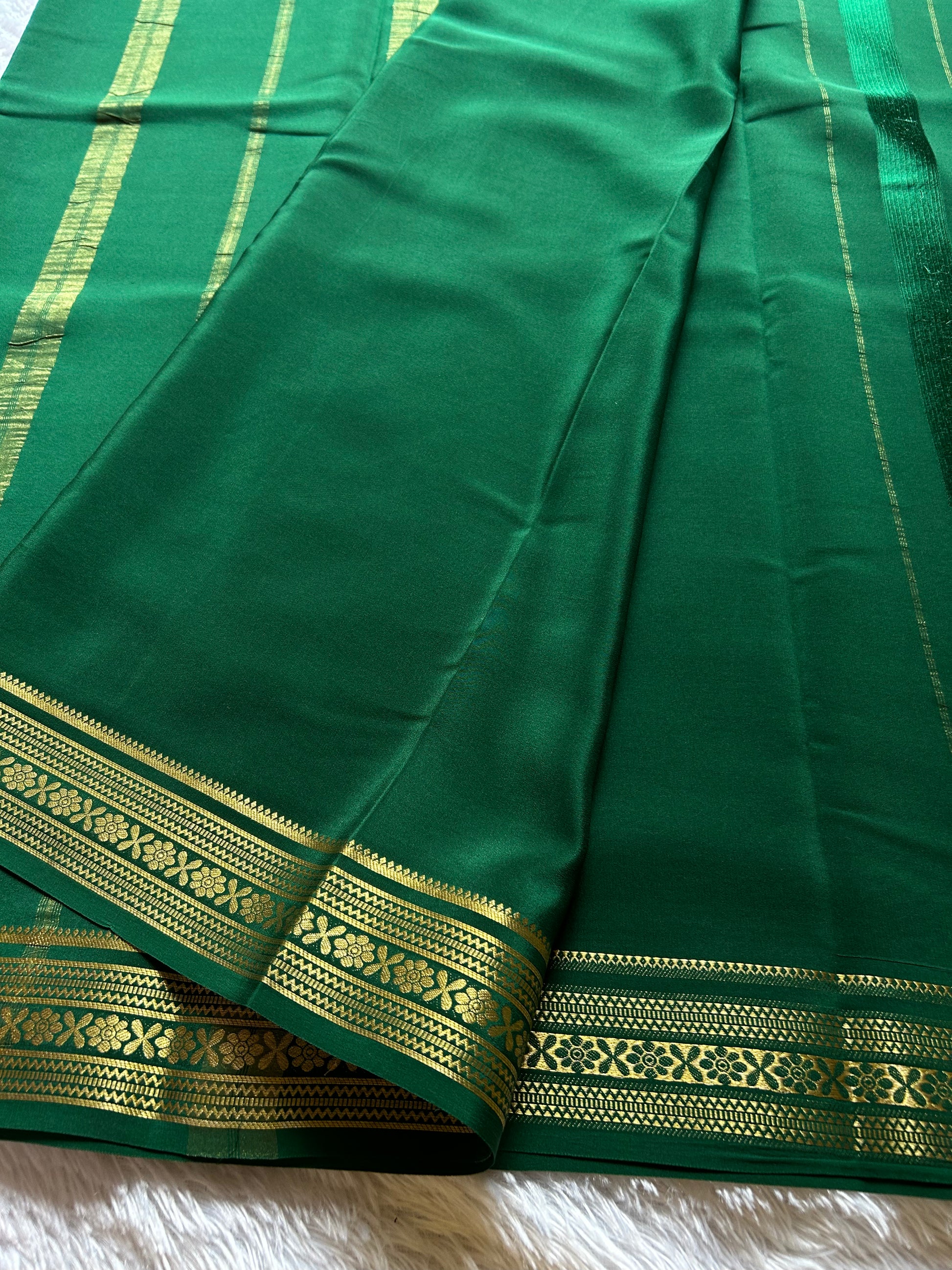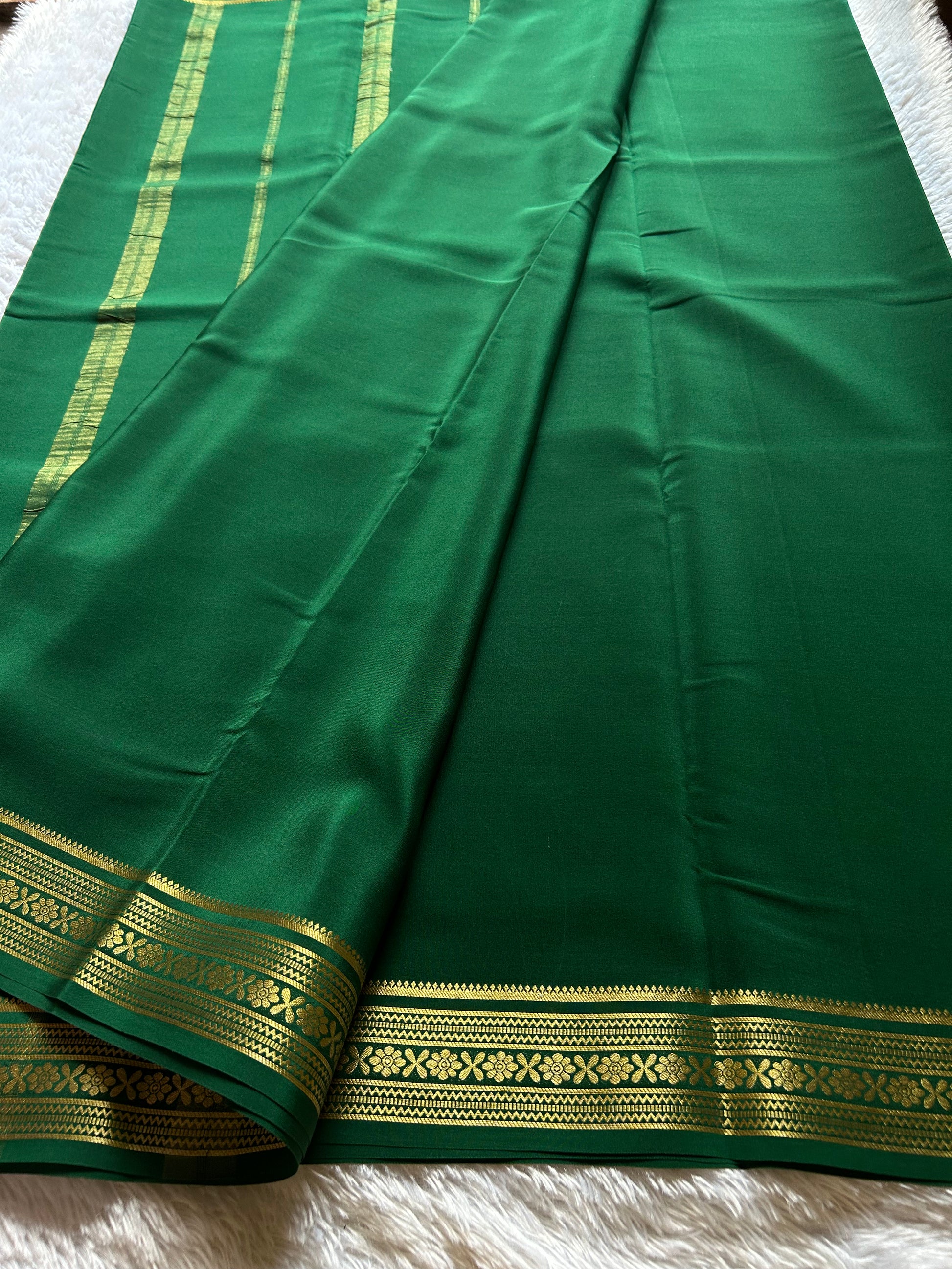 Kanthi showcases the timeless elegance of pure Mysore crepe silk in a sophisticated dark green hue. Crafted from premium 100 GSM fabric, this saree combines the luxurious drape of silk with the refined sheen characteristic of quality crepe weaves. The border features intricate Copper Silver Silk zari work, adding a layer of traditional craftsmanship and visual depth. The solid color palette allows the detailed zari embellishment to command attention, making this piece ideal for both formal occasions and refined everyday wear. A masterpiece for those who appreciate understated luxury and meticulous artisanal detail.