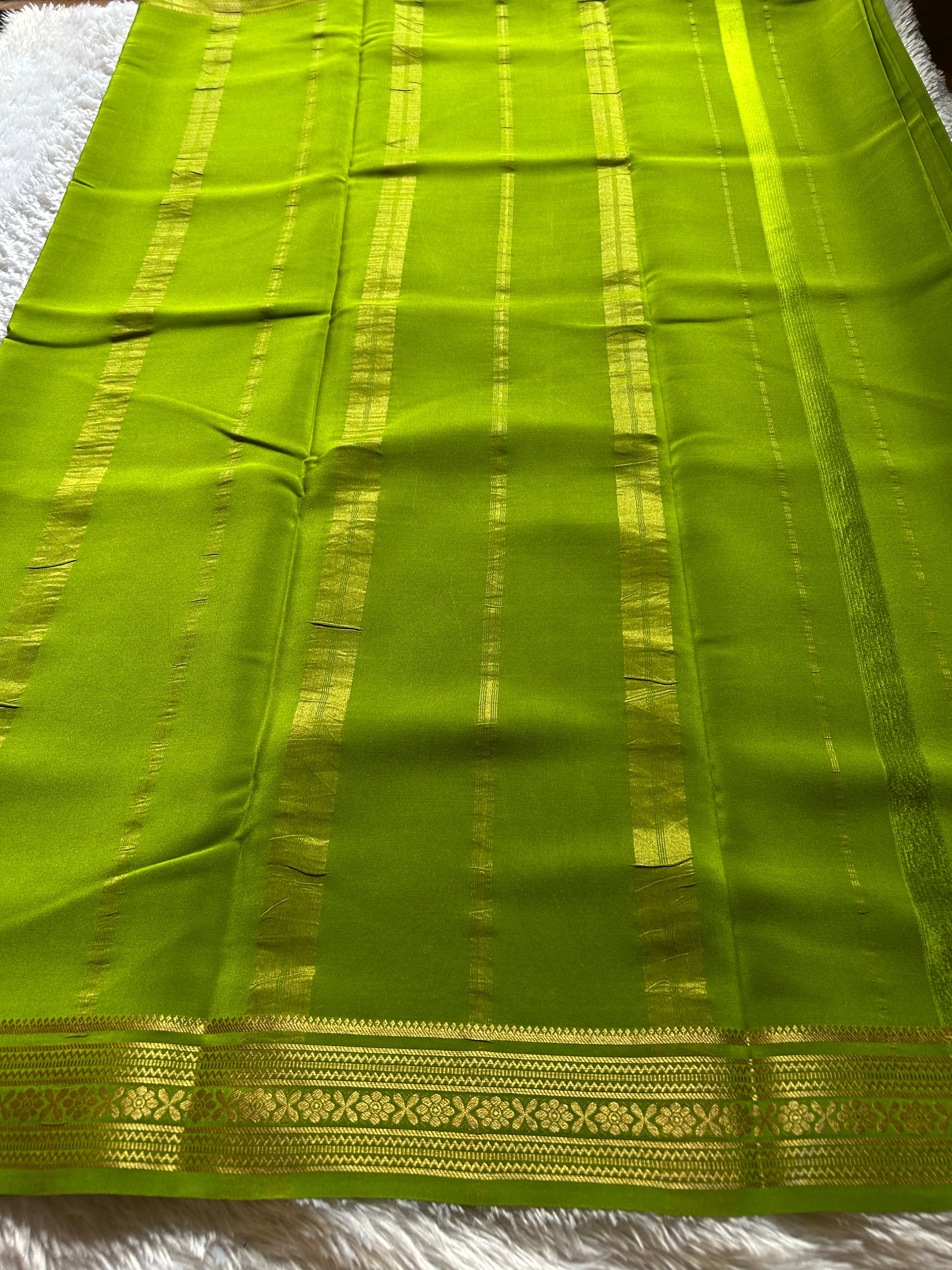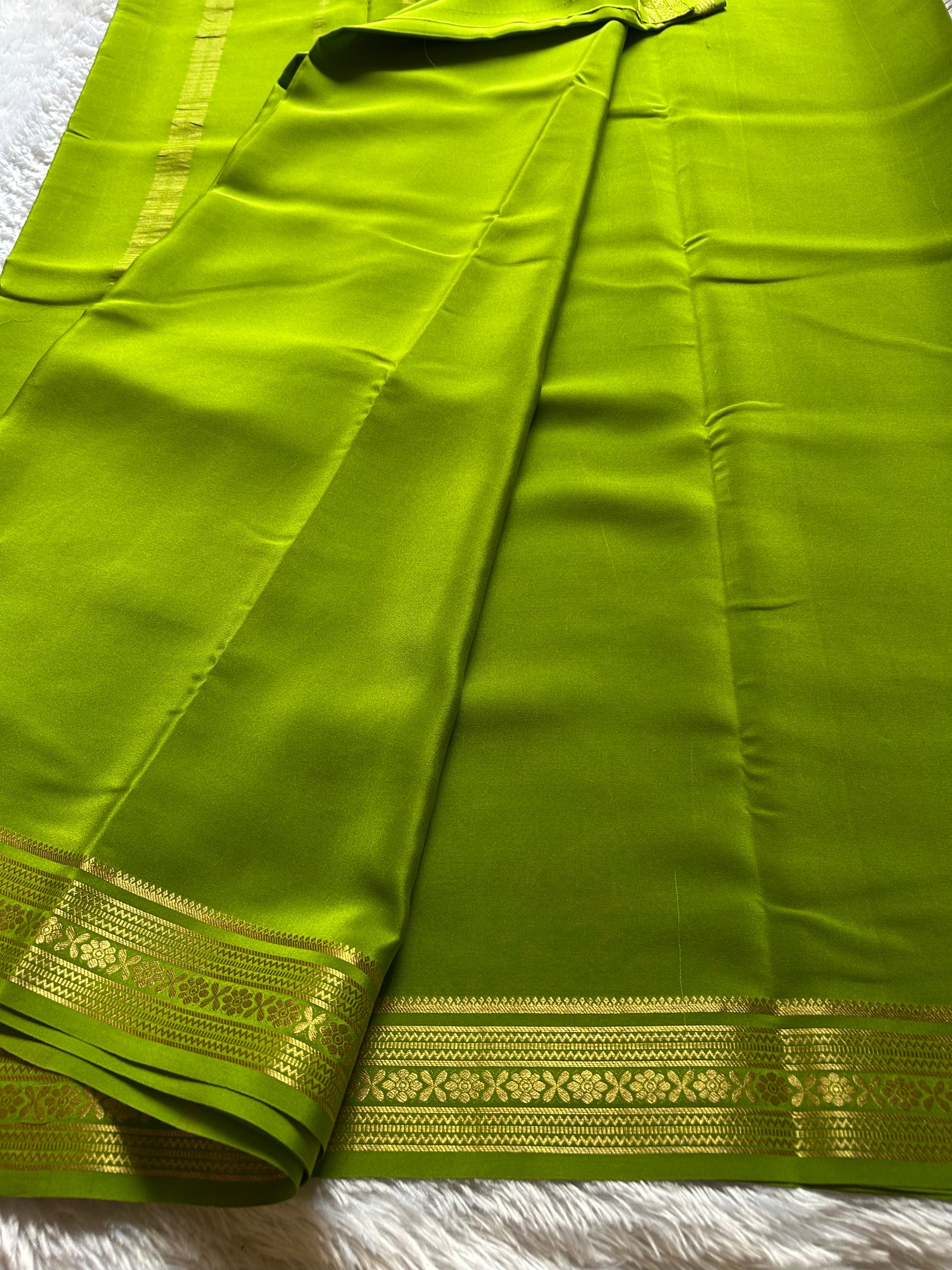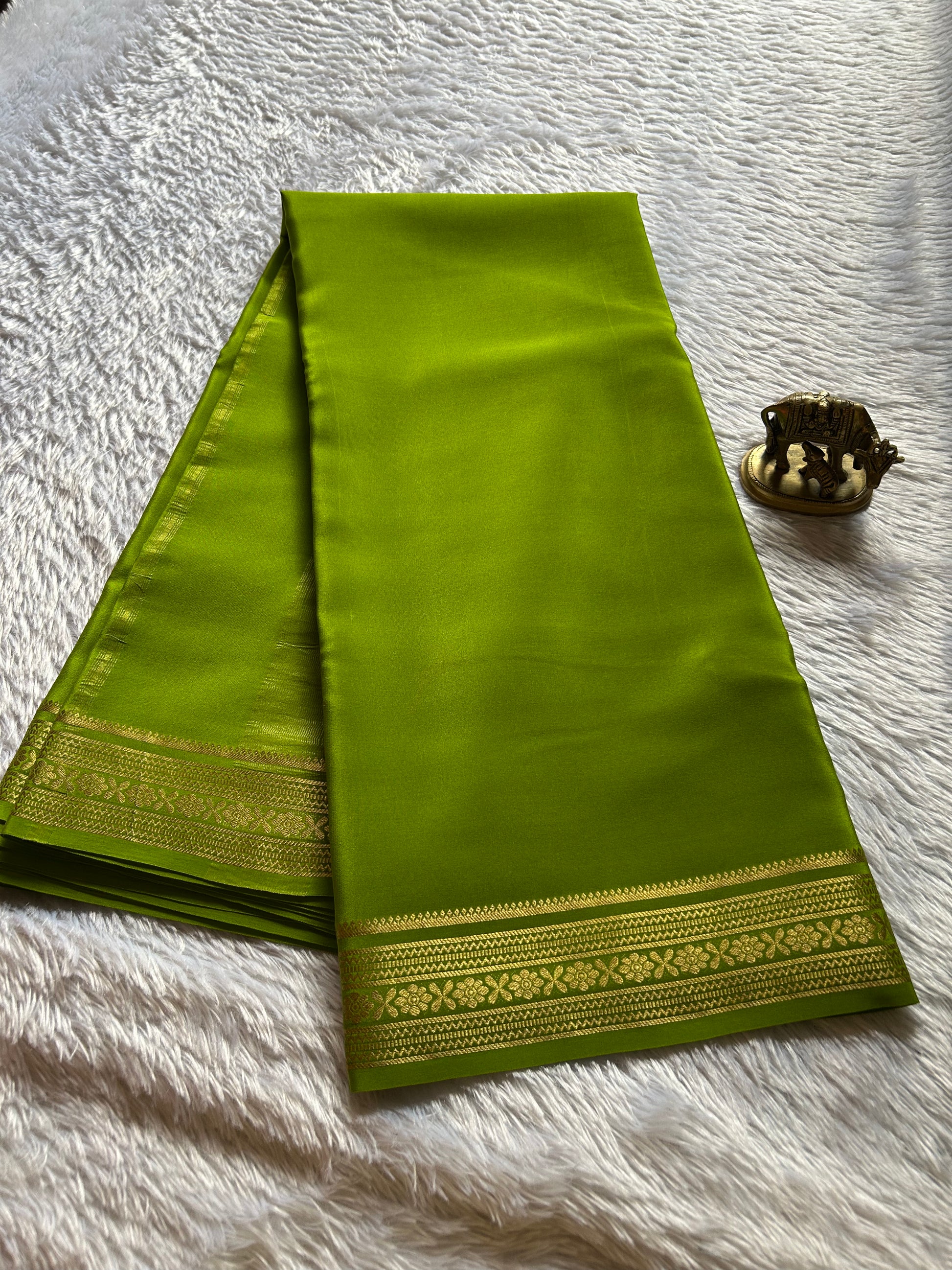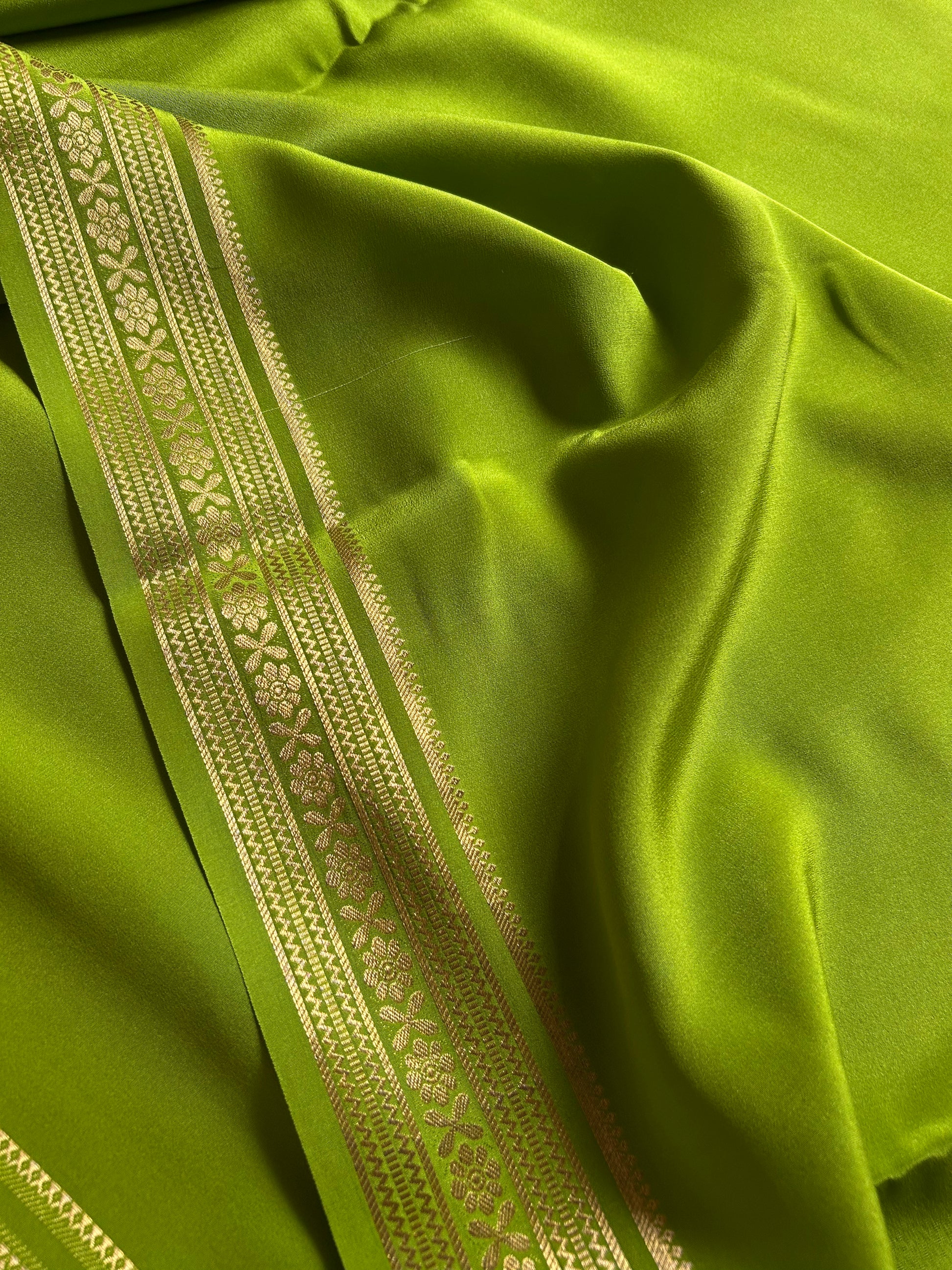 Kanthi celebrates understated elegance in a luminous mehendi green. Crafted from pure Copper Silver Silk (CSS) blended with Mysore crepe silk, this 100 GSM saree drapes with refined fluidity. The border showcases intricate CSS zari work, featuring delicate metallic detailing that catches light beautifully without overwhelming the palette. The weave combines traditional craftsmanship with contemporary sensibility, making it equally suited for intimate gatherings or festive occasions. A versatile choice for those who appreciate sophisticated color and meticulous artisanal work.
