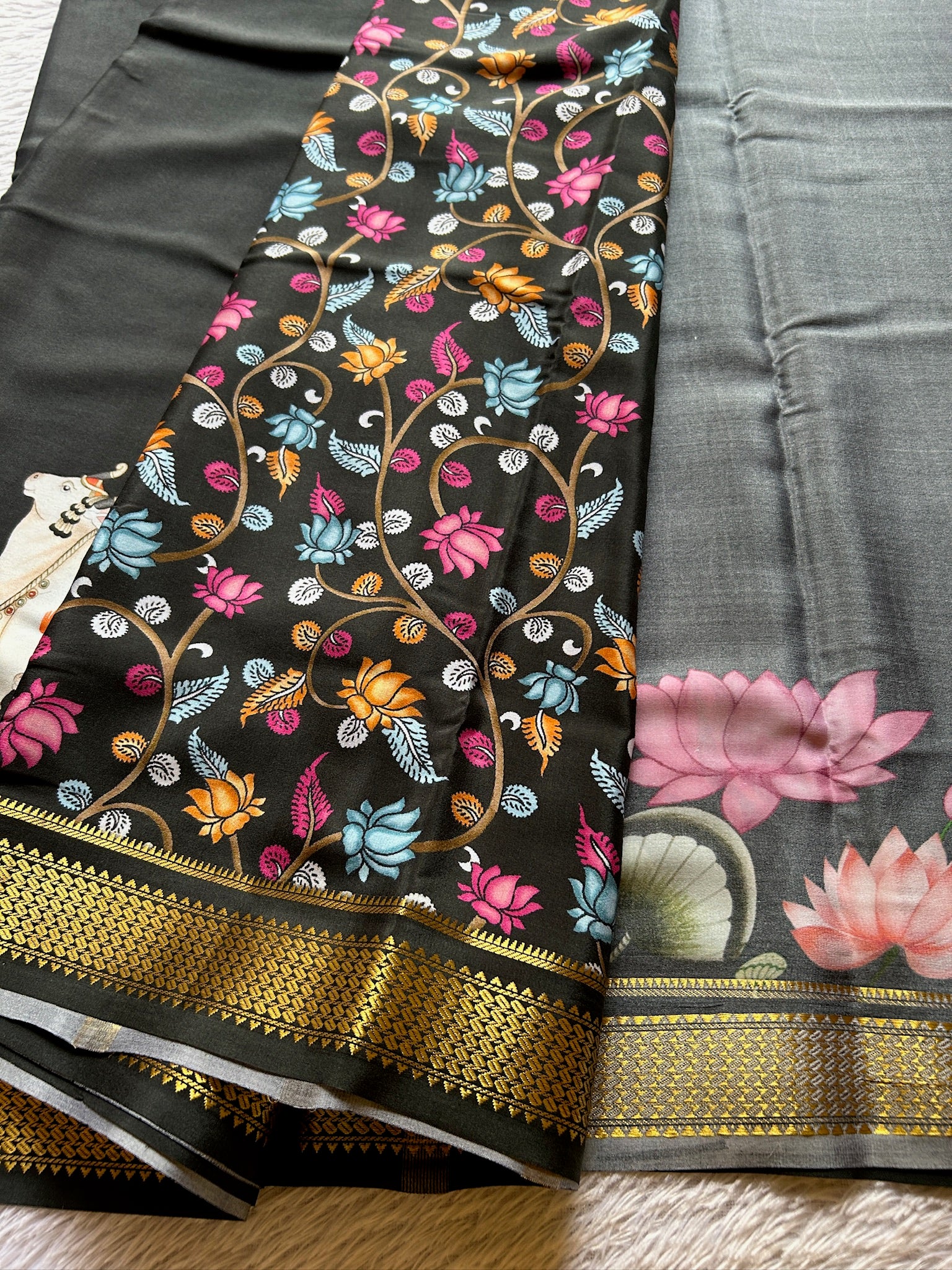 Kasturi presents an exquisite black Mysore silk saree that epitomizes timeless elegance. The fabric's lustrous pure silk construction offers a refined drape and natural sheen characteristic of premium Mysore weaves. A meticulously crafted zari border frames the saree with classical gold threadwork, while an intricate pichwai print adorns the upper portion, adding narrative depth and artistic sophistication. The accompanying printed blouse material complements the saree's design language, ensuring a cohesive ensemble. Ideal for festive occasions and formal celebrations, this piece combines traditional craftsmanship with enduring style.
