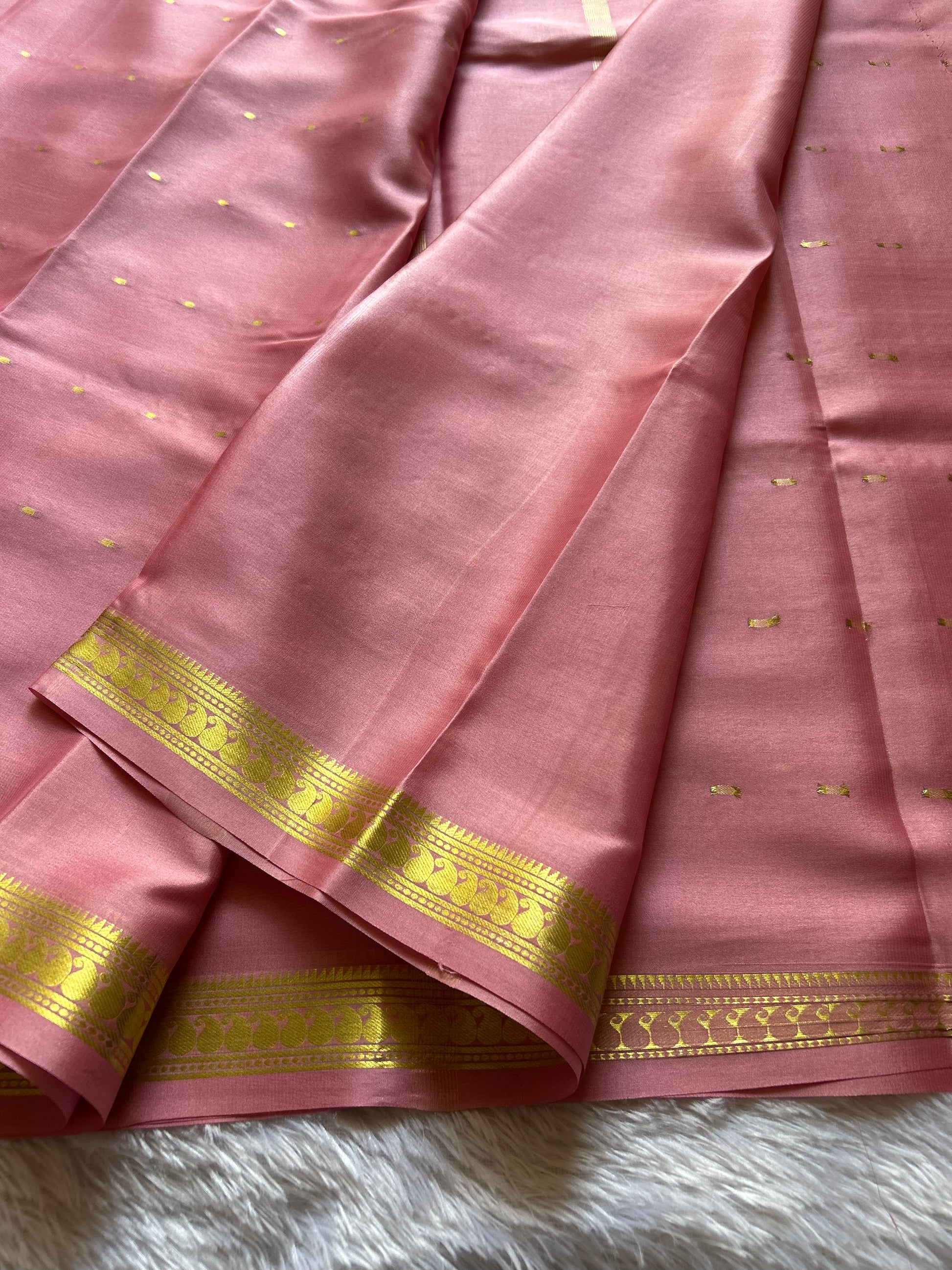 Keerthi showcases the timeless elegance of pure Mysore crepe silk in a sophisticated blush pink hue. This lightweight saree drapes beautifully with natural fluidity, making it ideal for both everyday wear and special occasions. The fabric is adorned with delicate zari buttas scattered throughout, adding subtle sparkle and dimension. The border features exquisite zari work that frames the saree with refined craftsmanship. Perfect for those who appreciate understated luxury and traditional weaving techniques, this piece combines comfort with enduring style.