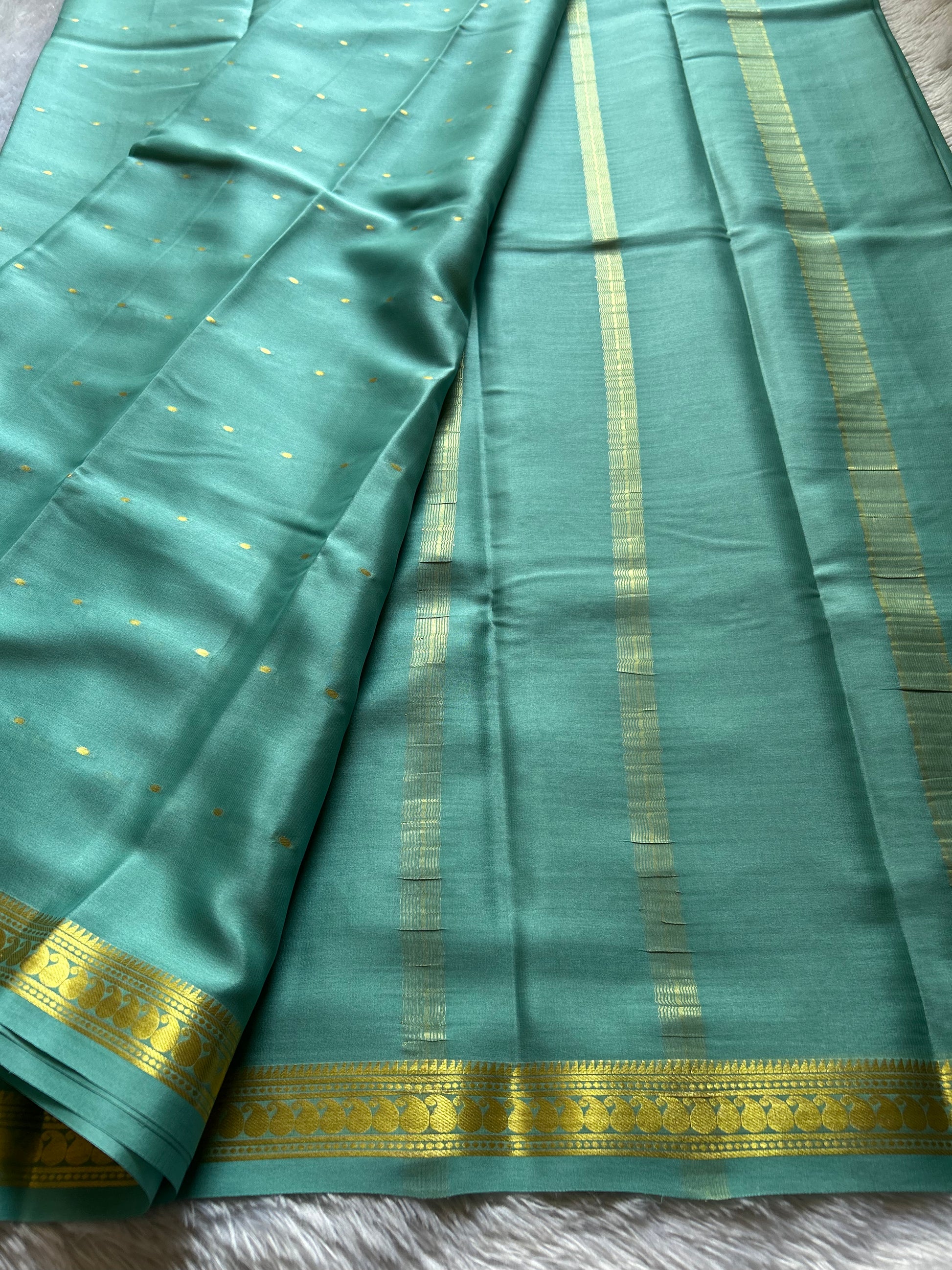 Keerthi showcases the timeless elegance of pure Mysore crepe silk in a serene pastel blue. This lightweight saree drapes beautifully with a fluid, graceful movement that defines traditional craftsmanship. Delicate zari buttas are scattered throughout the fabric, creating subtle sparkle and dimension. The border features exquisite zari work that frames the saree with refined sophistication. Perfect for those who appreciate understated luxury and authentic silk weaving, this piece seamlessly transitions from everyday wear to special occasions.