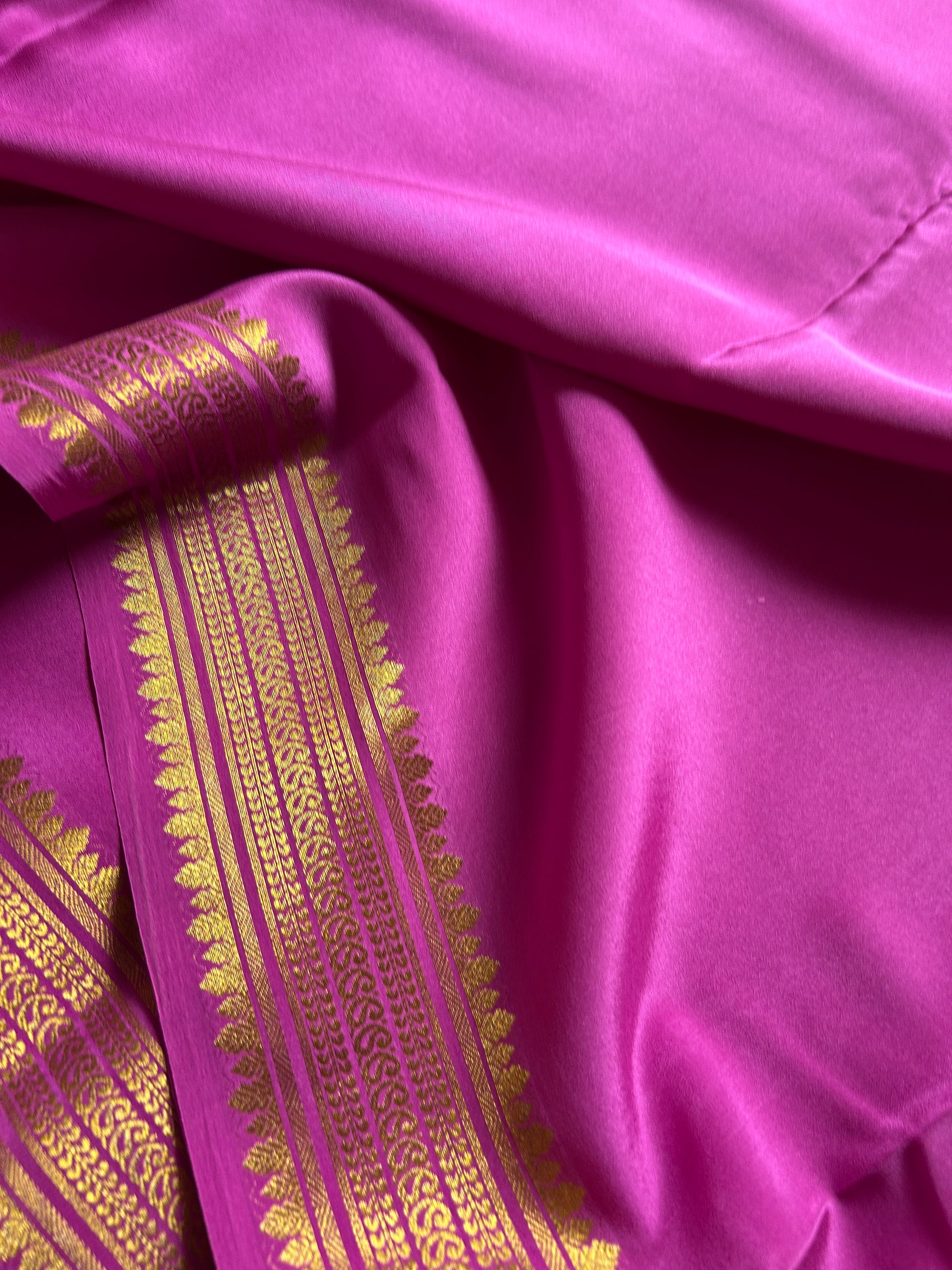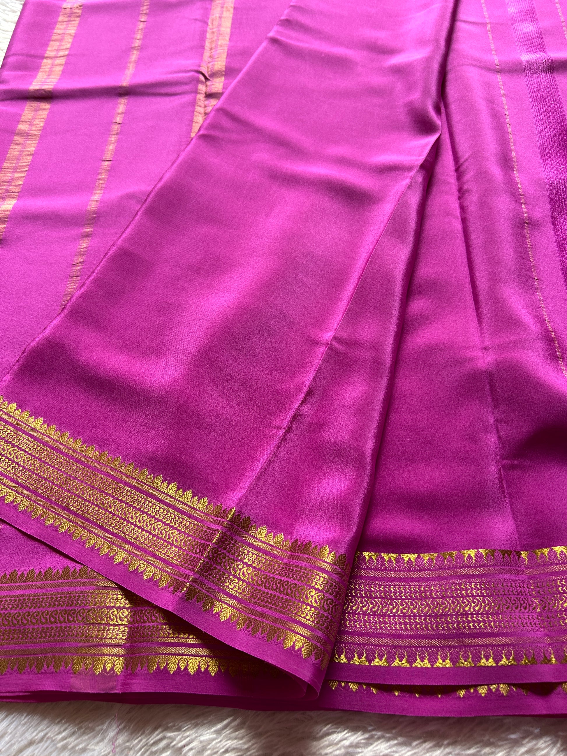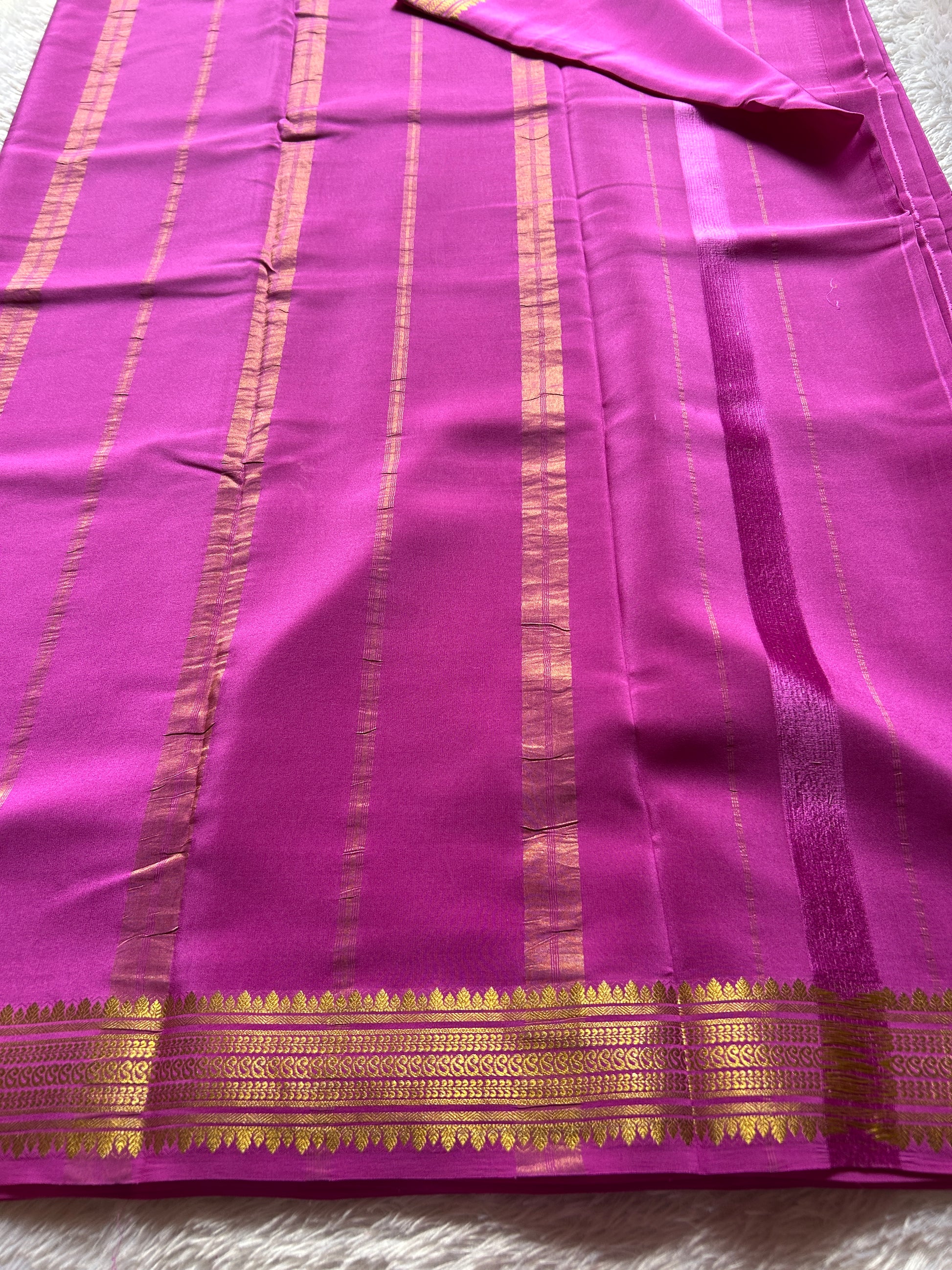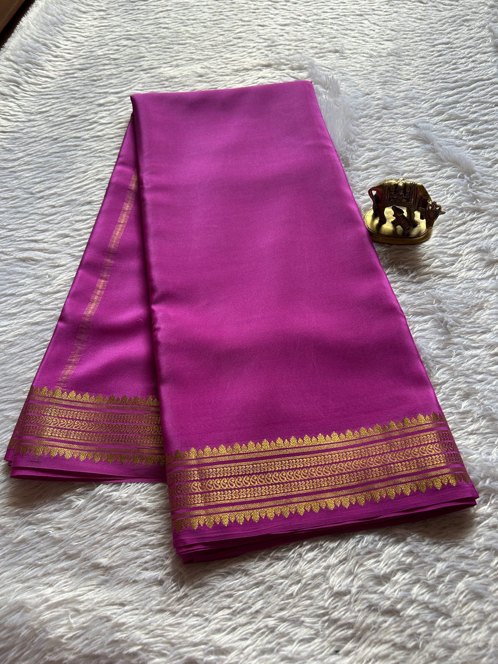 This Komala saree showcases a vibrant bright magenta hue crafted from pure Mysore crepe silk weighing 110 GSM. Featuring a traditional design, it is adorned with a classic zari border, blending timeless elegance with rich craftsmanship. Ideal for occasions that call for authentic sophistication and graceful drape, this saree promises comfort and refined style.