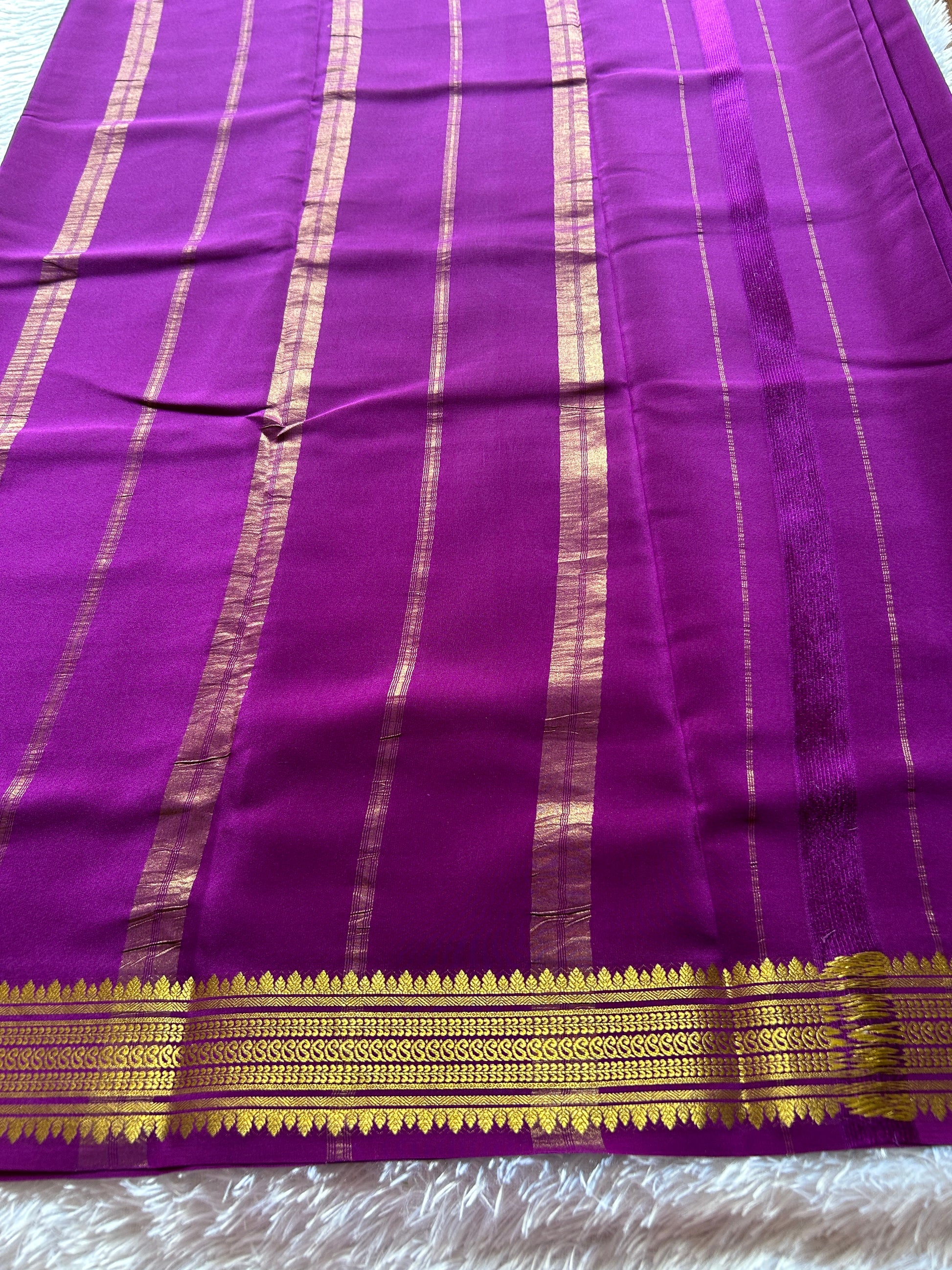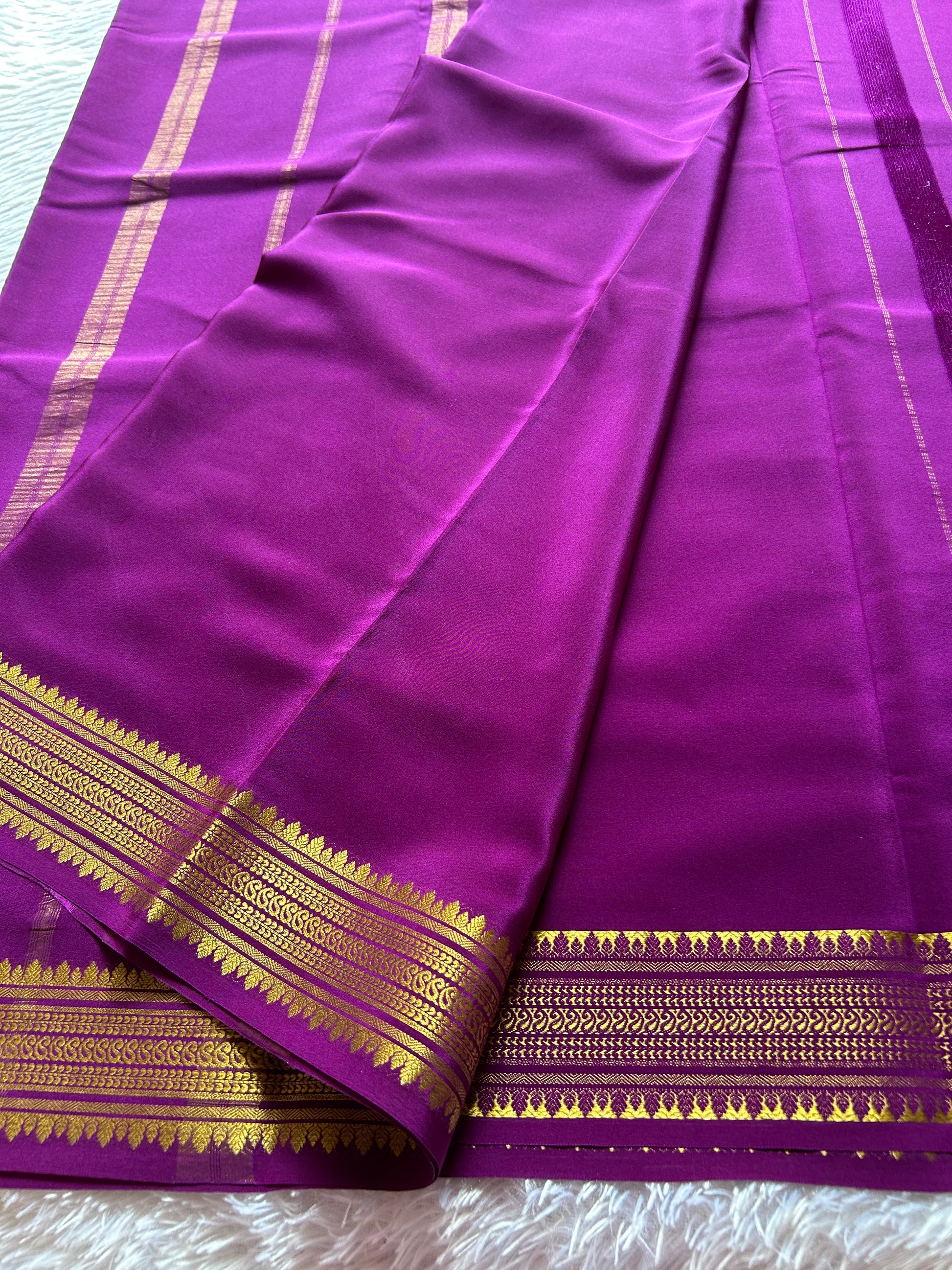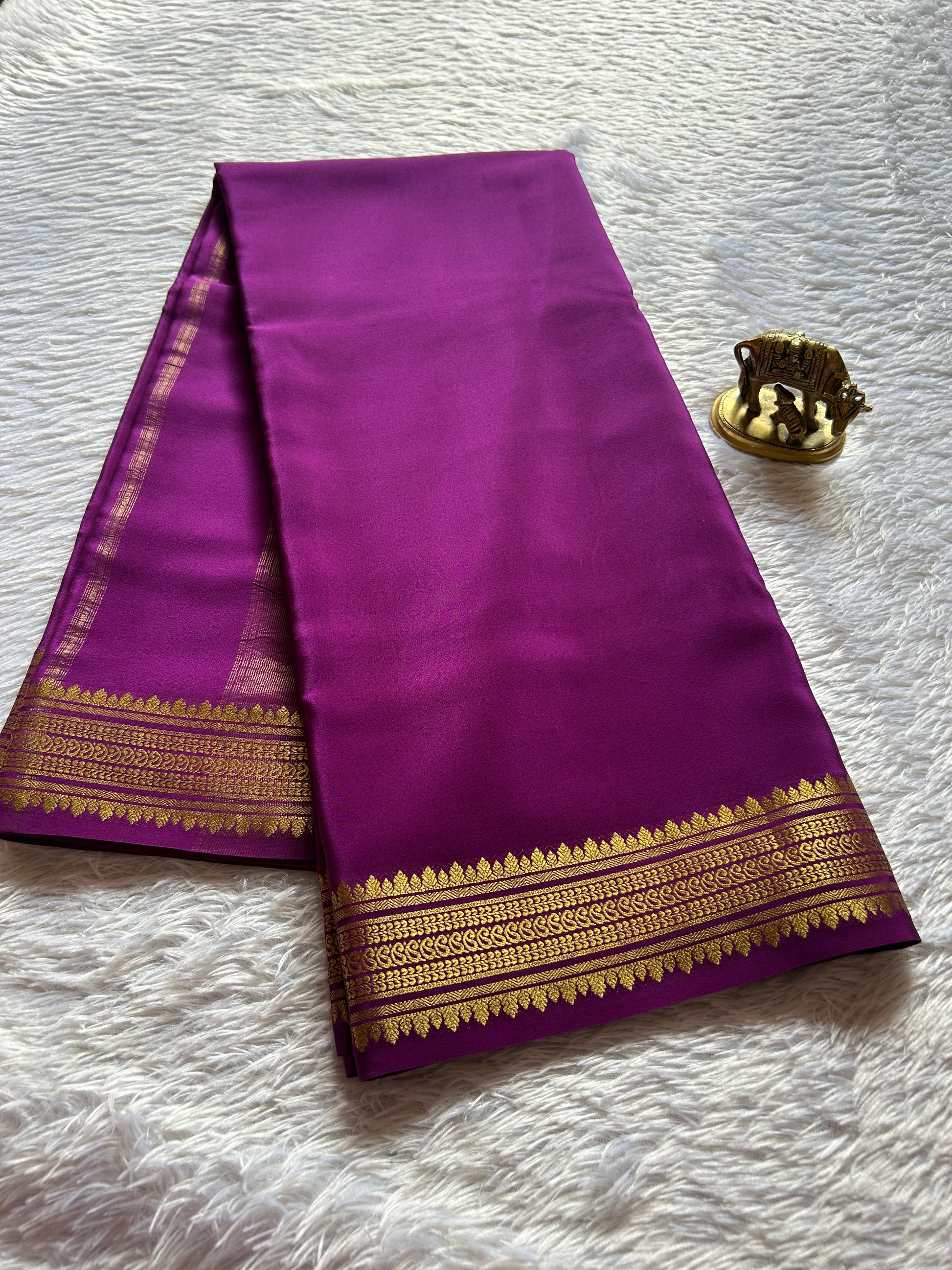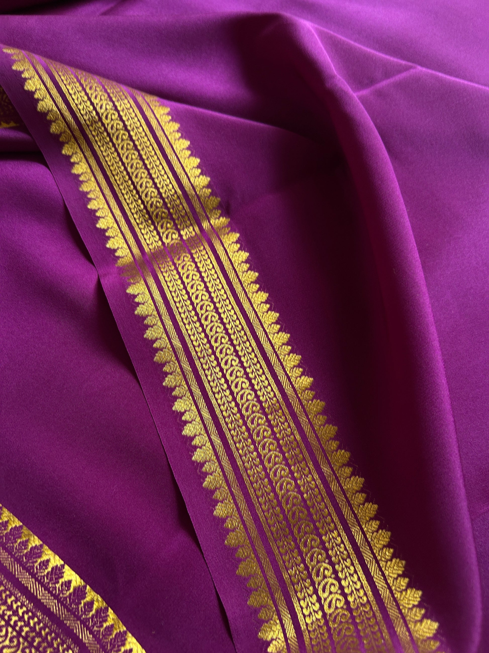 This Komala solid magenta saree is crafted from pure Mysore crepe silk weighing 110 GSM, ensuring a luxurious yet comfortable drape. Its traditional charm is elevated by a classic zari border, combining timeless elegance with authentic craftsmanship. Ideal for formal occasions, this saree offers a rich texture and subtle sheen that reflects expert artistry.