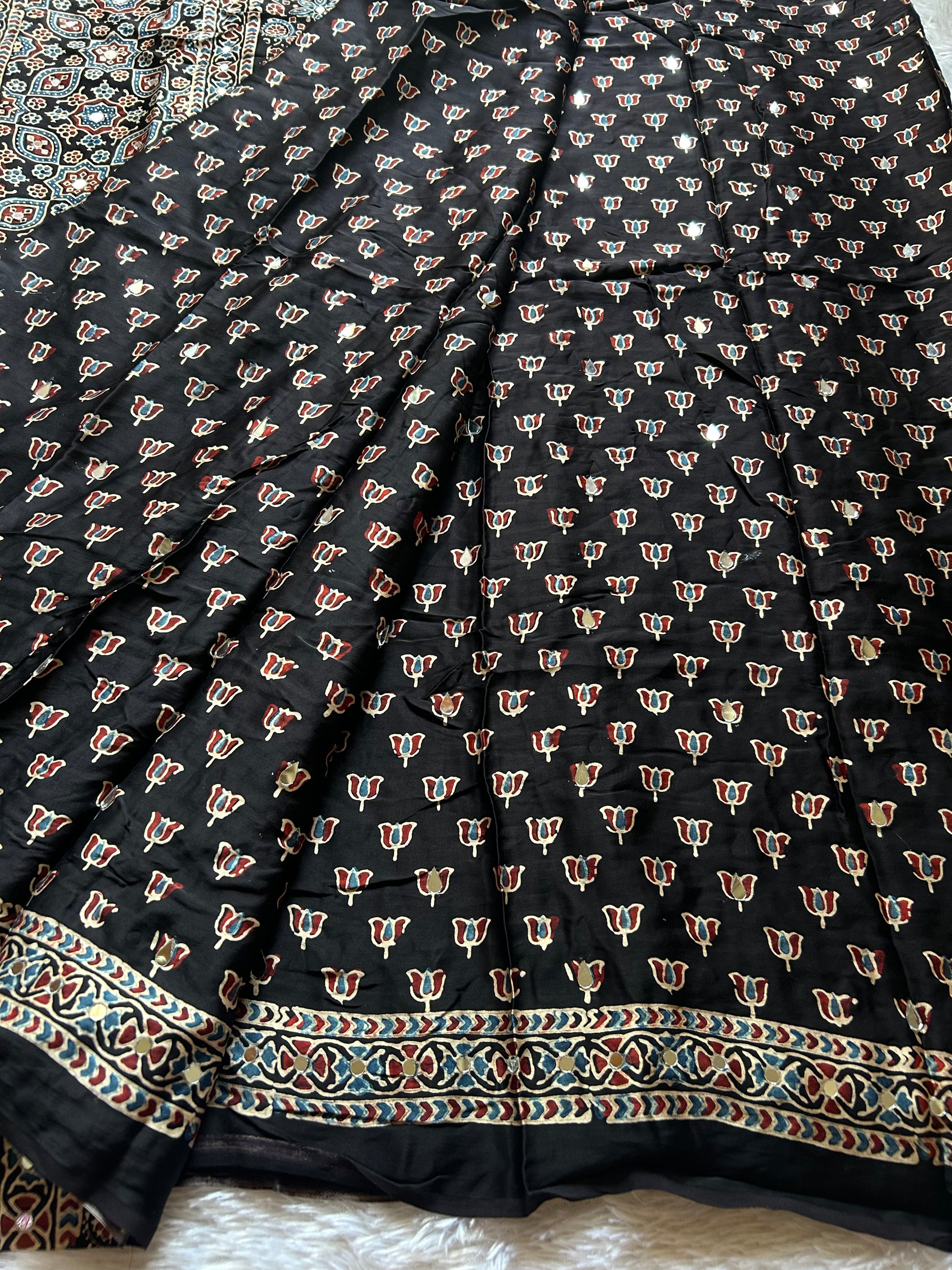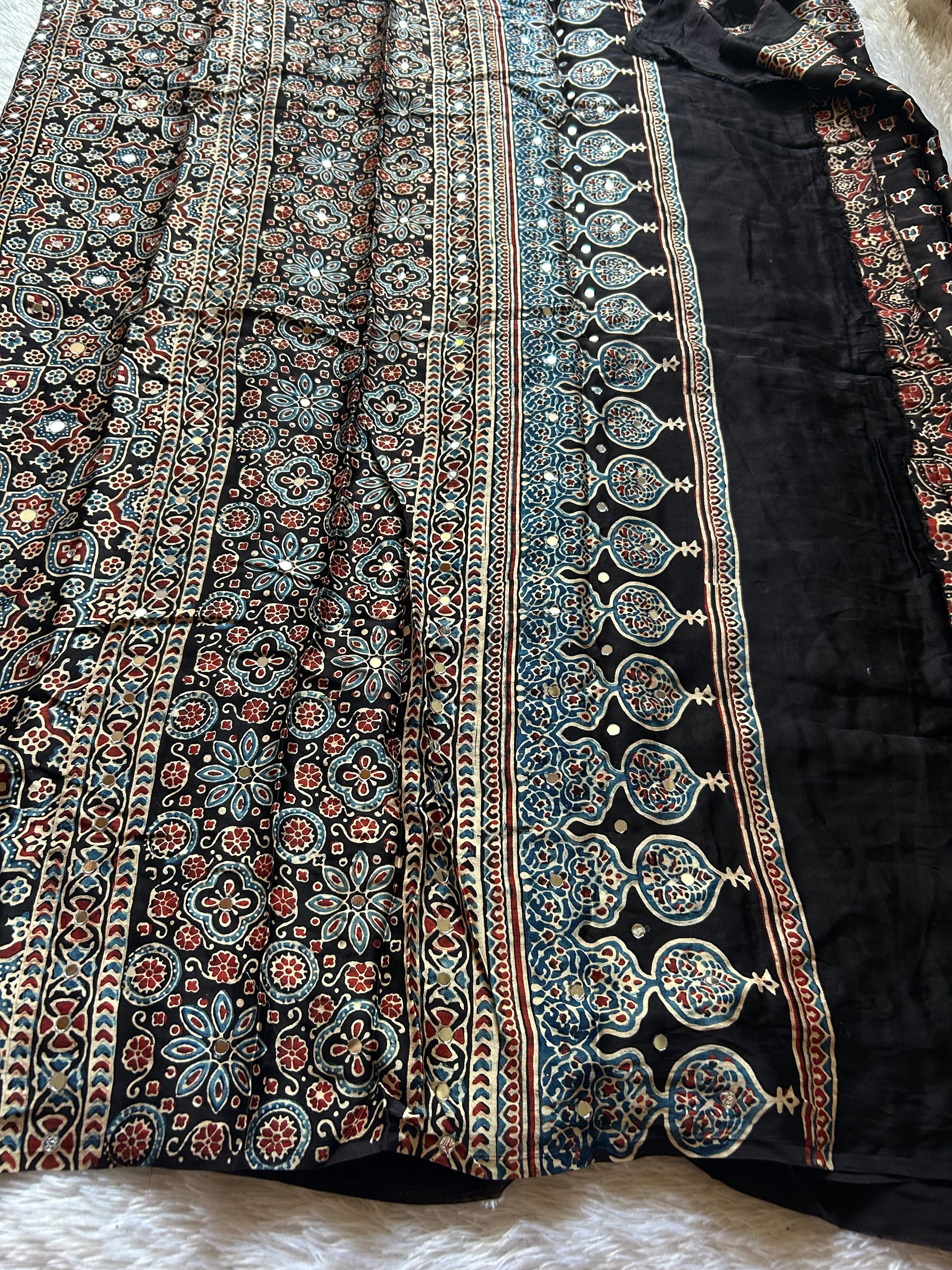 Kushee presents an elegant black modal silk saree with hand block Ajrakh prints and natural dyes that seamlessly blends comfort with sophistication. The fabric drapes beautifully while maintaining its soft, luxurious feel against the skin. An intricate floral print and scattered mirror embellishment adorns the entire saree, creating visual depth and movement. The multicolored printed border and pallu add a striking contrast, elevating the overall aesthetic with carefully curated hues that complement the black base. The accompanying printed blouse material matches the saree's design language, ensuring a cohesive, polished look. Ideal for both festive occasions and refined everyday wear, this piece exemplifies contemporary saree styling with traditional craftsmanship.
