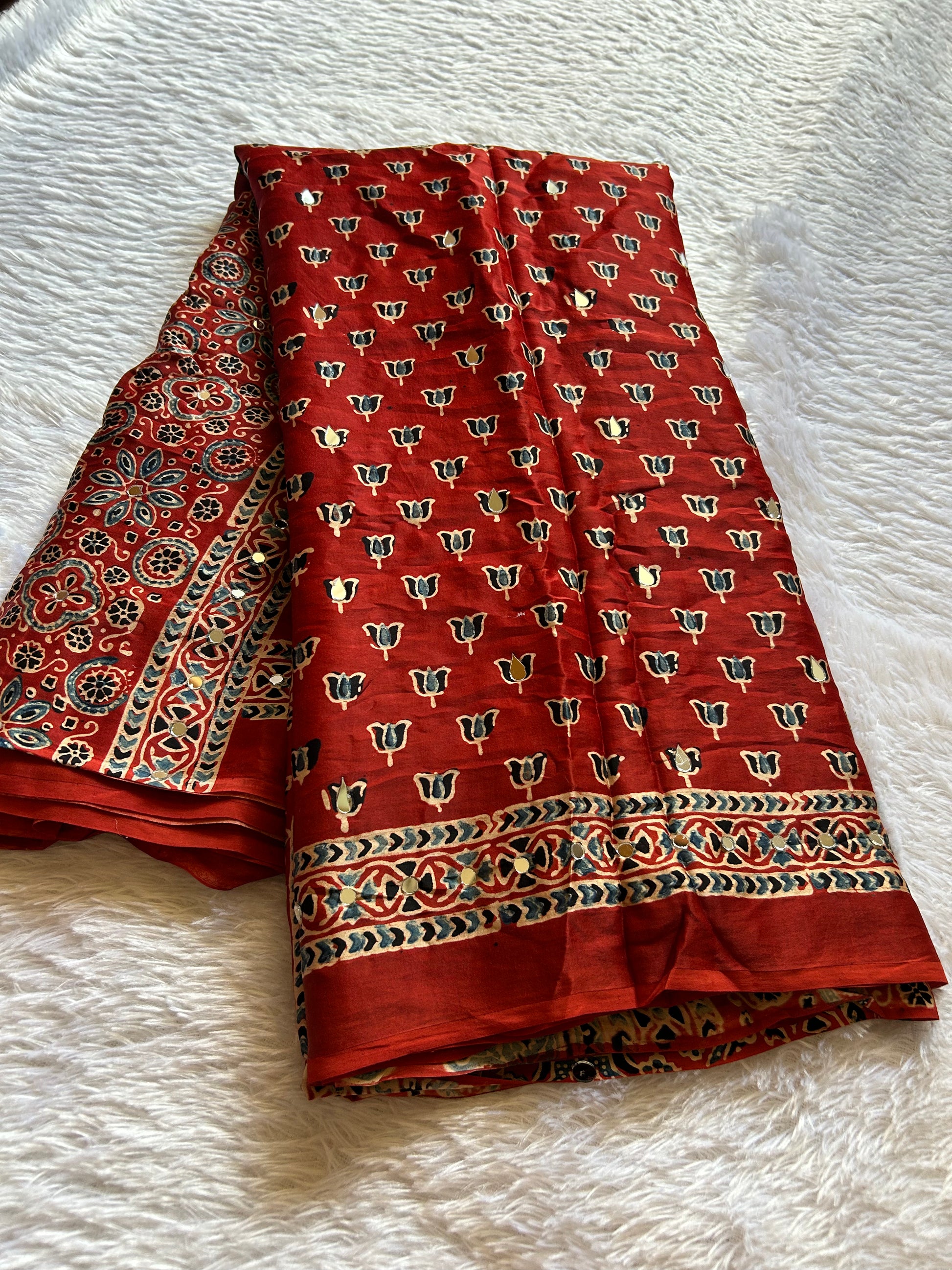 Discover timeless elegance with this rust red modal silk saree with hand block Ajrakh prints and natural dyes, designed for the discerning wearer. Soft and fluid modal silk forms the foundation, adorned with a vibrant colorful floral motif scattered throughout the fabric. Strategically placed mirror work adds luminous accents that catch light beautifully, enhancing the overall aesthetic. The multi-hued printed border and pallu showcase intricate detailing that frames your silhouette gracefully. Complemented by a matching printed blouse piece, this saree offers a complete, coordinated look. The breathable modal composition ensures comfort without compromising on sophistication, making it perfect for both traditional gatherings and contemporary celebrations where refined taste meets modern sensibility.