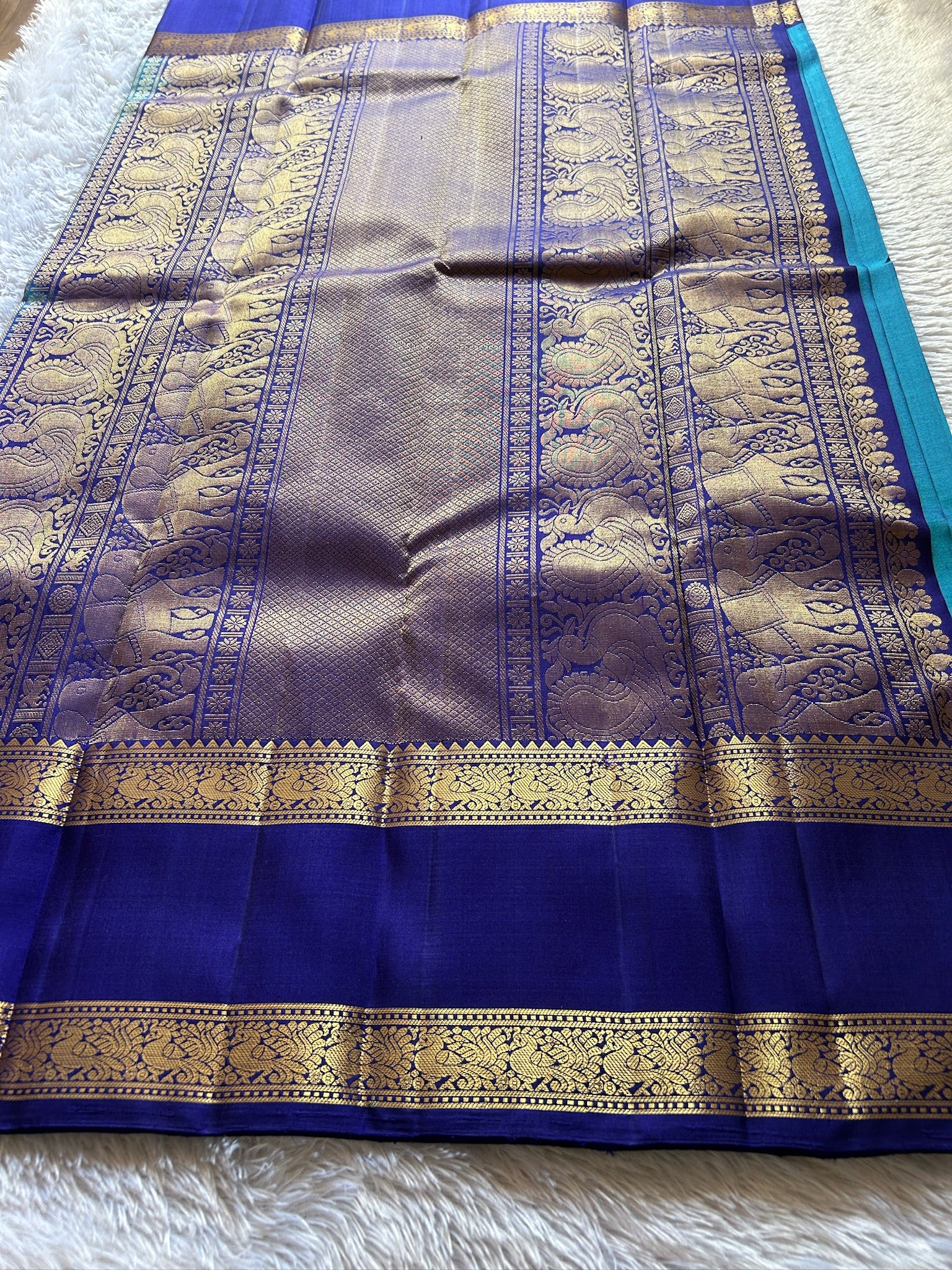Expertly crafted in the weaving town of Kancheepuram, the Lakshmi saree is a luxurious addition to any wardrobe. Made from pure soft silk, its blue hue is enhanced by intricate peacock buttas. The rich dark blue border, adorned with zari peacock motifs, adds a touch of elegance.