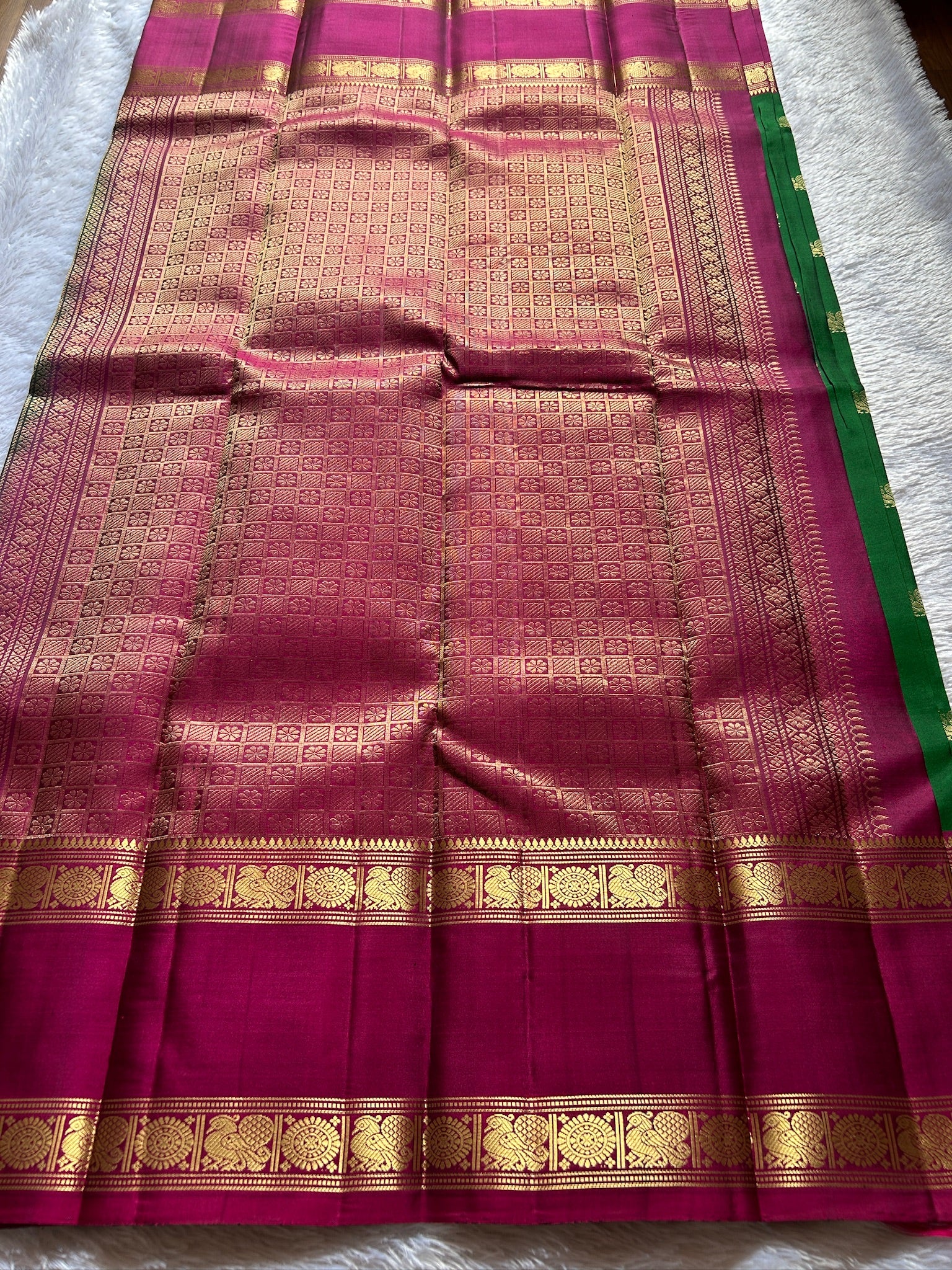 Expertly crafted from pure Kancheepuram silk, our Lakshmi saree boasts a stunning bottle green color with peacock buttas all over. The contrast magents bentex border is adorned with zari peacock motifs, adding a touch of elegance to this traditional saree. Handmade with expertise, this saree is a must-have for any special occasion.