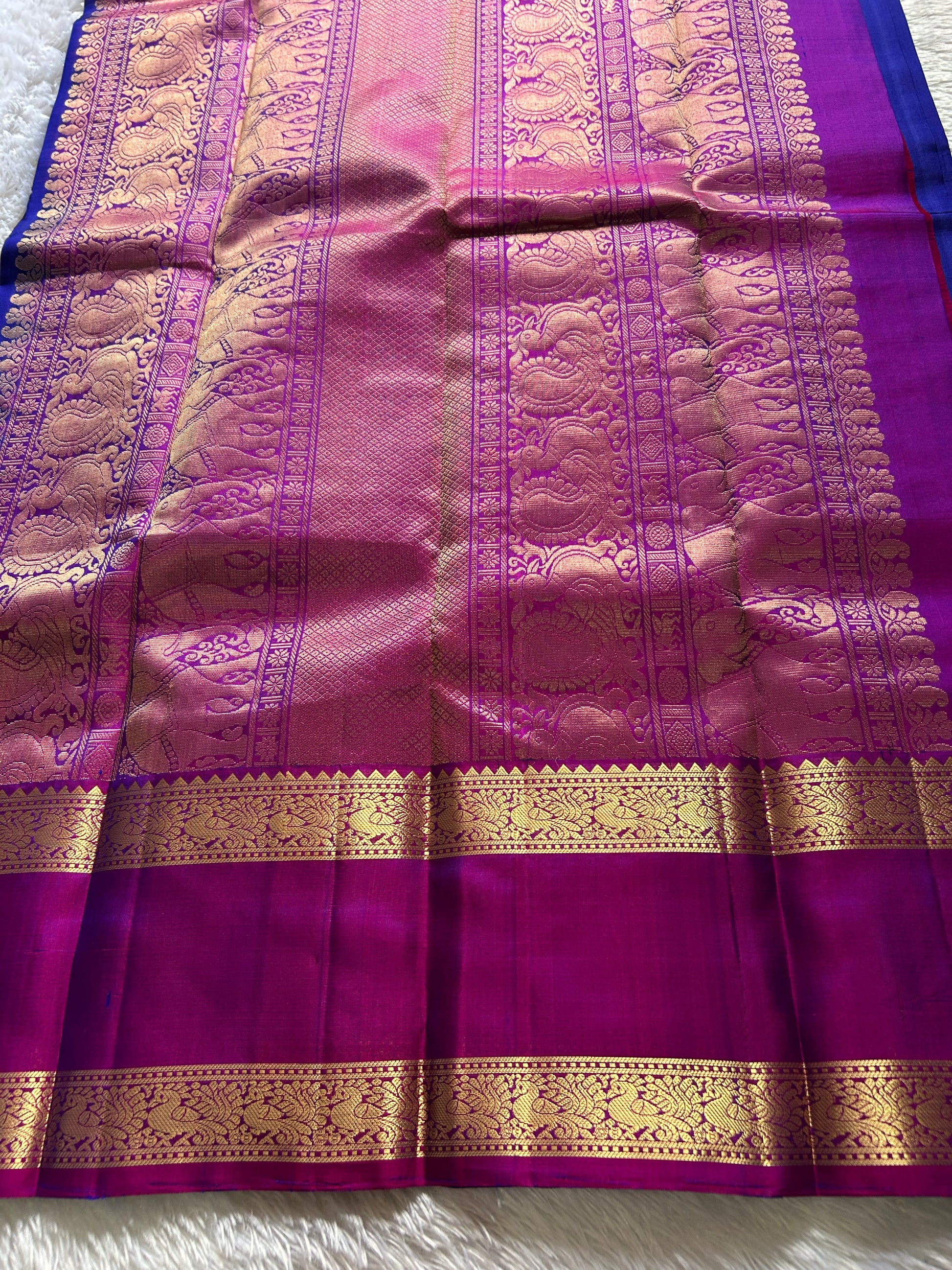 Expertly crafted in the weaving town of Kancheepuram, the Lakshmi saree is a luxurious addition to any wardrobe. Made from pure soft silk, its blue hue is enhanced by intricate peacock buttas. The rich magenta border, adorned with zari peacock motifs, adds a touch of elegance.