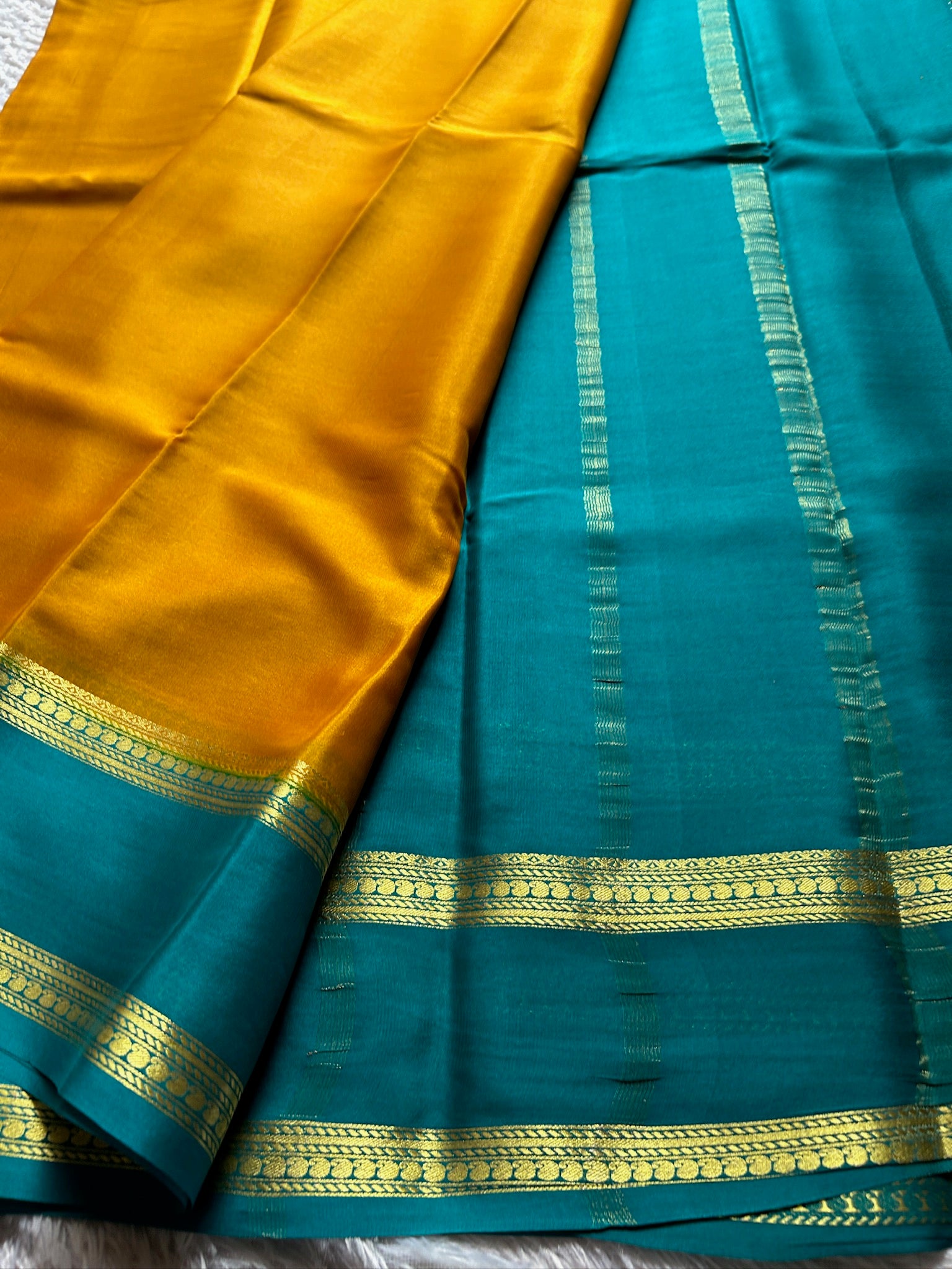 This saree features a beautiful combination of yellow and blue, with a traditional border. Made from light weight and pure crepe silk, it offers both elegance and comfort. Perfect for any occasion, this saree adds a touch of luxury to your wardrobe