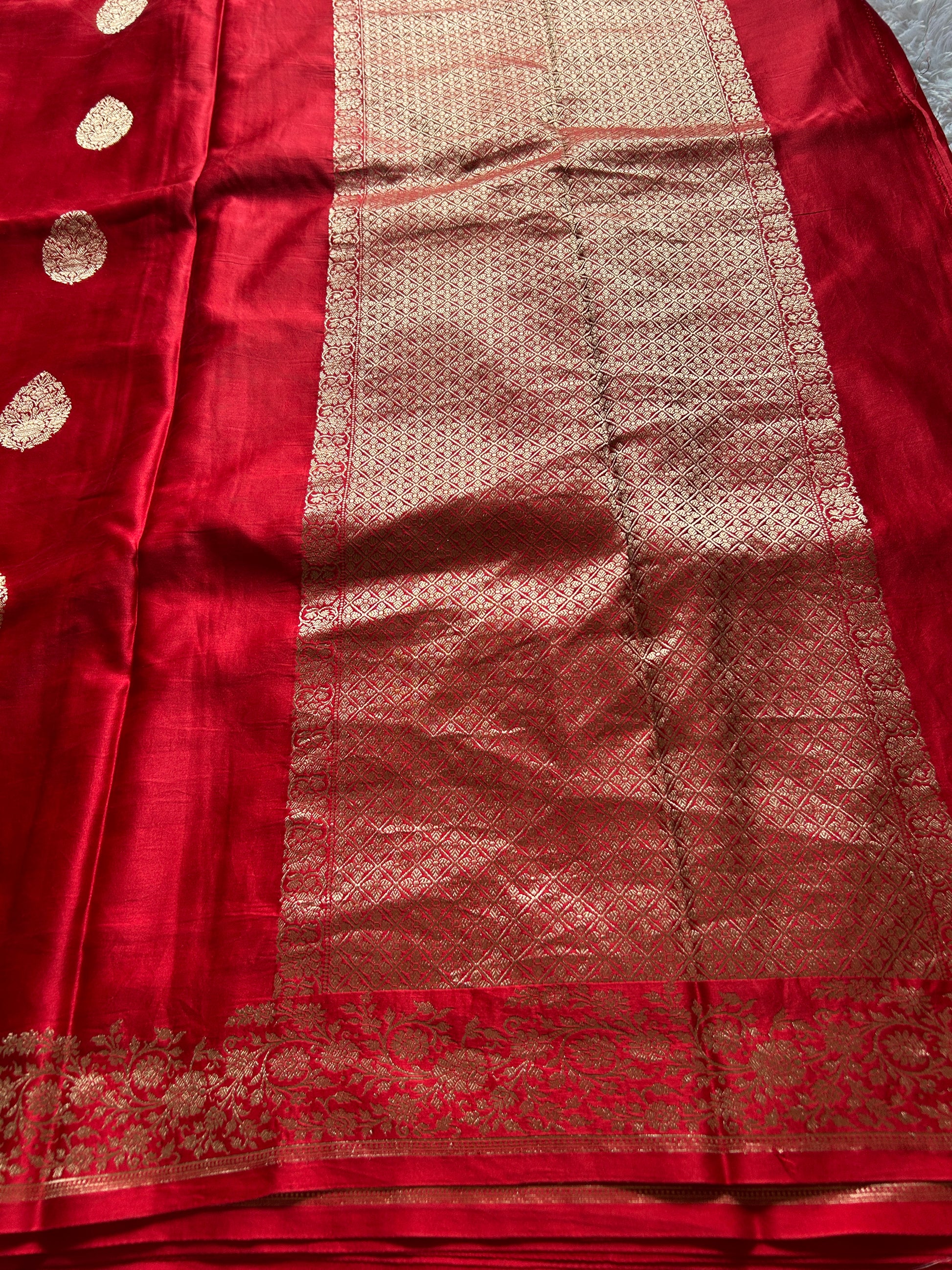 Madhubala captures timeless elegance in lustrous red pure handloom Banarasi satin silk. Intricate zari buttas grace the entire fabric, while a traditional Banarasi zari border frames the pallu with authentic craftsmanship. The accompanying contrast green blouse piece, adorned with delicate zari stripes, completes this sophisticated ensemble. Perfect for weddings, celebrations, and special occasions, this saree exemplifies the refined artistry of Varanasi's master weavers. A wardrobe treasure that transcends trends.
