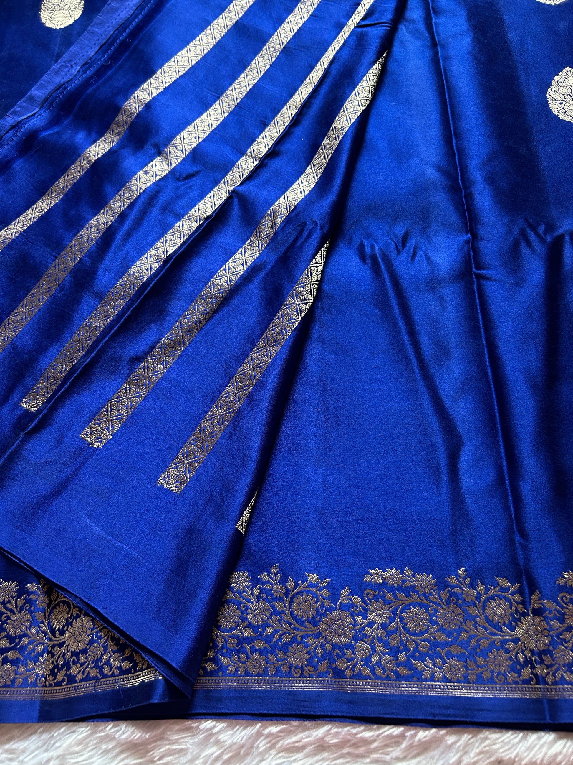 Madhubala captures timeless elegance in pure handloom Banarasi satin silk. This sapphire blue saree features exquisite zari buttas scattered across the fabric, complemented by a traditional Banarasi zari border that exemplifies authentic craftsmanship. The luxurious satin silk drapes beautifully, offering a sophisticated sheen that enhances the intricate detailing. Paired with a coordinating navy blue blouse material adorned with delicate zari stripes, this saree is ideal for weddings, celebrations, and formal occasions. A masterpiece for those who appreciate refined, heritage-inspired textiles.