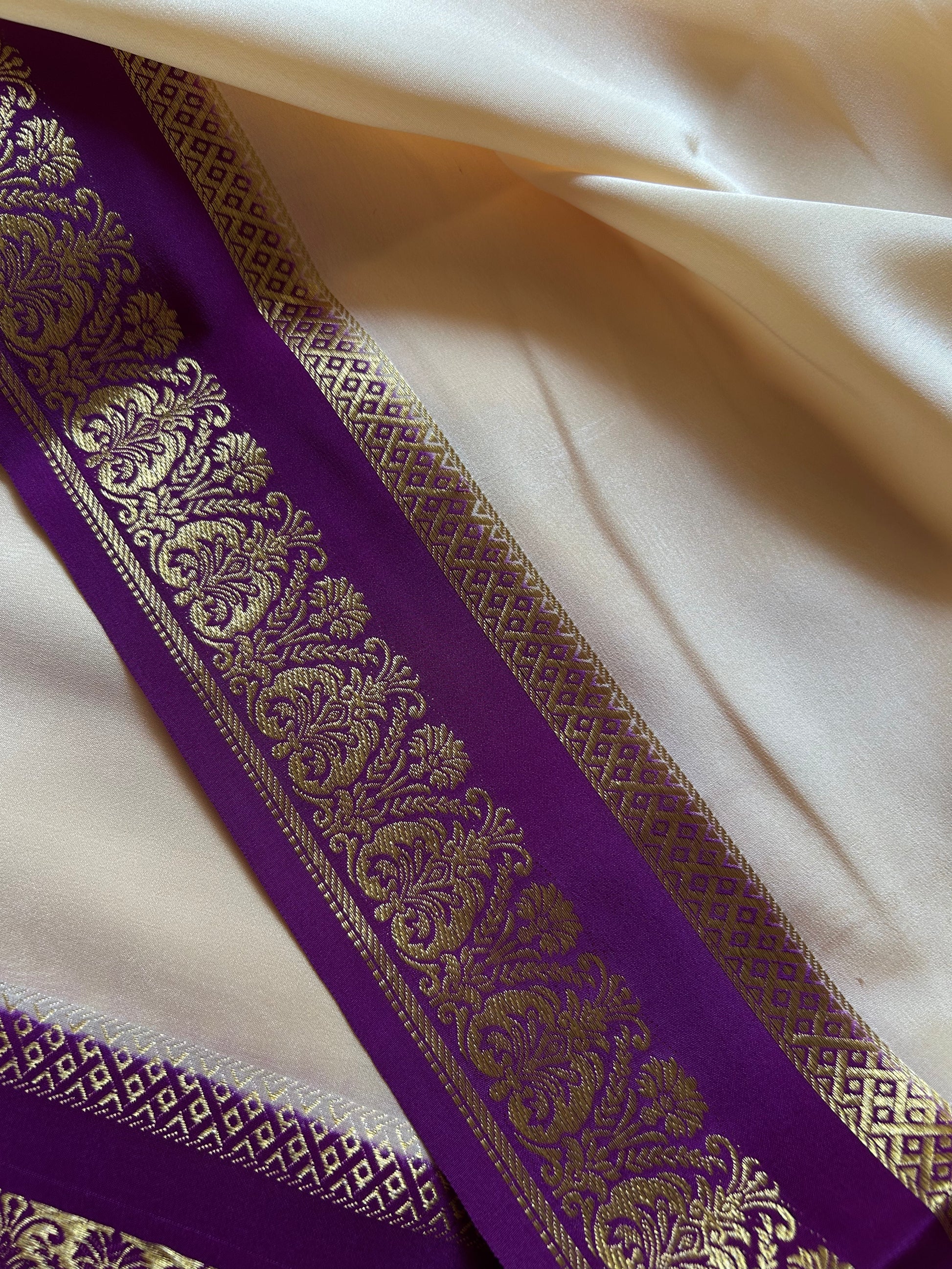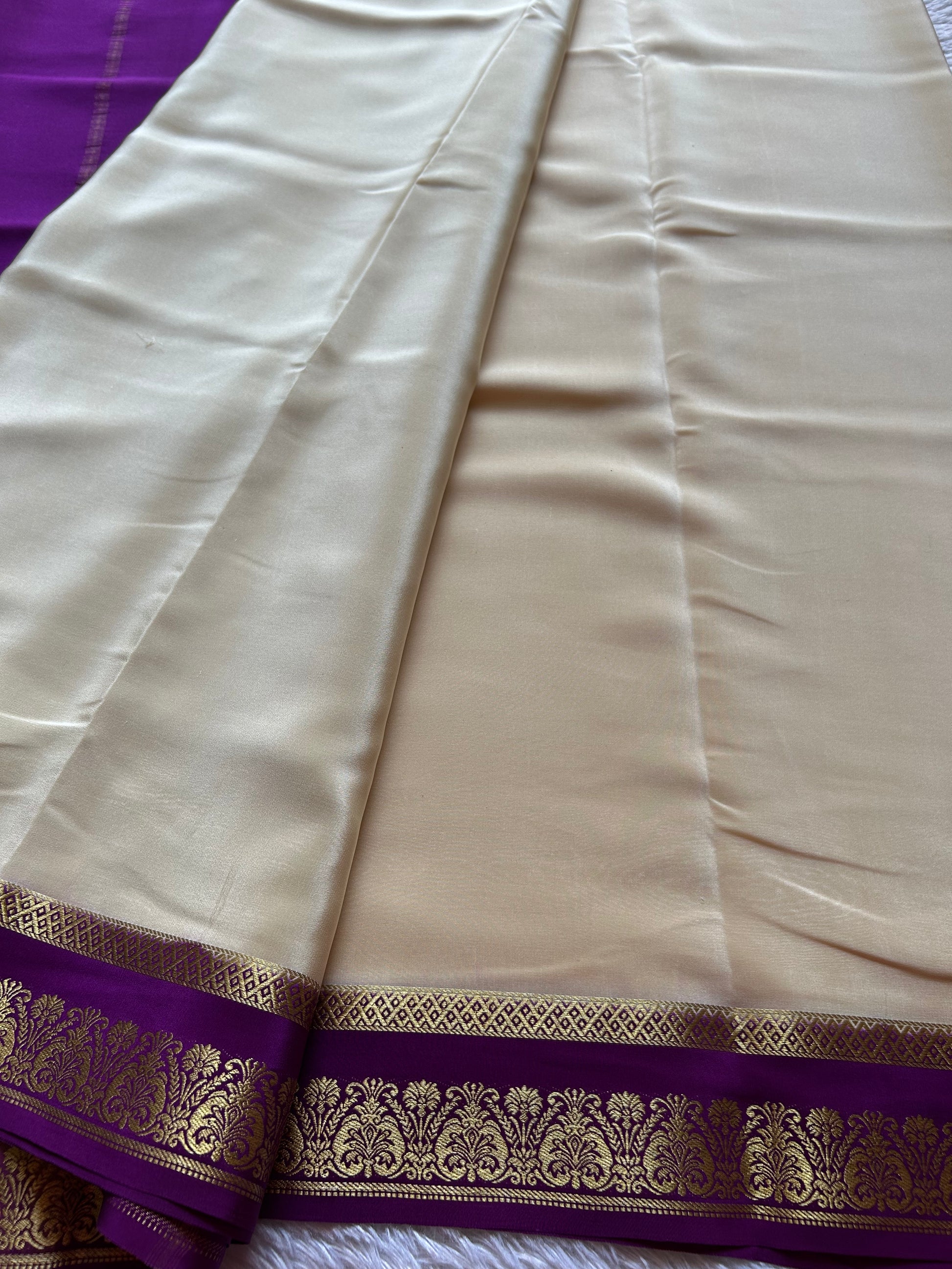 Embrace timeless elegance with this off-white Mysore crepe silk saree, adorned with lustrous copper and silver silk zari work. The magenta classic border features exquisite CSS zari detailing that adds a touch of sophistication to every drape. Crafted from pure silk, this saree combines traditional craftsmanship with refined aesthetics, making it perfect for weddings, festivals, and special occasions. The striking contrast between the soft off-white base and vibrant magenta border creates a versatile piece that complements various skin tones and personal styles.