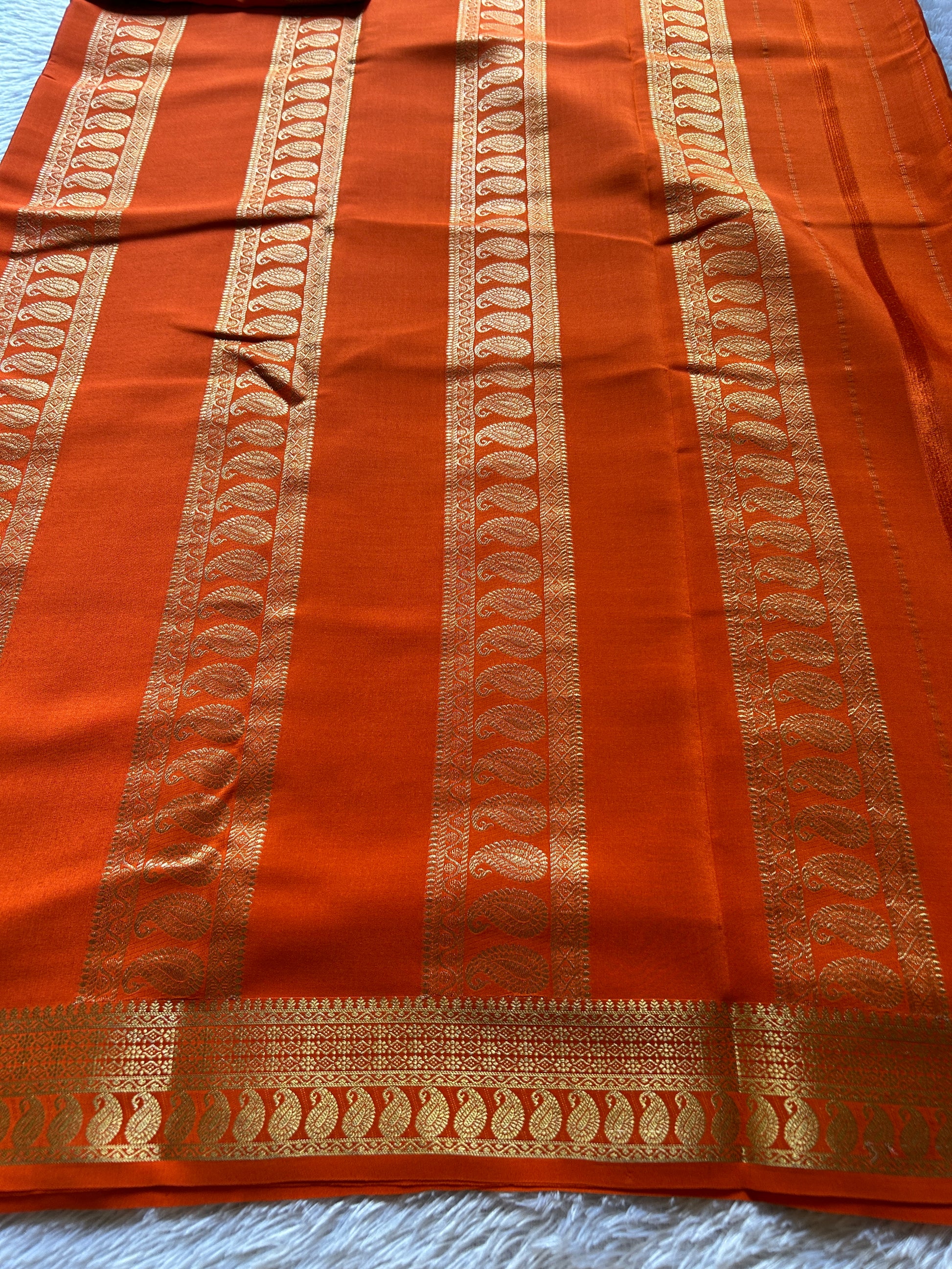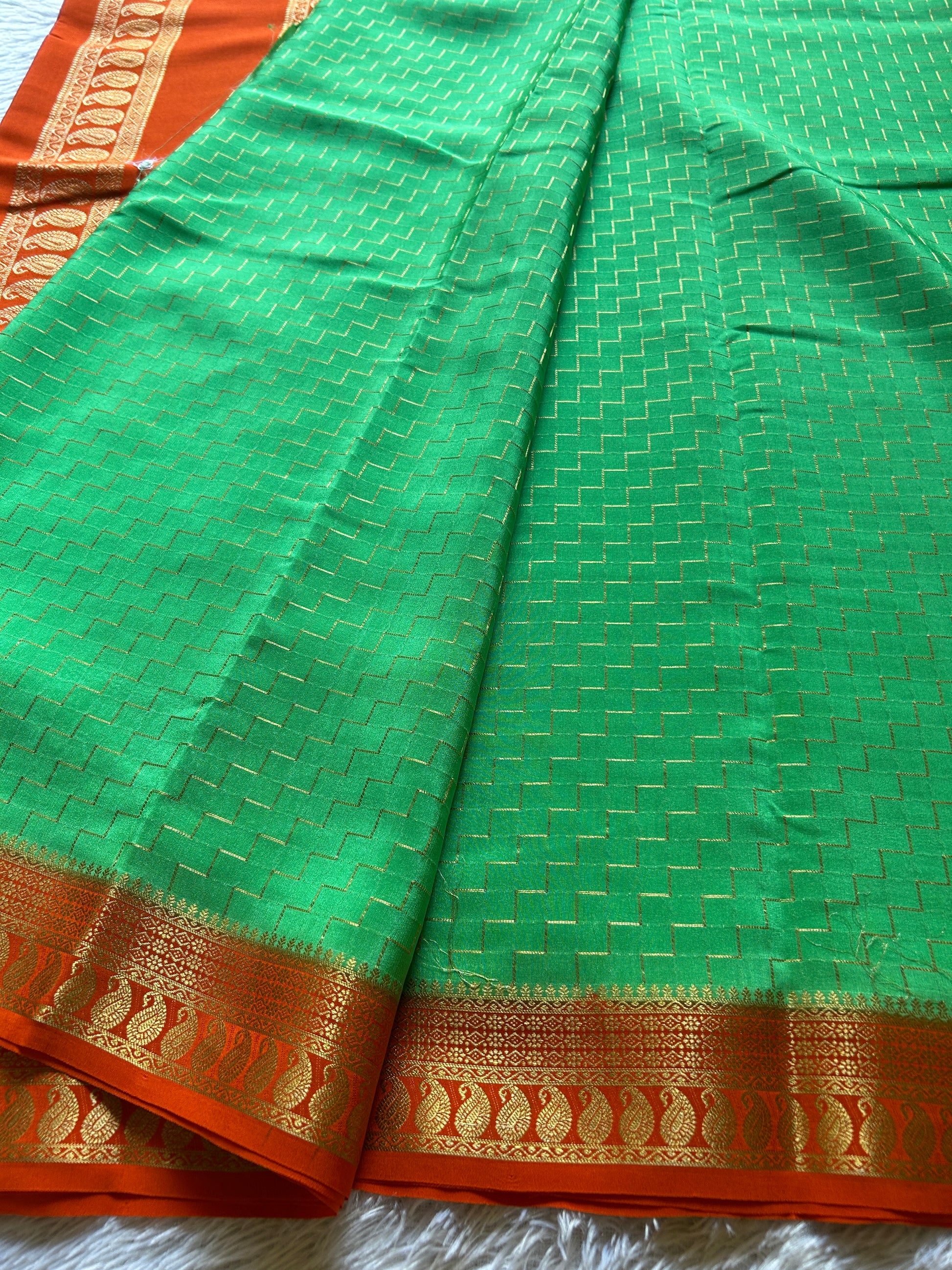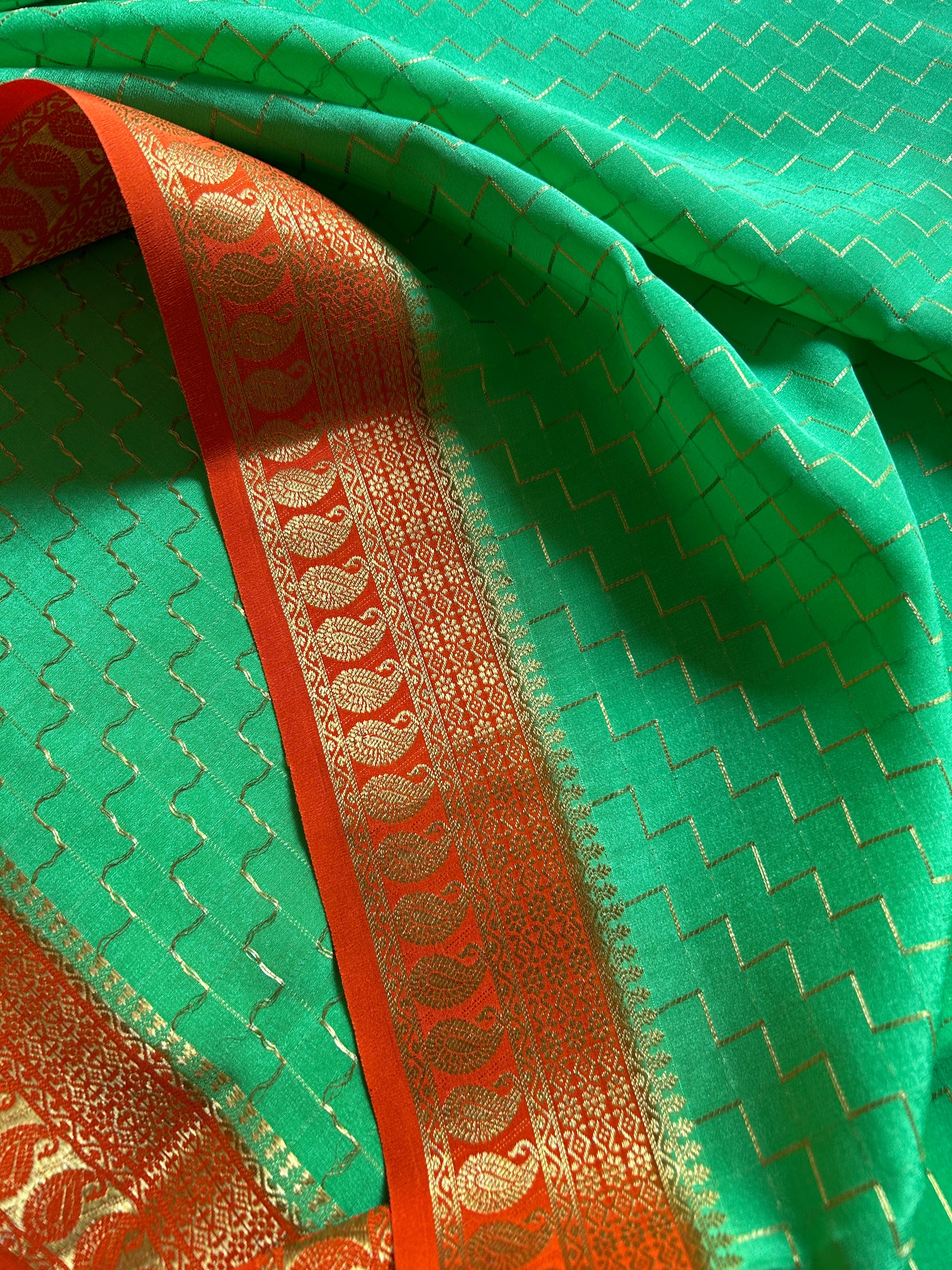 Mahima (2D) showcases the timeless elegance of pure Mysore crepe silk in a striking aquamarine hue. Crafted with a refined 110 GSM weight, this saree features intricate zig-zag copper silver silk (CSS) zari lines that traverse the entire fabric, creating a mesmerizing geometric pattern. The vibrant orange border and pallu are adorned with exquisite CSS zari mango motifs, adding traditional grandeur to contemporary design. The interplay of turquoise and orange creates a sophisticated color palette, while the copper silver zari work catches light beautifully. Perfect for festive occasions and celebrations, this saree combines luxurious fabric quality with detailed craftsmanship, making it an investment piece for the discerning wearer.