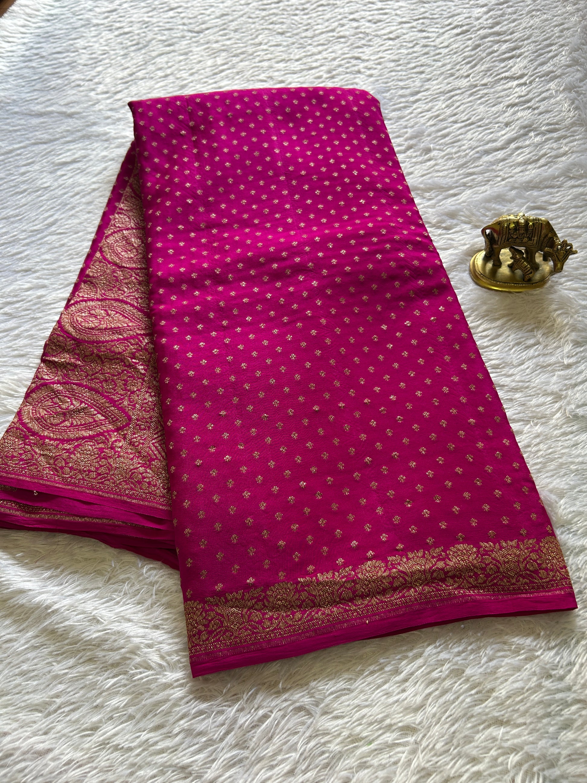 Mahiya showcases a luminous bright pink Banarasi crepe silk saree that epitomizes timeless elegance. Delicate zari buttas are scattered across the fabric, creating subtle dimension and movement. The saree features an intricate zari-embellished border and pallu that command attention with their meticulous craftsmanship. Paired with a designer blouse piece adorned with comprehensive zari work, this ensemble delivers sophisticated versatility for both festive occasions and refined celebrations. The crepe silk construction ensures graceful draping while maintaining structural integrity throughout wear.